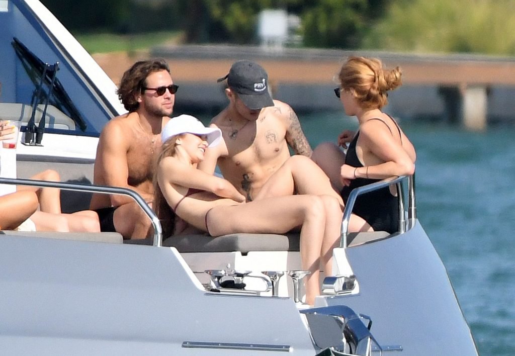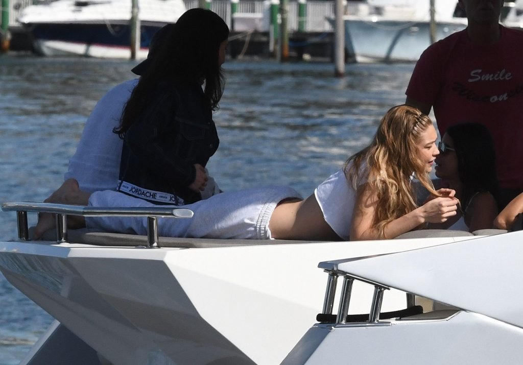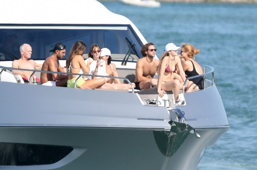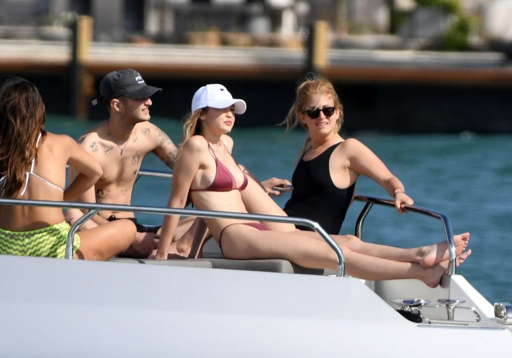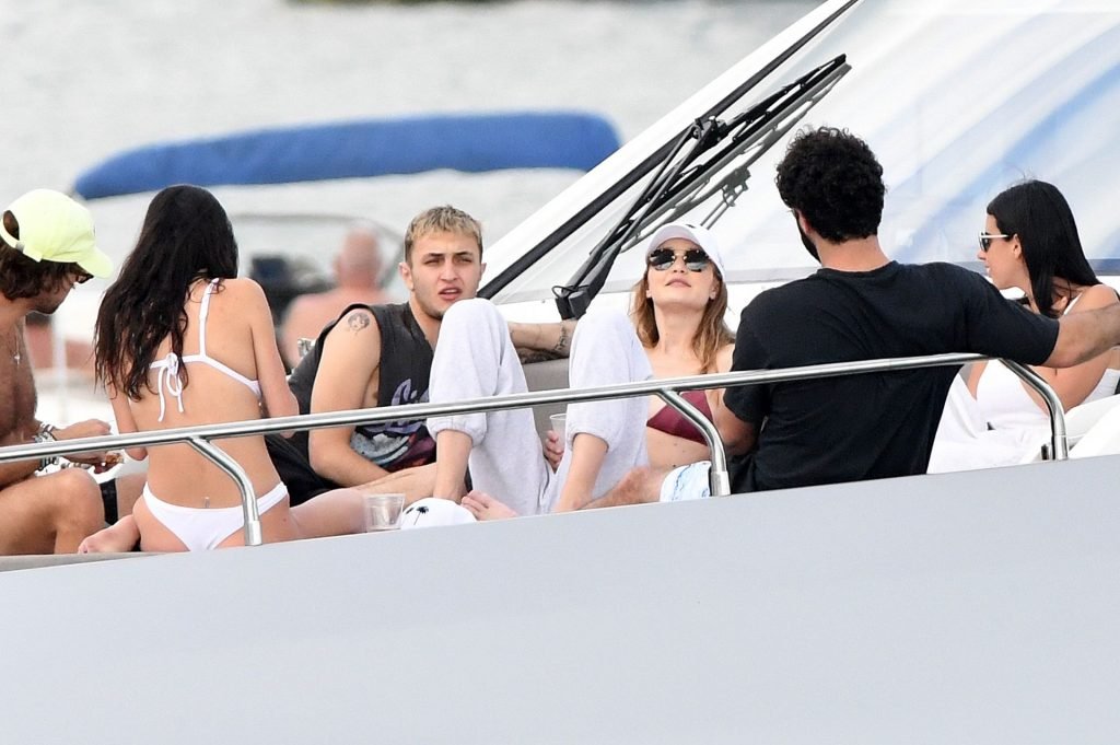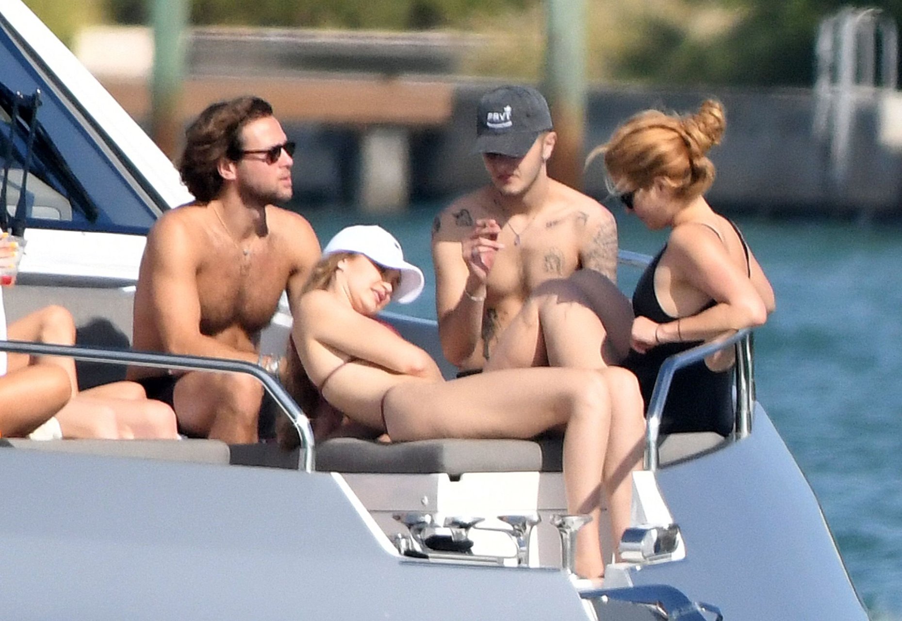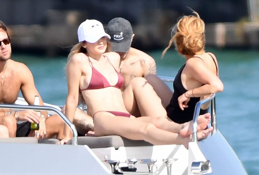 Model Gigi Hadid (23) é vista usando um biquíni vinho enquanto navega em um iate com o irmão Anwar Hadid e alguns amigos em Miami, 25/11/2018.