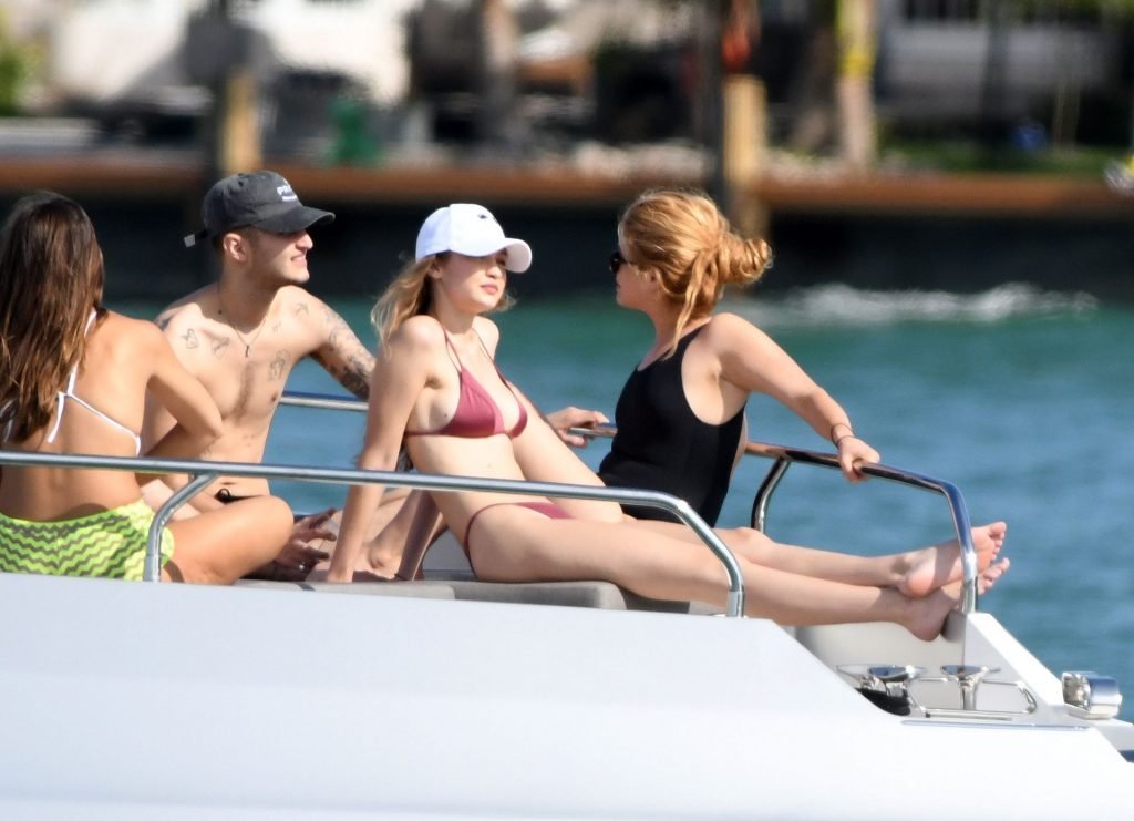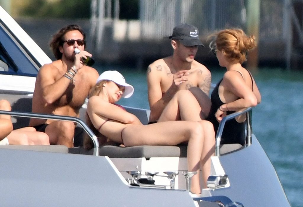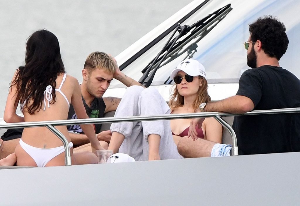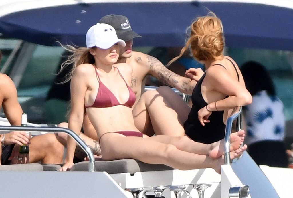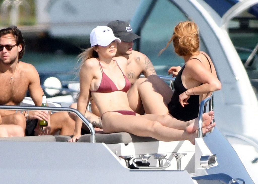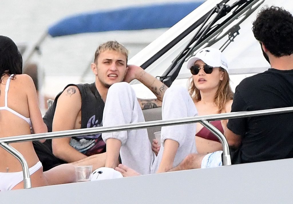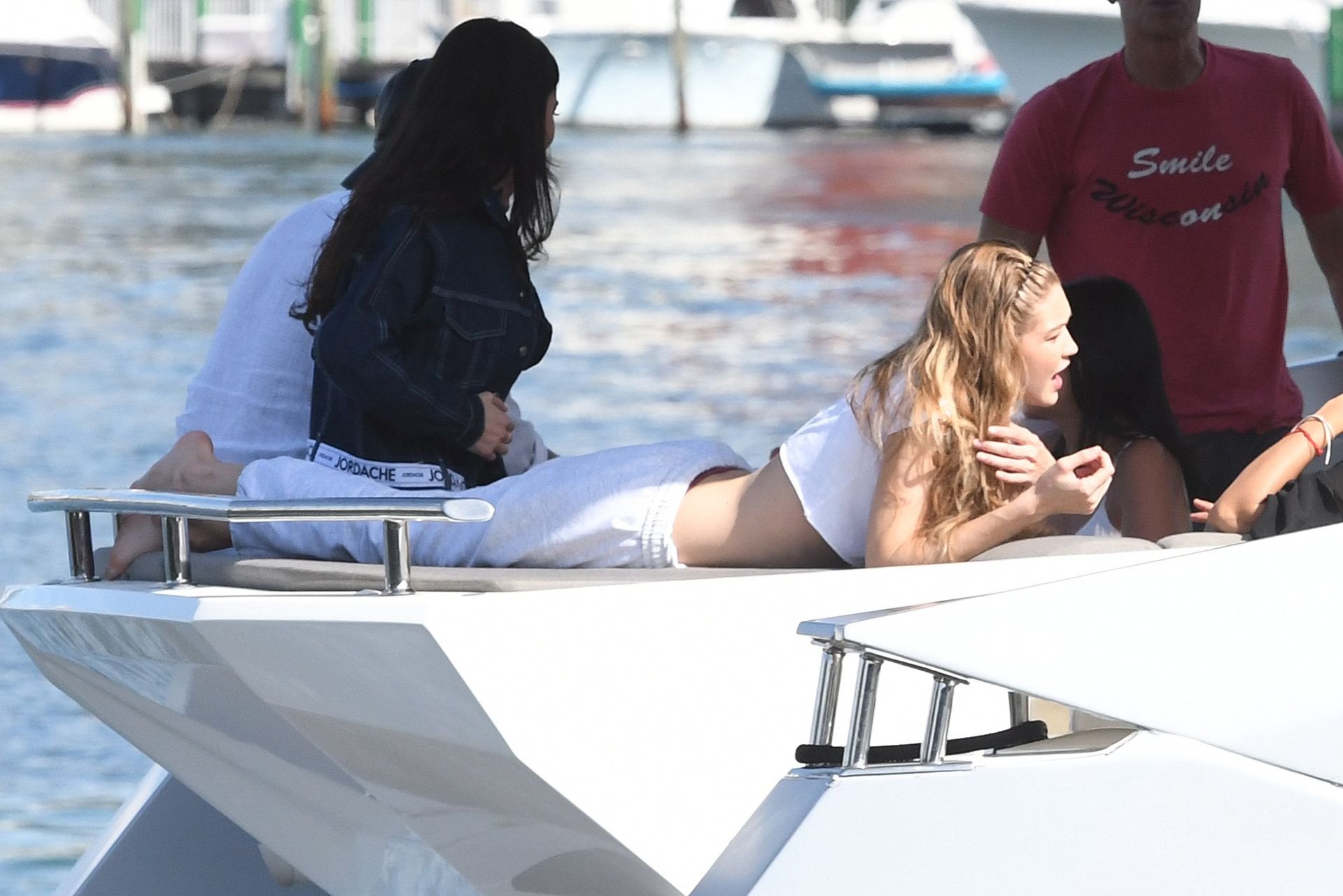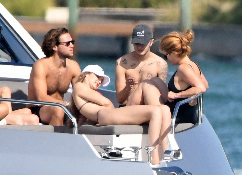Model Gigi Hadid (23) é vista usando um biquíni vinho enquanto navega em um iate com o irmão Anwar Hadid e alguns amigos em Miami, 25/11/2018.