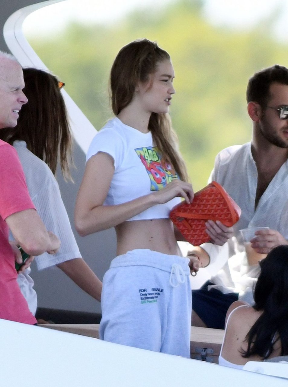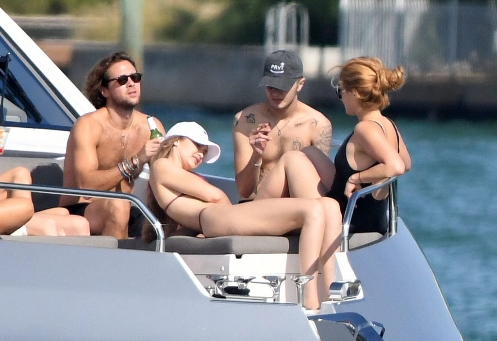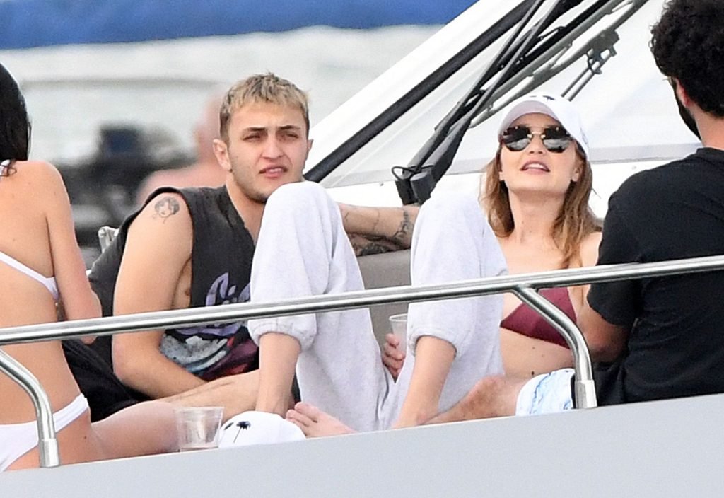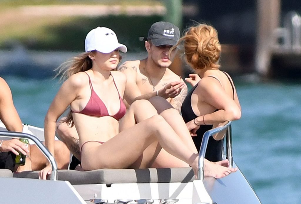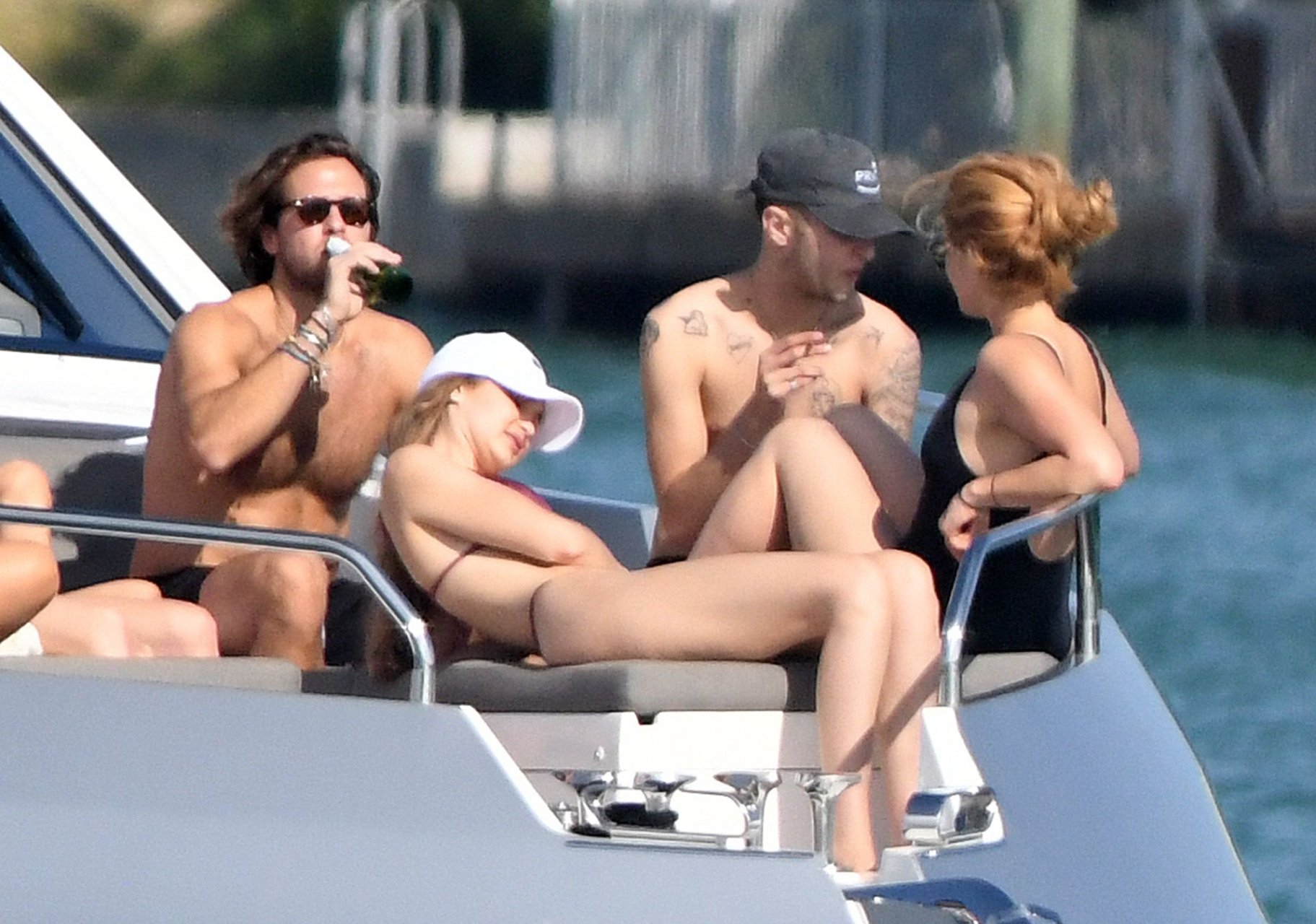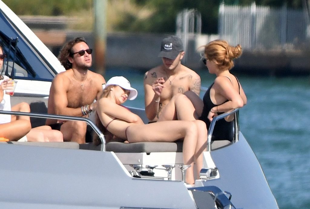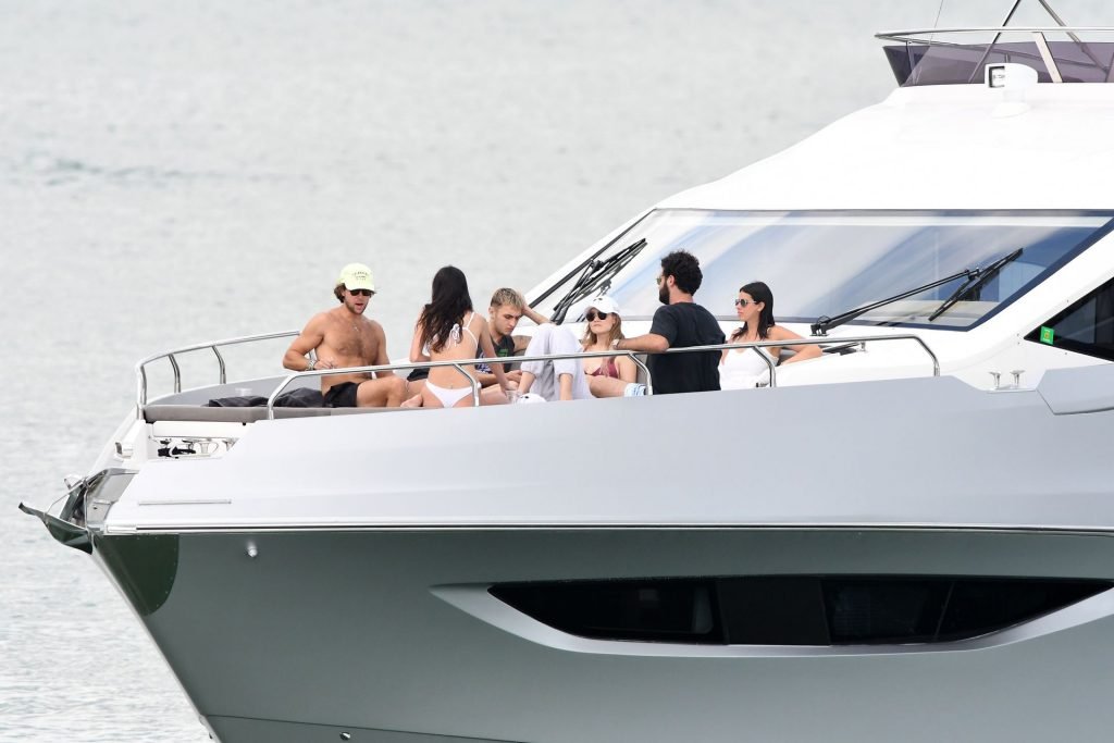 Model Gigi Hadid (23) é vista usando um biquíni vinho enquanto navega em um iate com o irmão Anwar Hadid e alguns amigos em Miami, 25/11/2018.