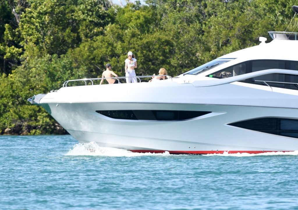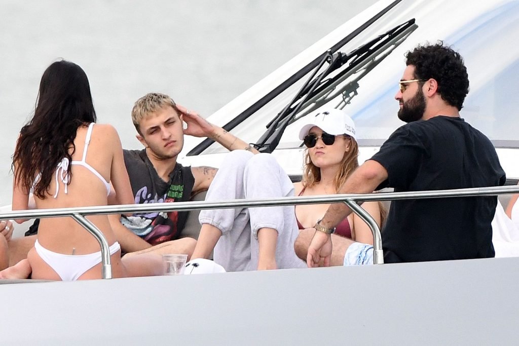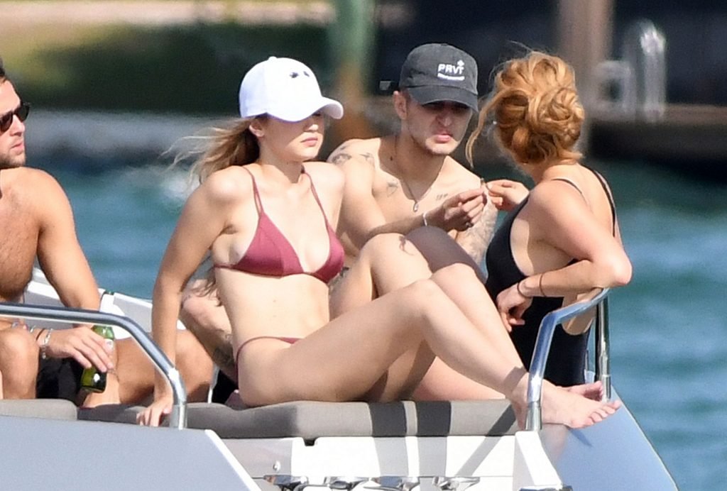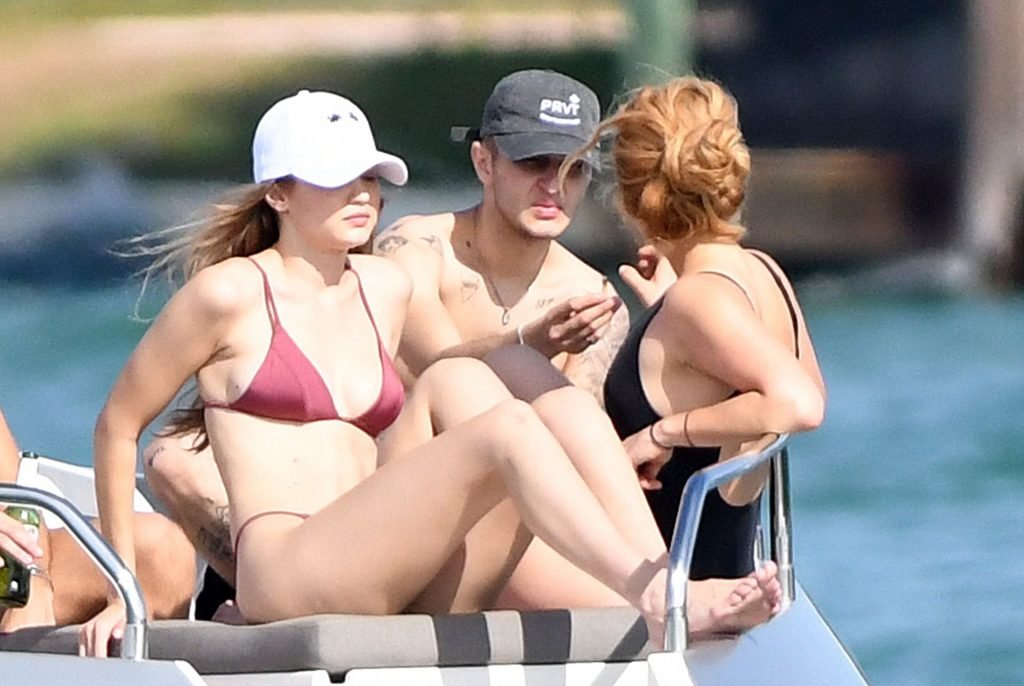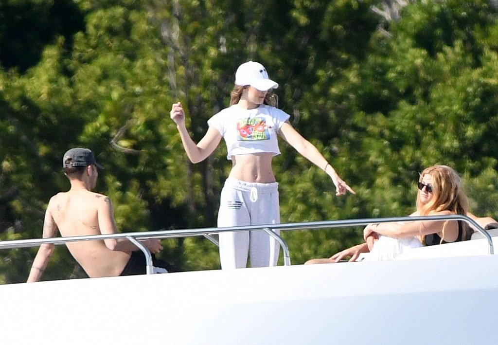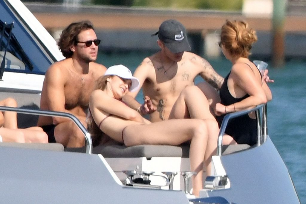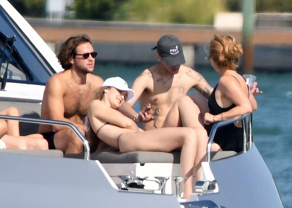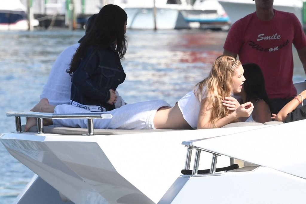 Model Gigi Hadid (23) é vista usando um biquíni vinho enquanto navega em um iate com o irmão Anwar Hadid e alguns amigos em Miami, 25/11/2018.