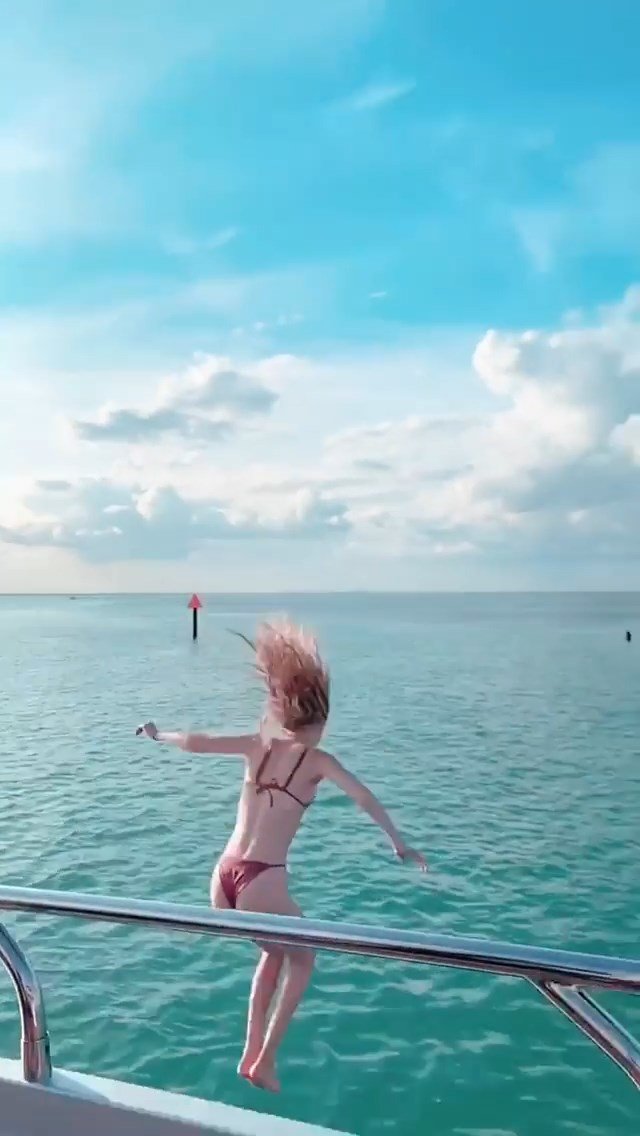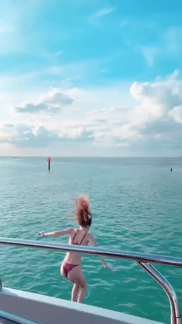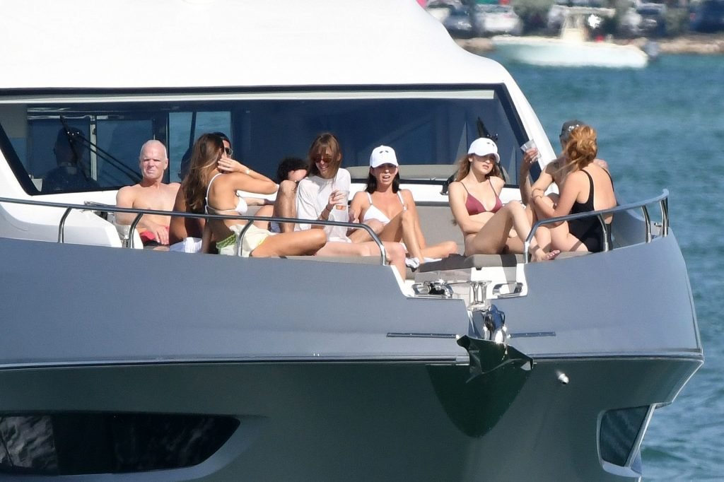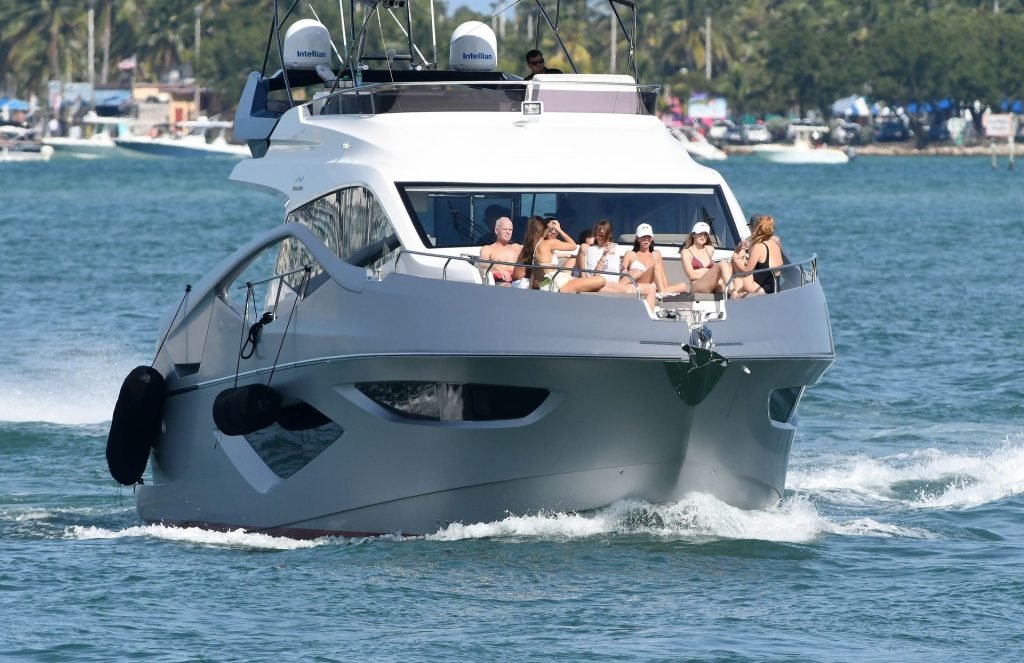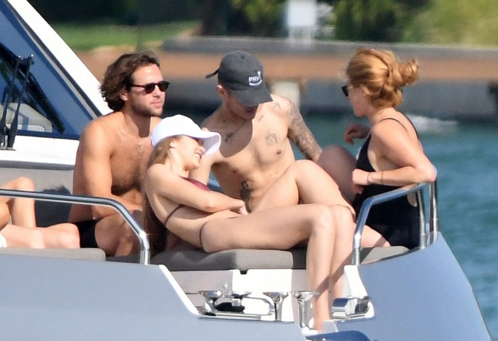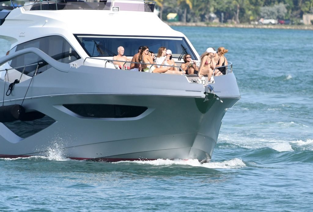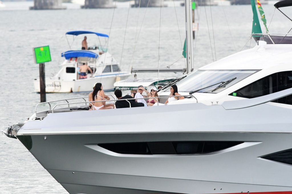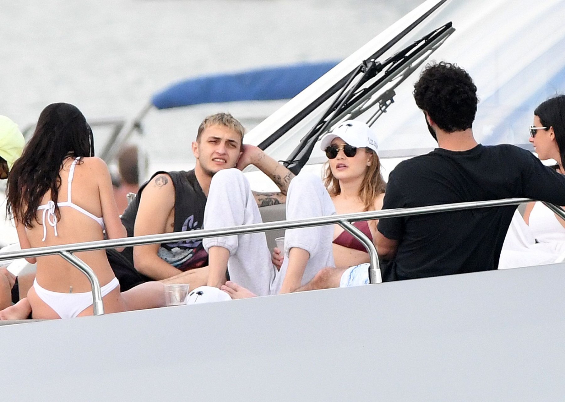 Model Gigi Hadid (23) é vista usando um biquíni vinho enquanto navega em um iate com o irmão Anwar Hadid e alguns amigos em Miami, 25/11/2018.