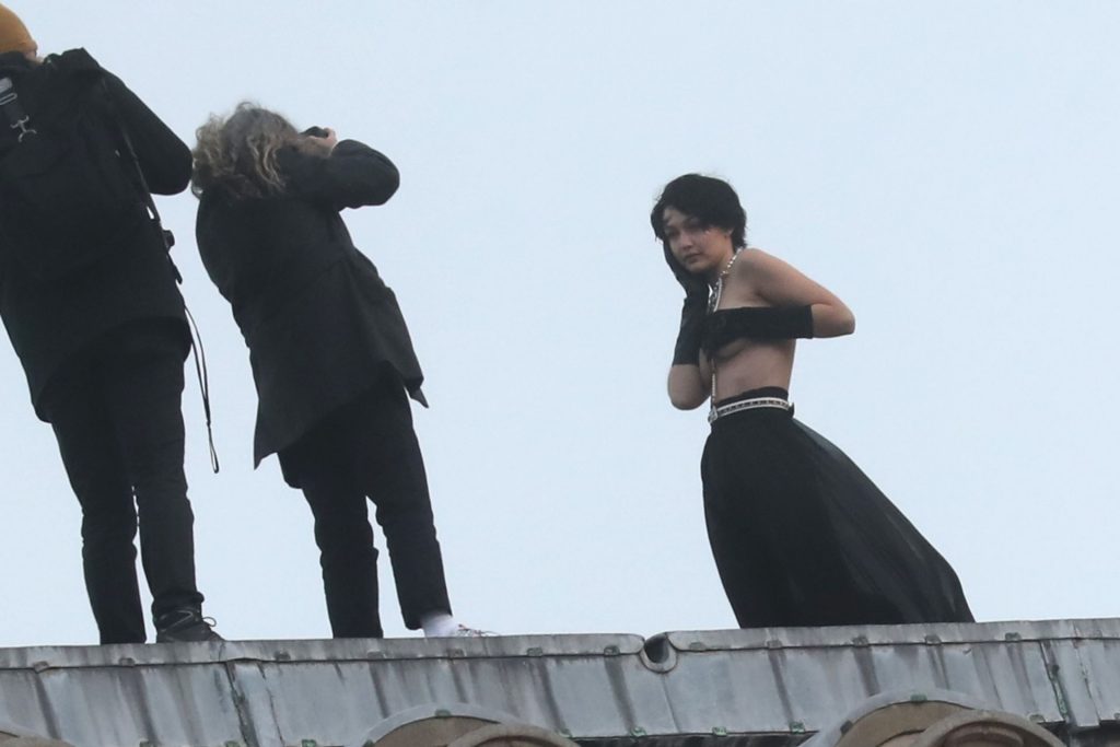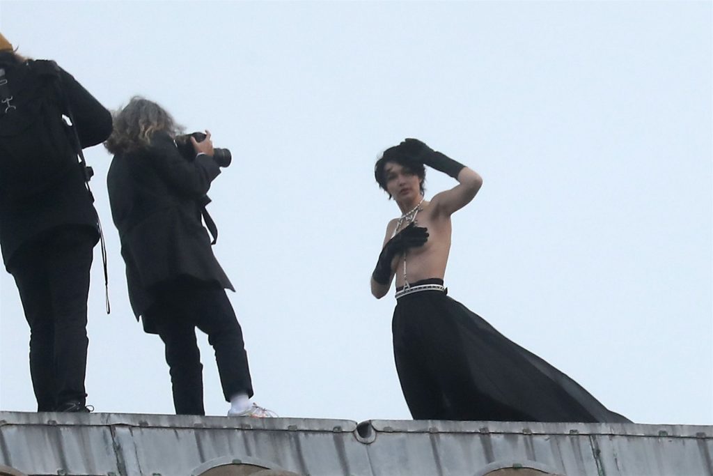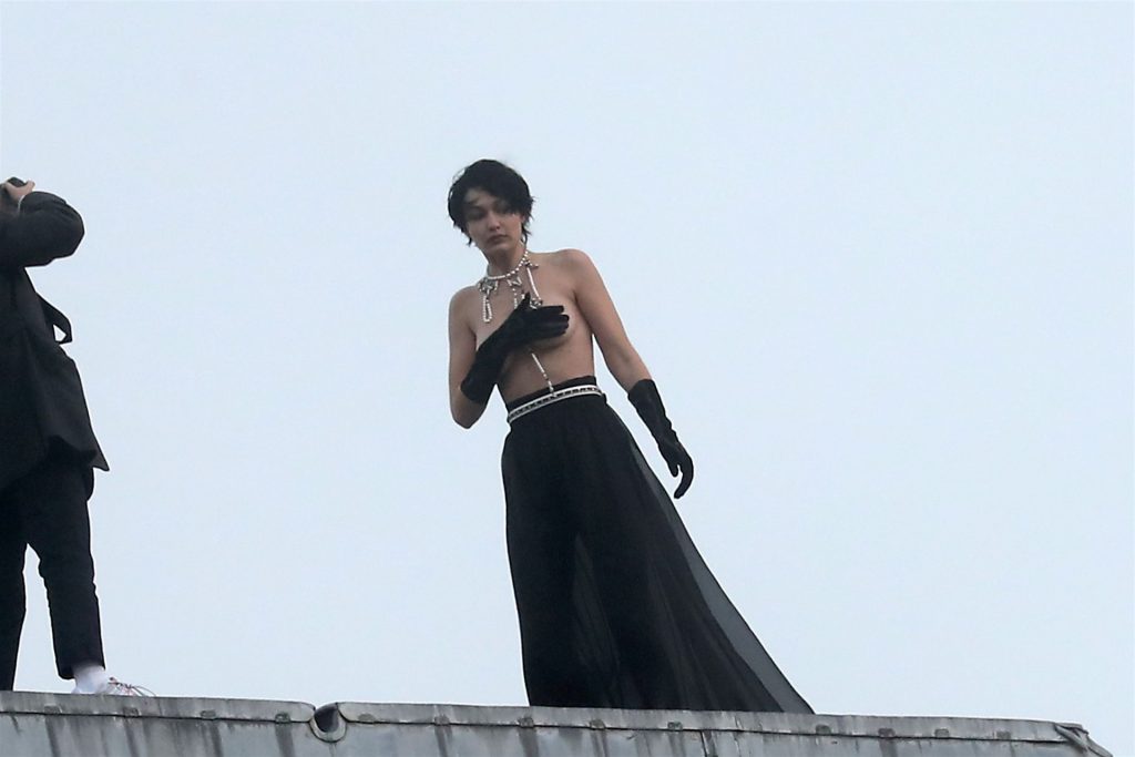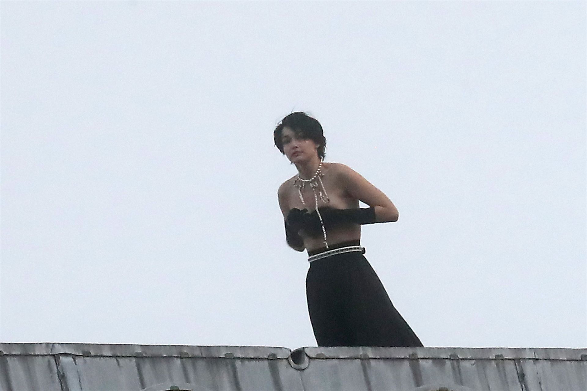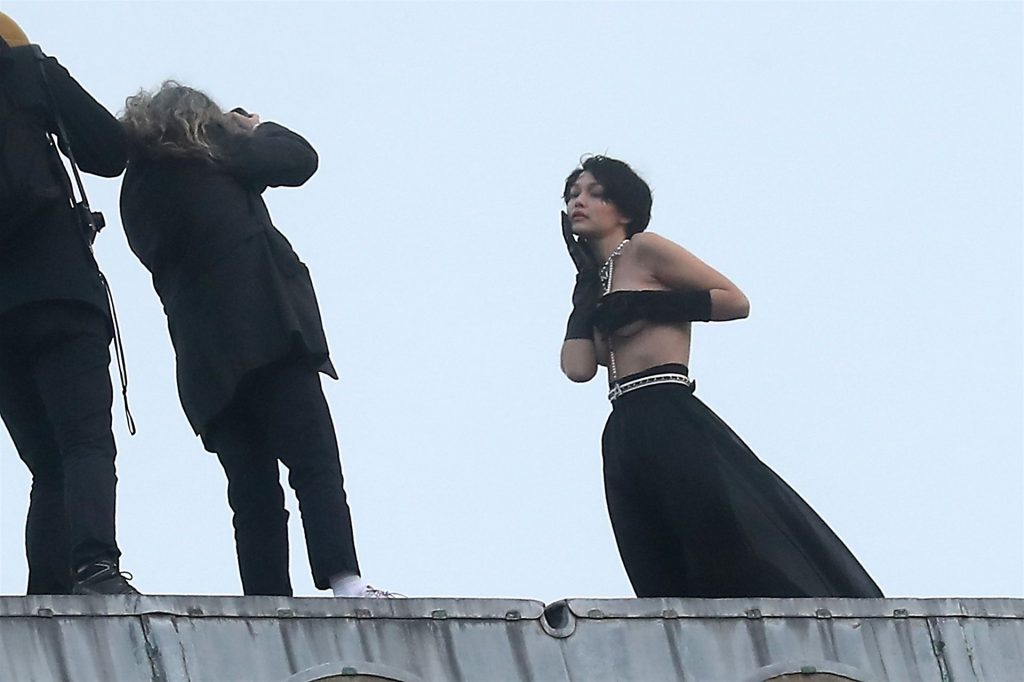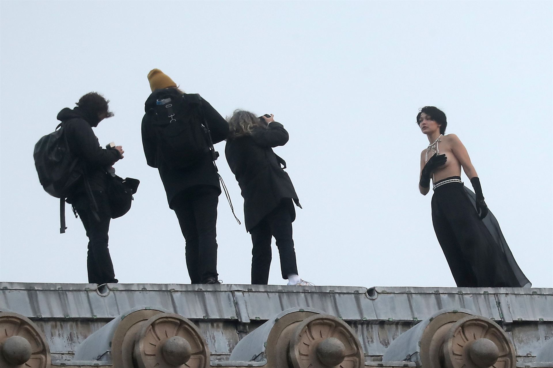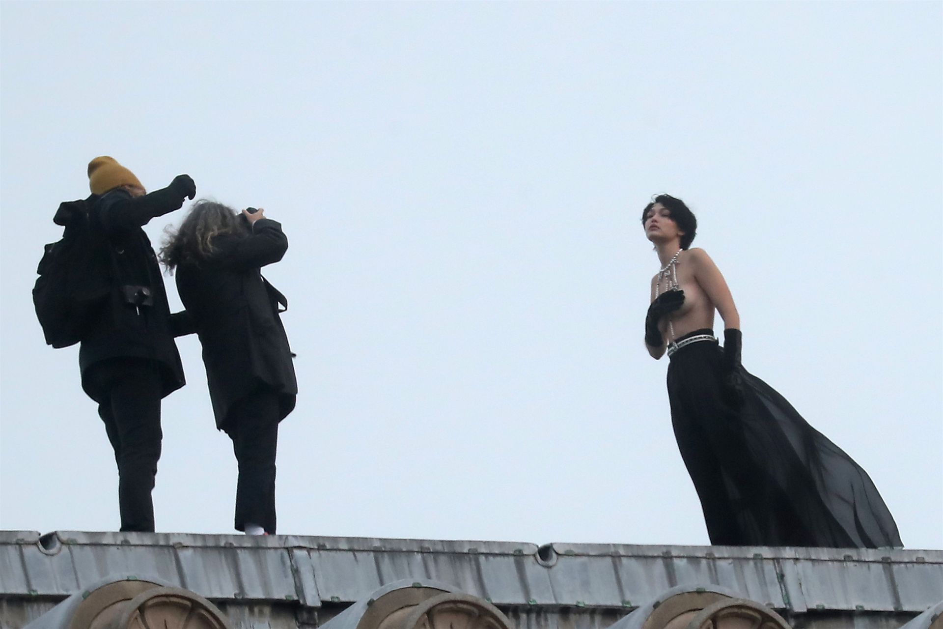 Model Gigi Hadid foi fotografada topless (coberta) com cabelo escuro durante uma sessão de fotos para a Chanel no telhado da Ópera Garnier em Paris no dia 3 de dezembro de 2019.