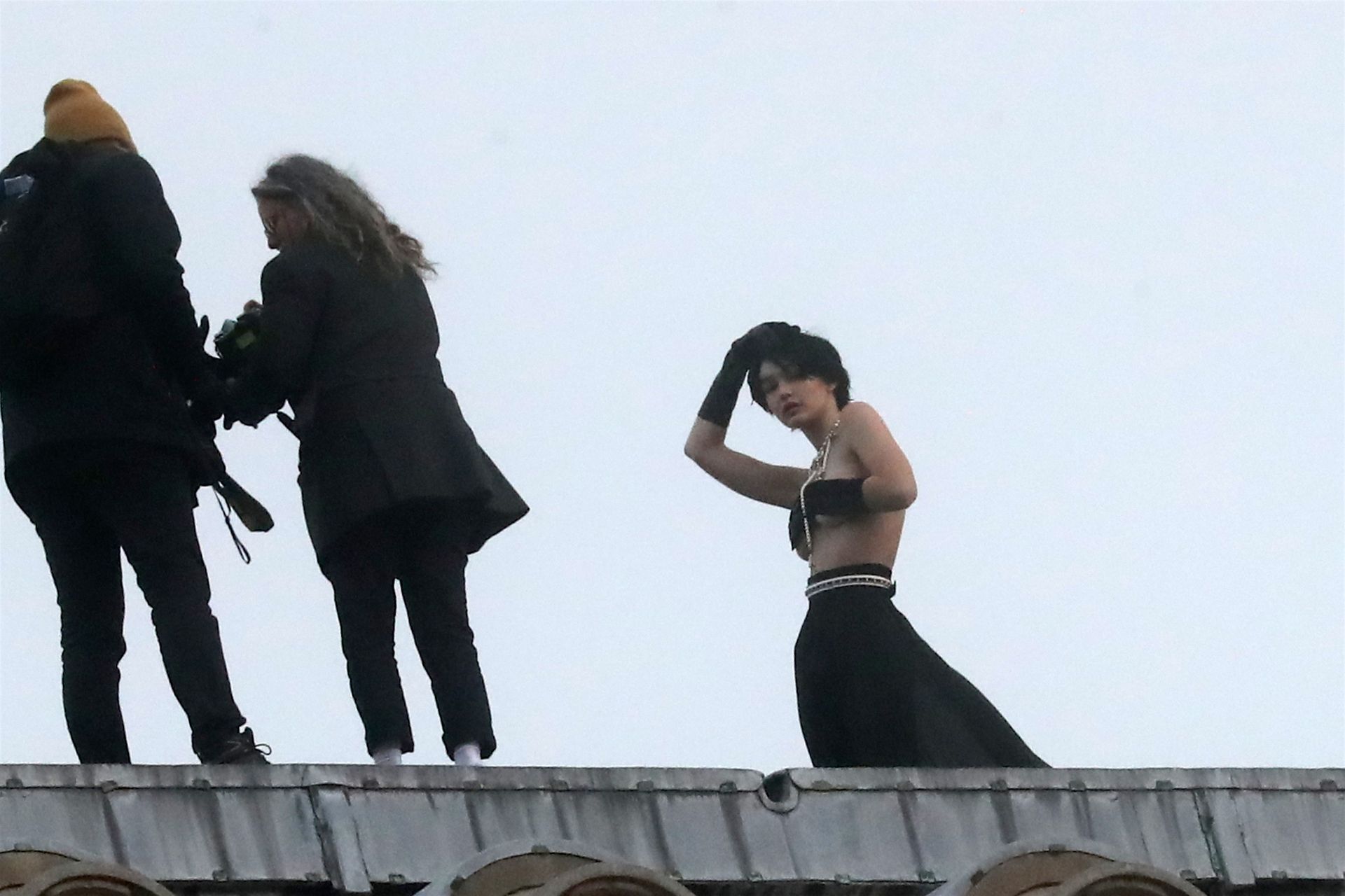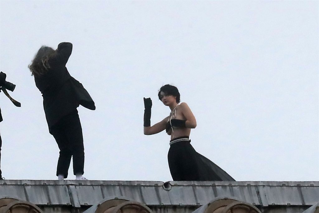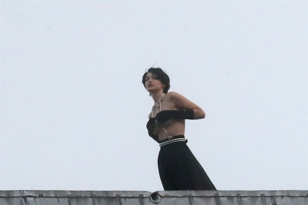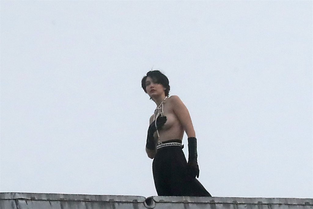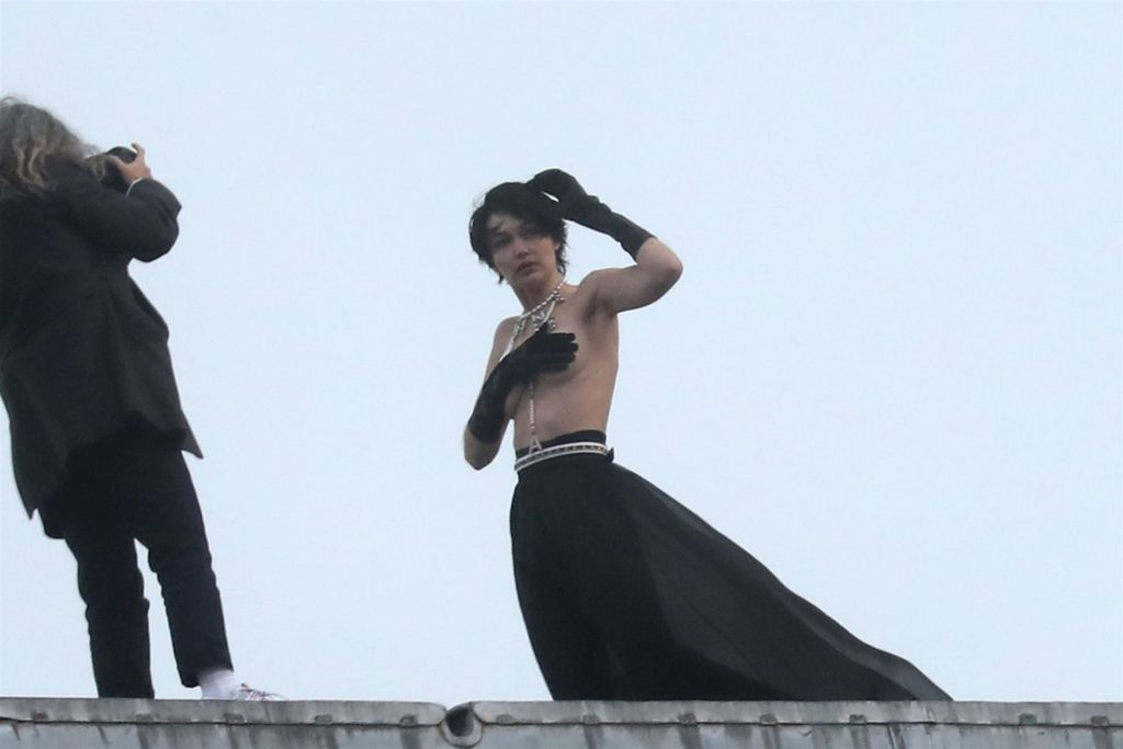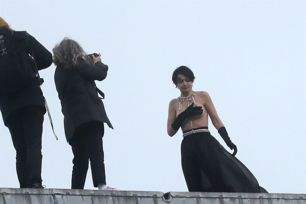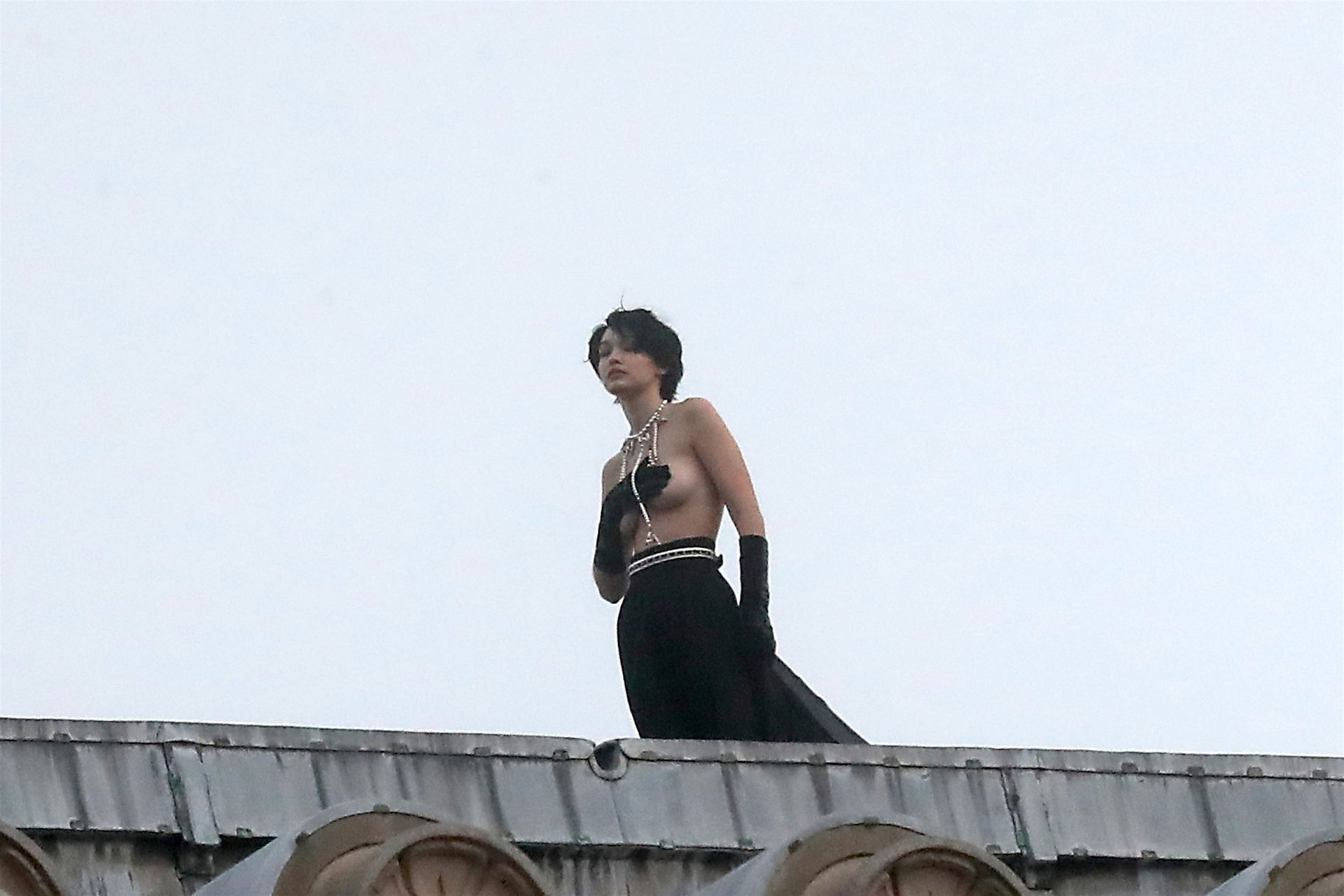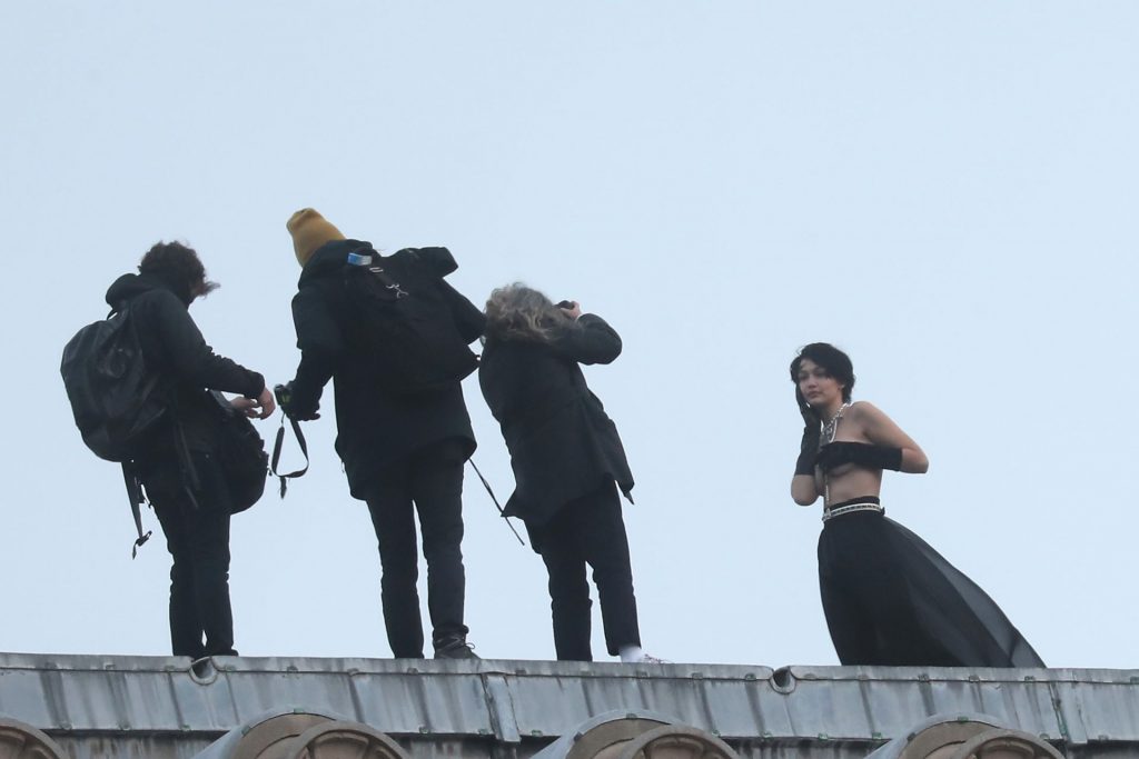Model Gigi Hadid foi fotografada topless (coberta) com cabelo escuro durante uma sessão de fotos para a Chanel no telhado da Ópera Garnier em Paris no dia 3 de dezembro de 2019.