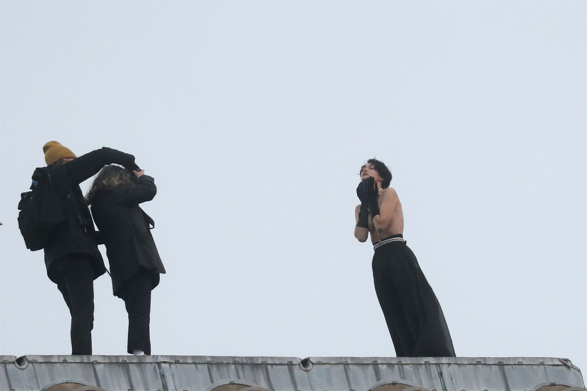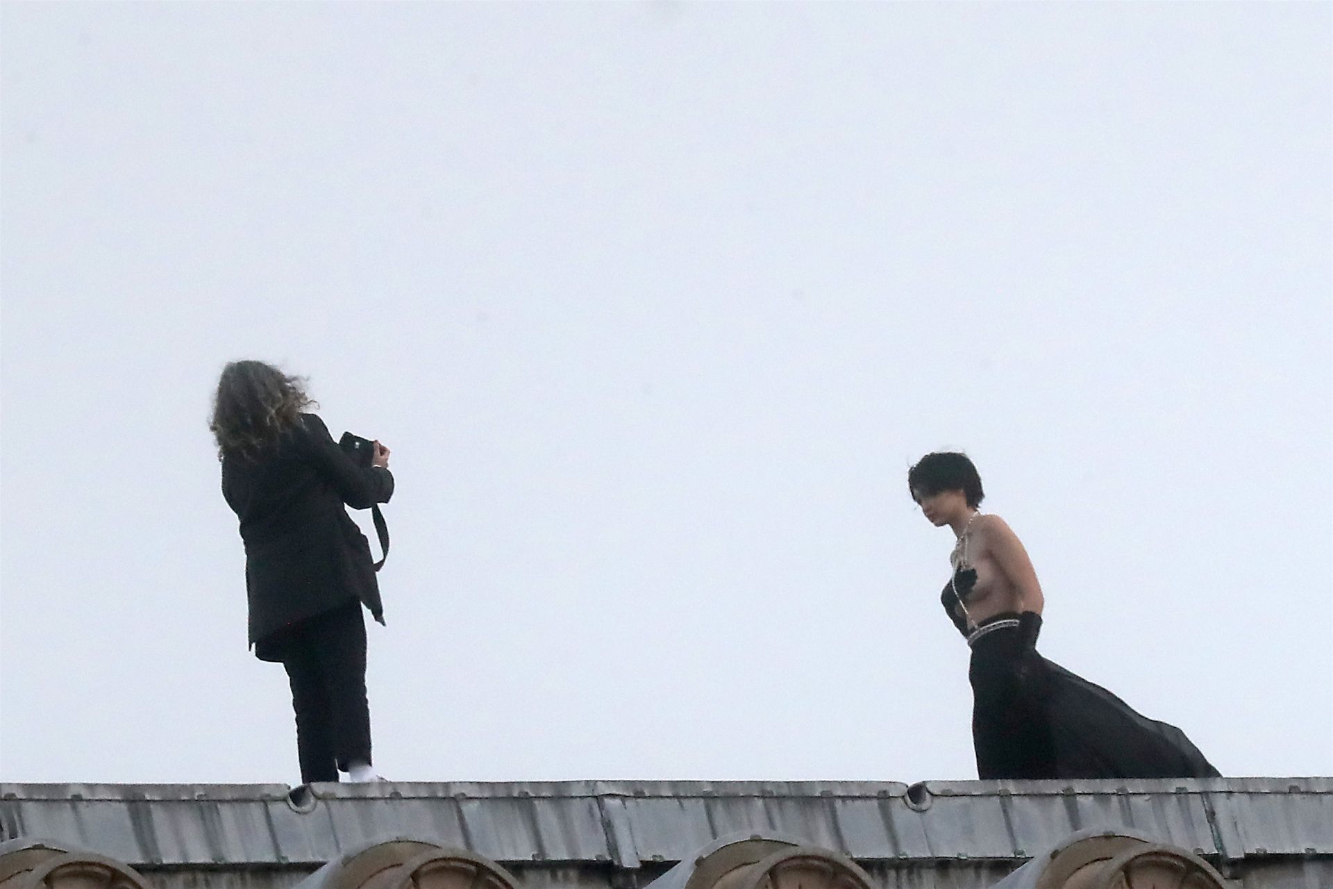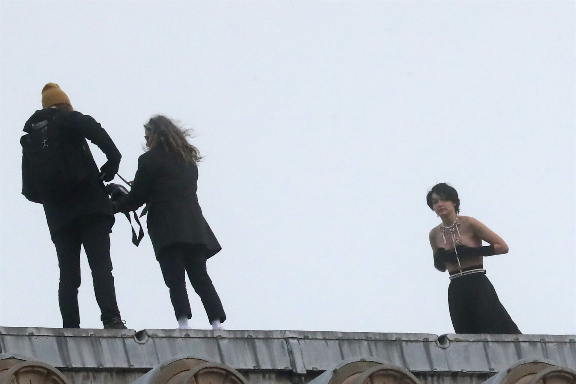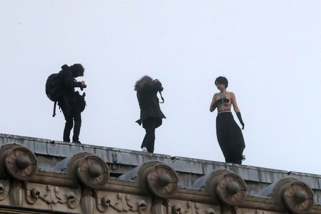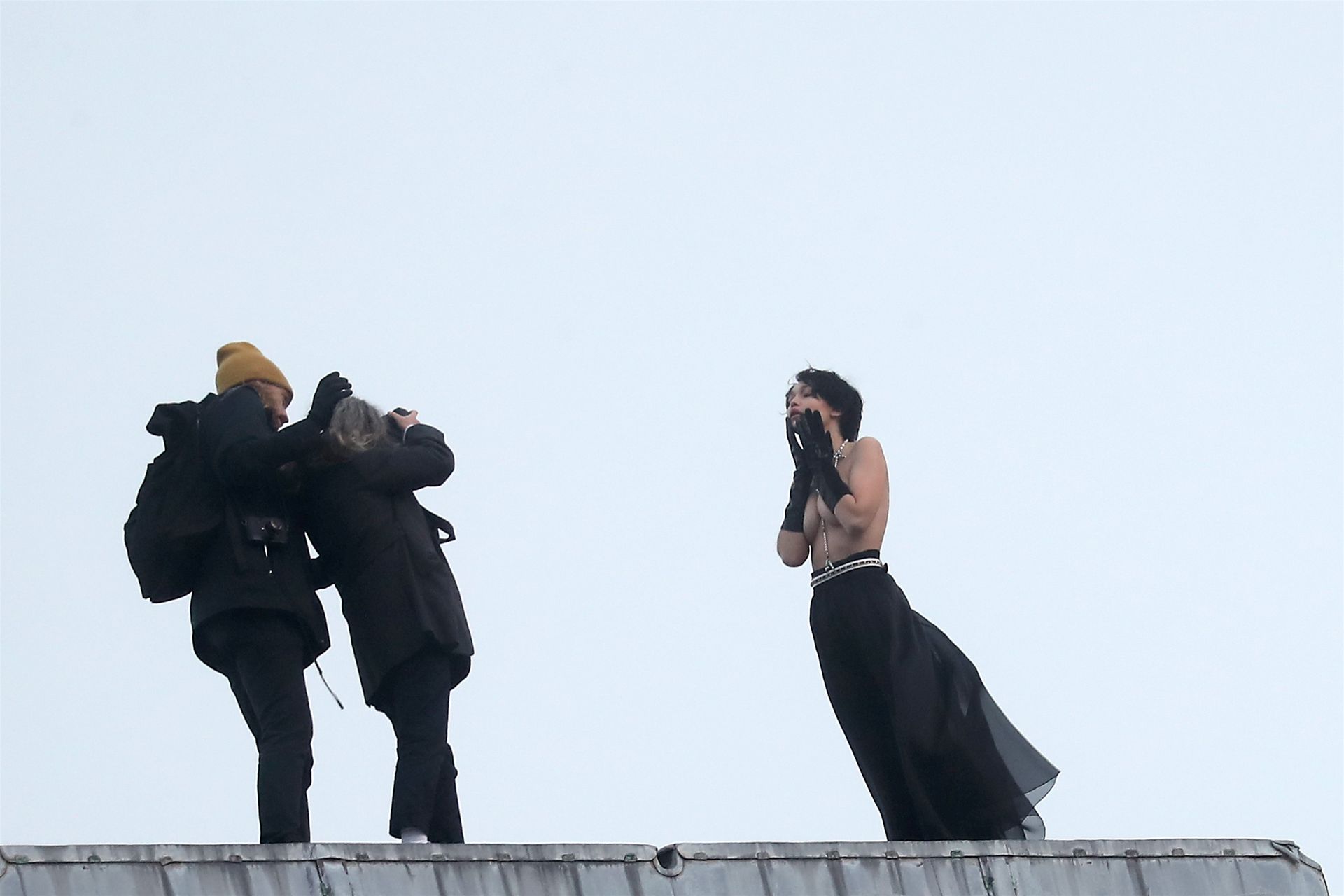 Model Gigi Hadid foi fotografada topless (coberta) com cabelo escuro durante uma sessão de fotos para a Chanel no telhado da Ópera Garnier em Paris no dia 3 de dezembro de 2019.