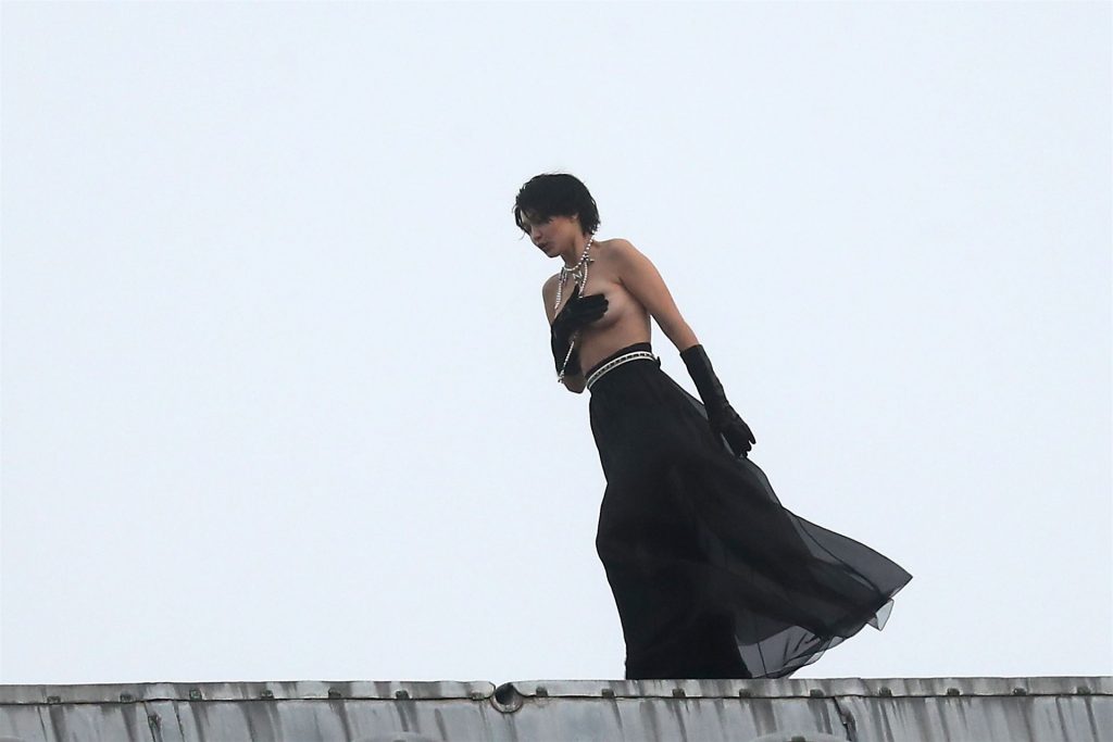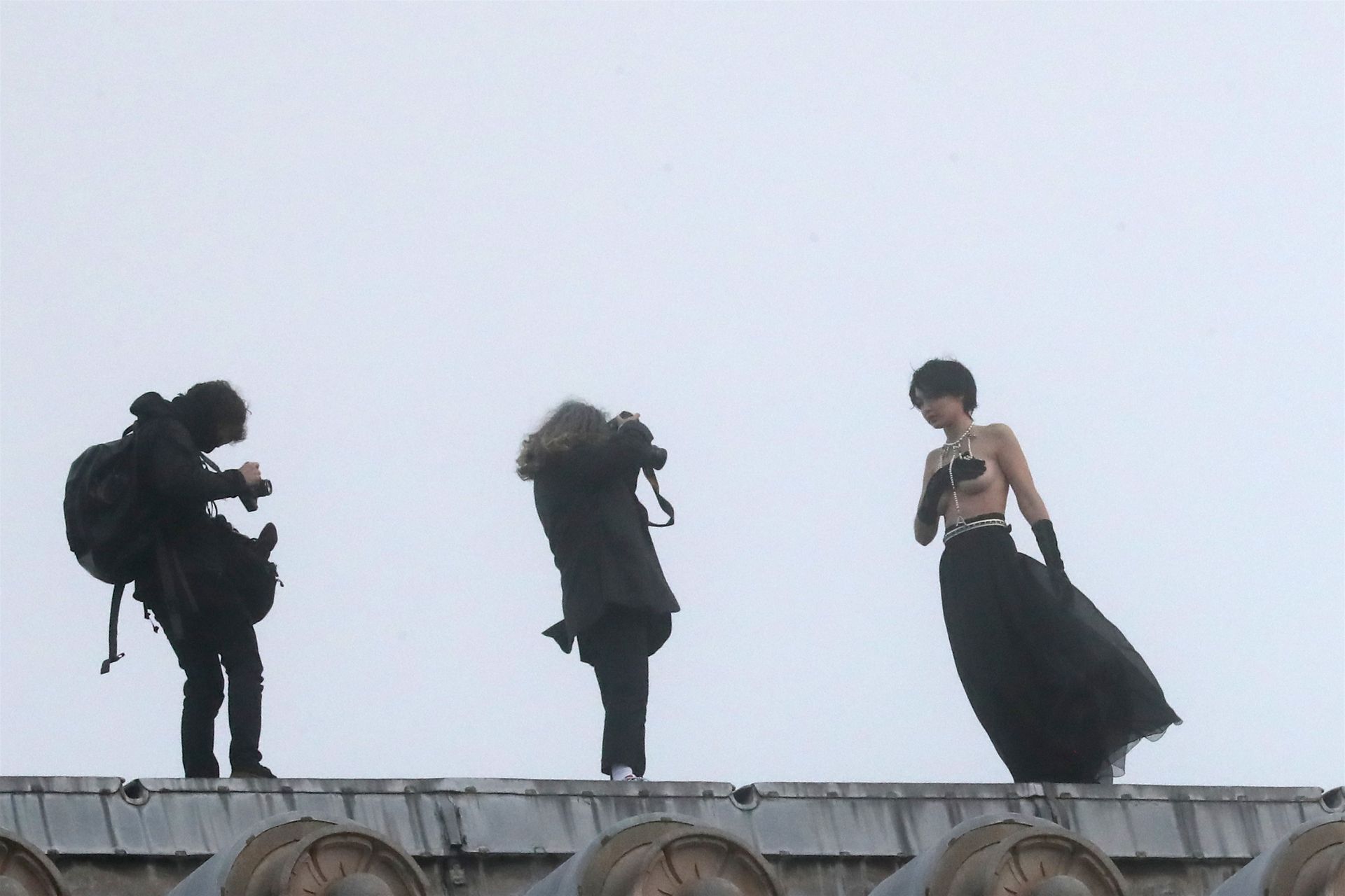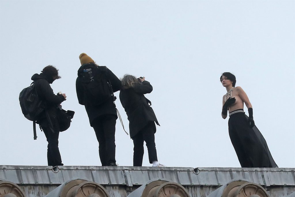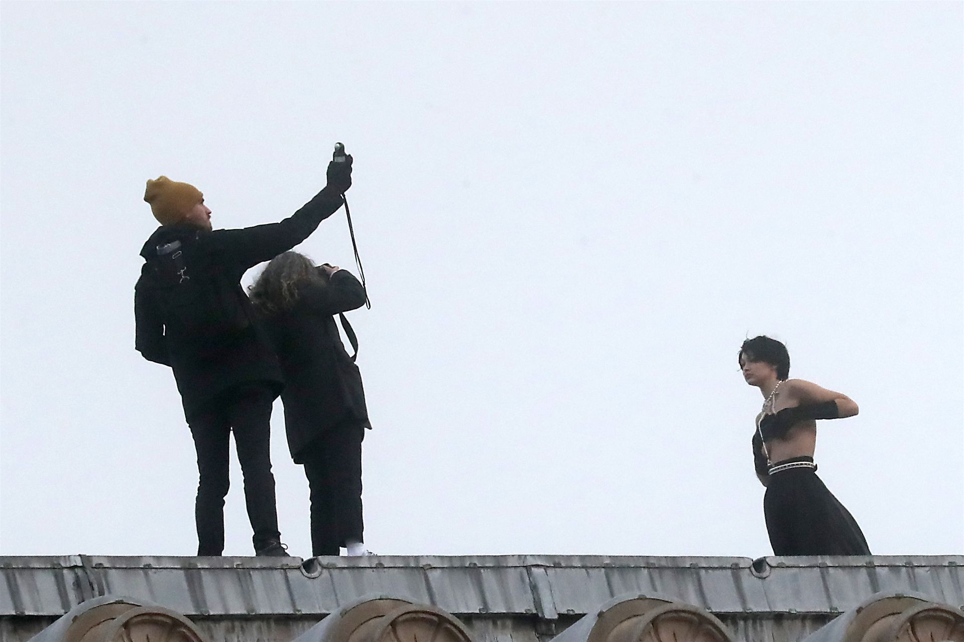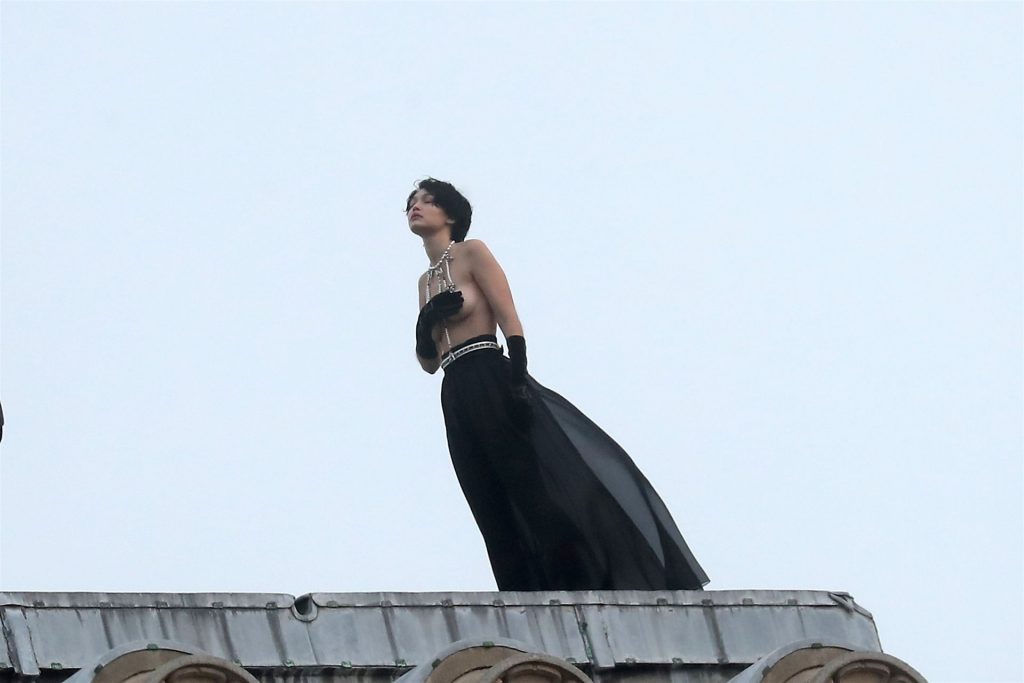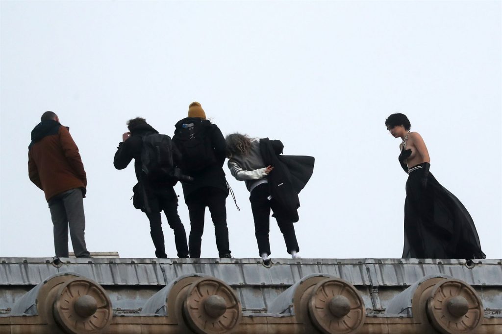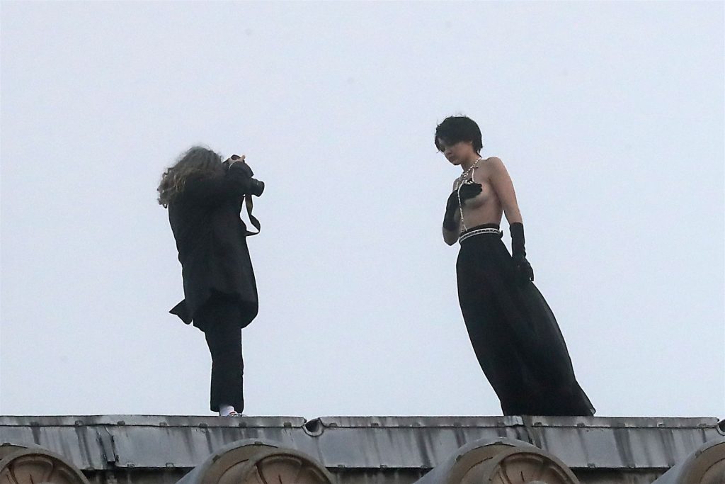 Model Gigi Hadid foi fotografada topless (coberta) com cabelo escuro durante uma sessão de fotos para a Chanel no telhado da Ópera Garnier em Paris no dia 3 de dezembro de 2019.
