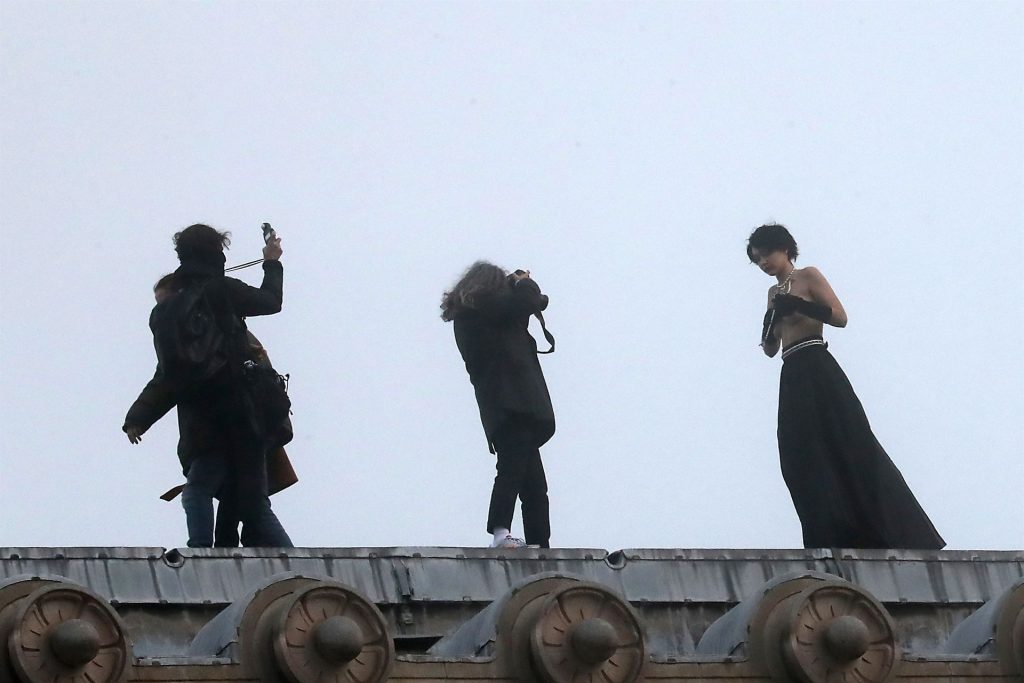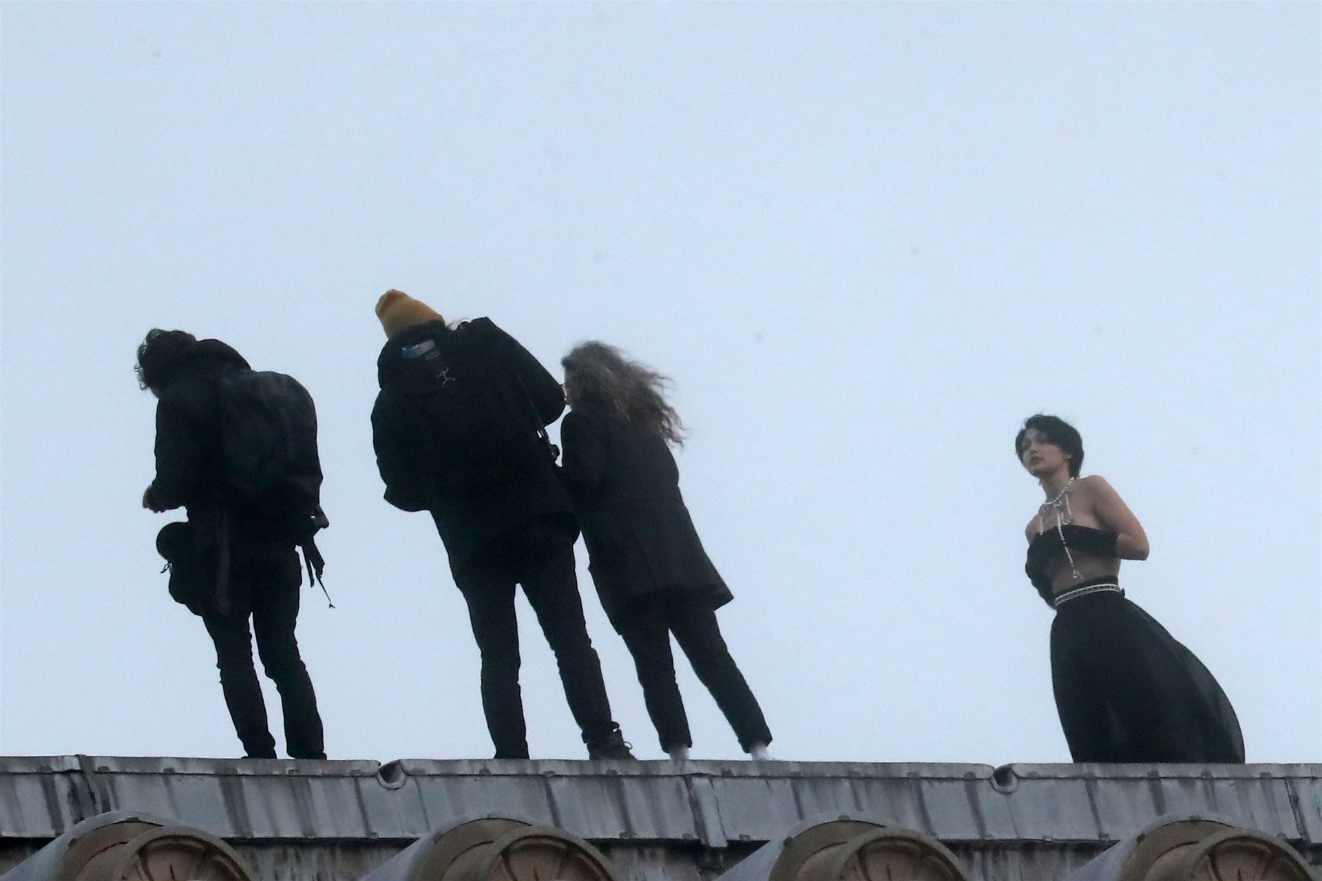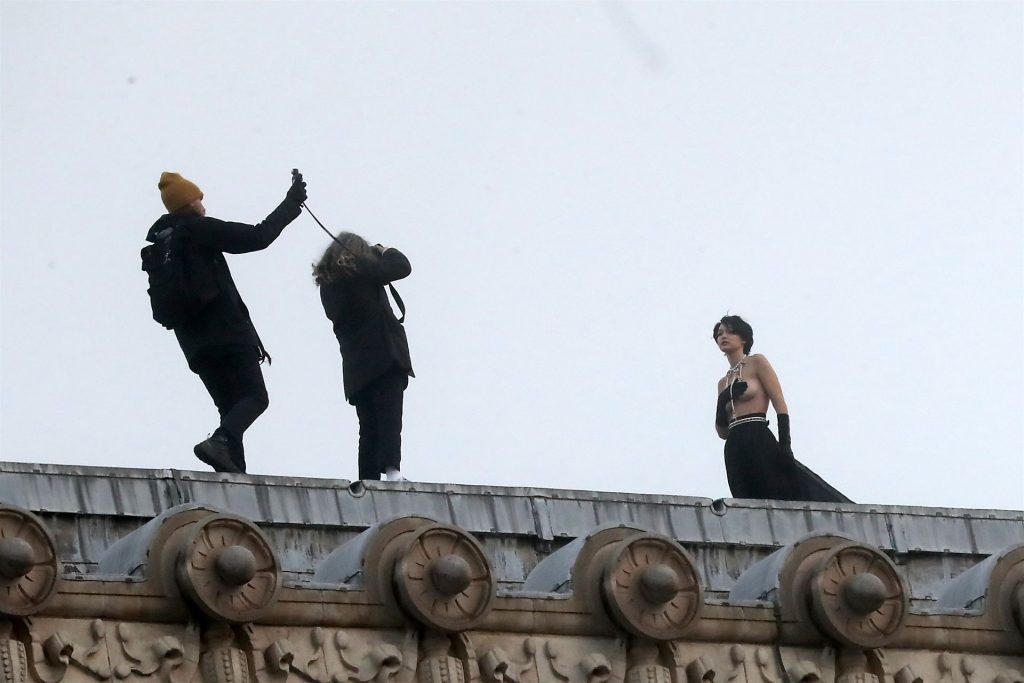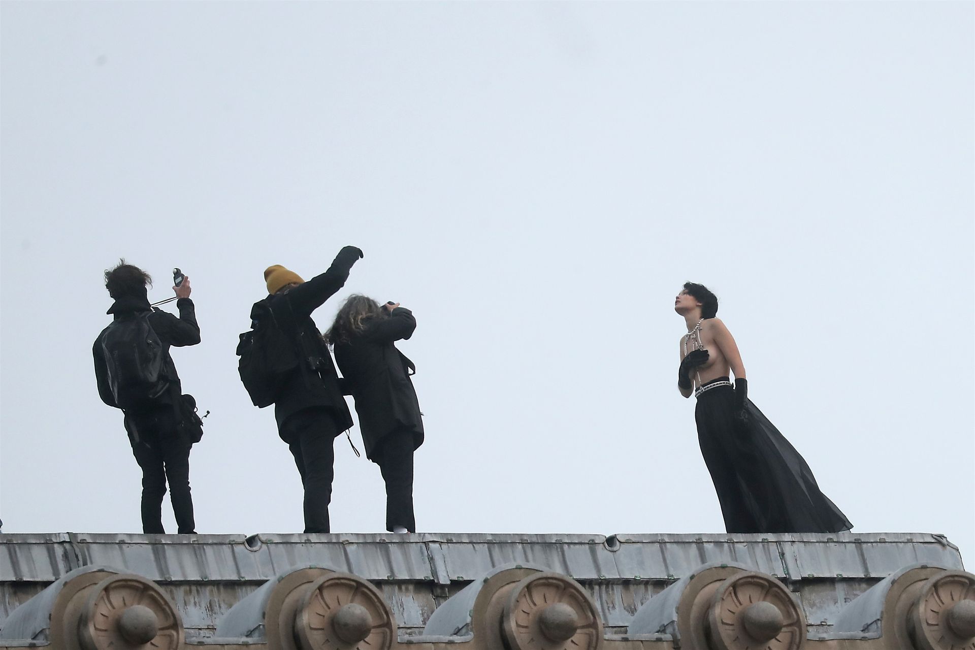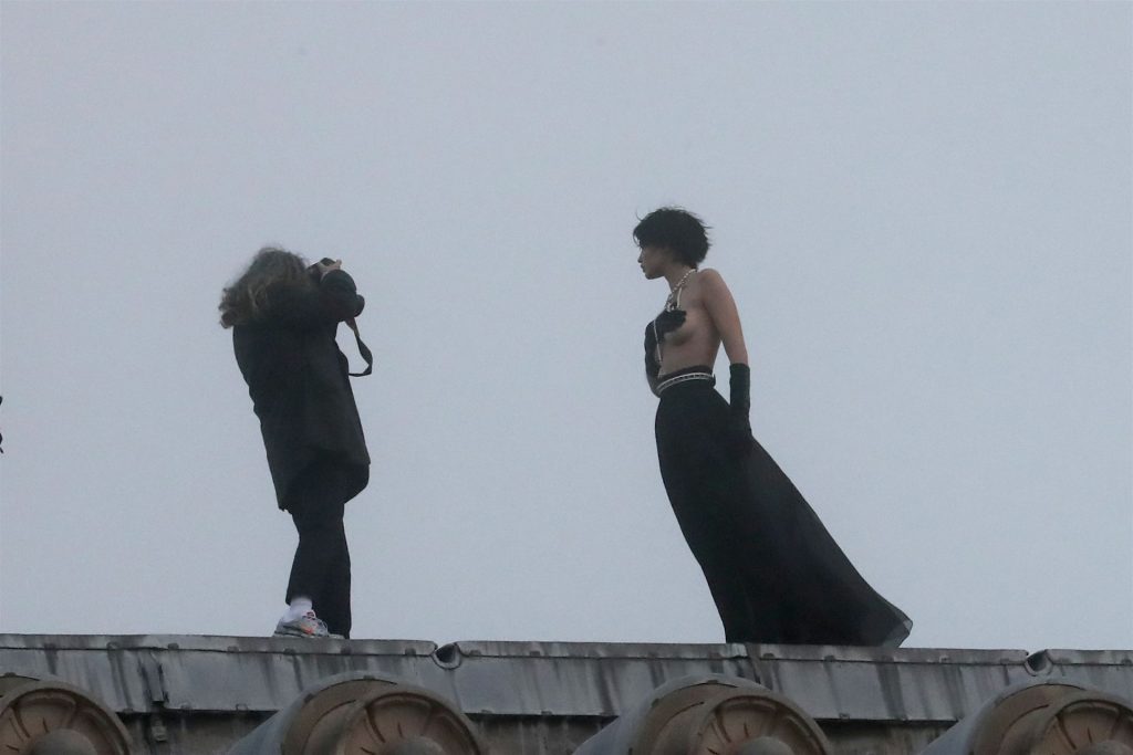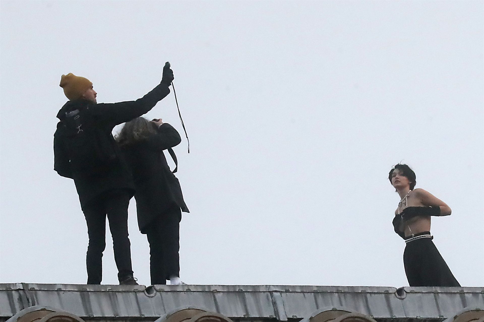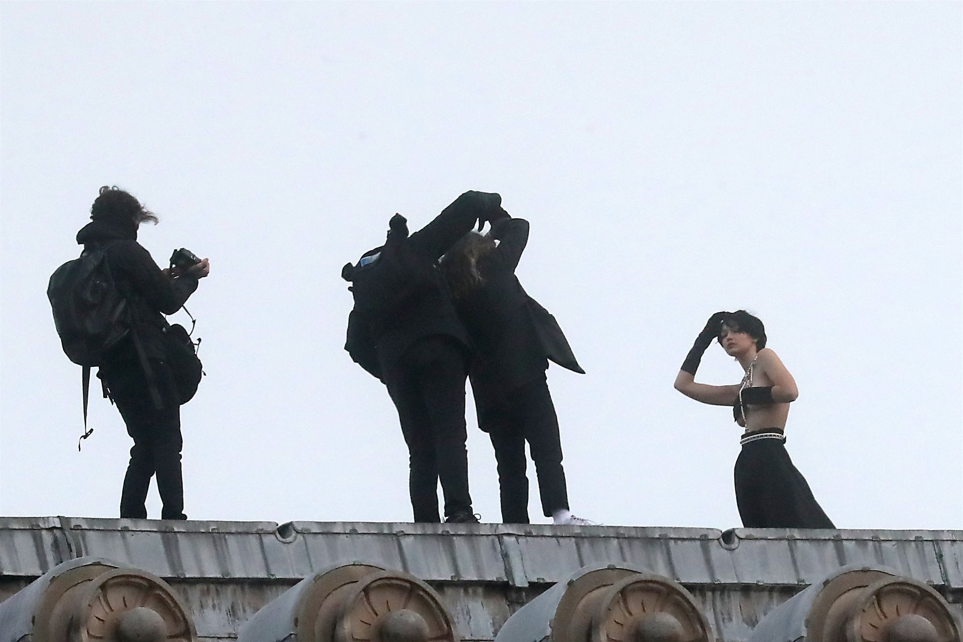 Model Gigi Hadid foi fotografada topless (coberta) com cabelo escuro durante uma sessão de fotos para a Chanel no telhado da Ópera Garnier em Paris no dia 3 de dezembro de 2019.