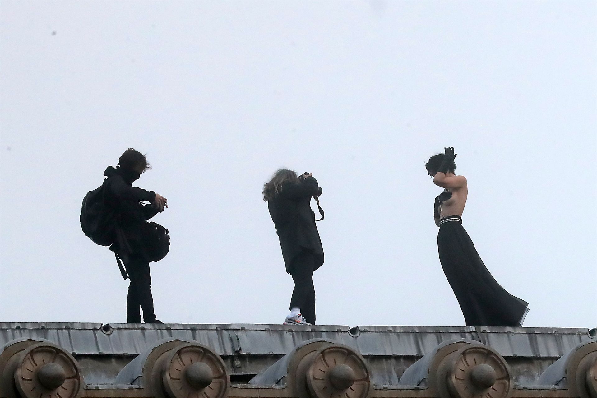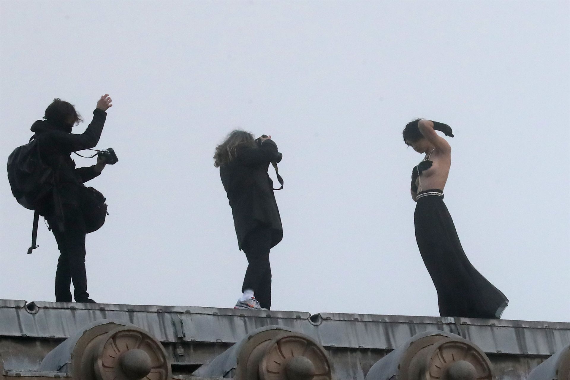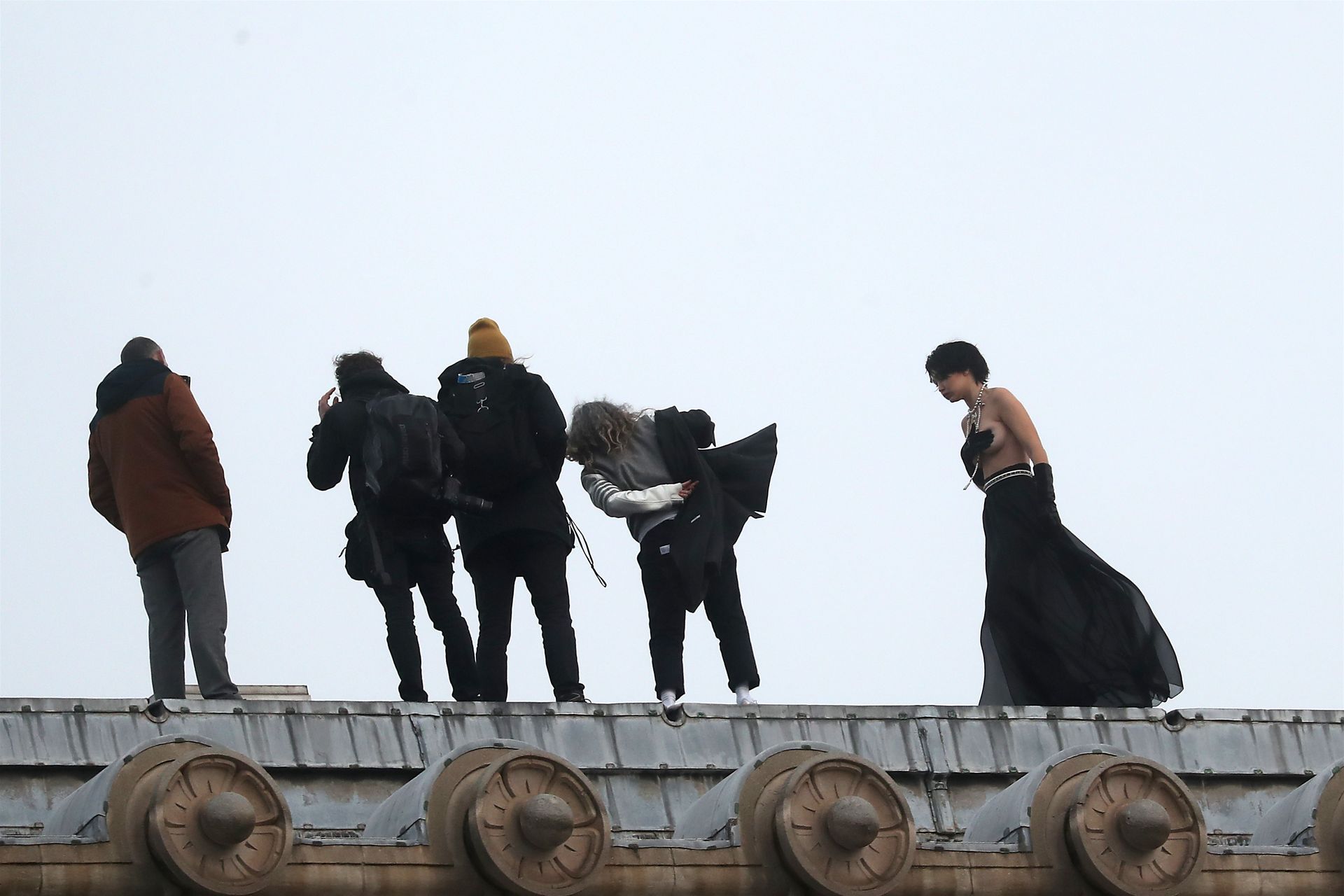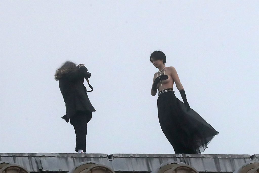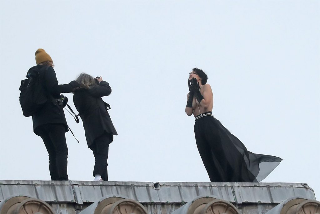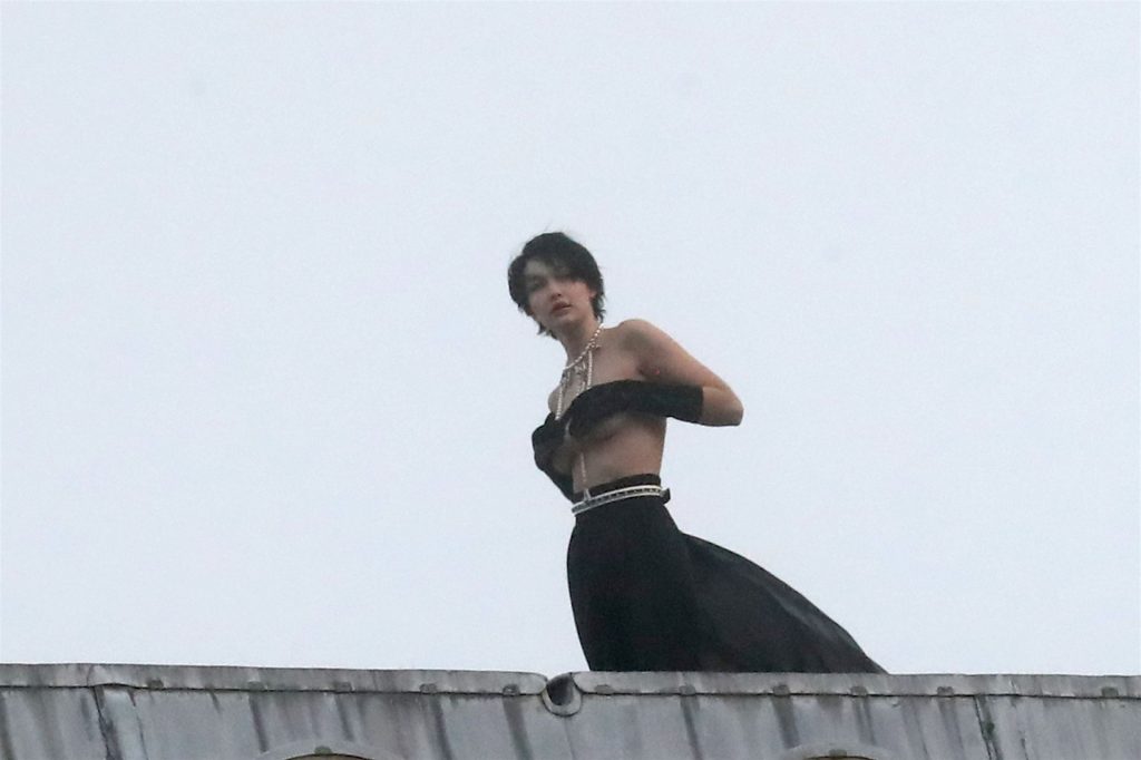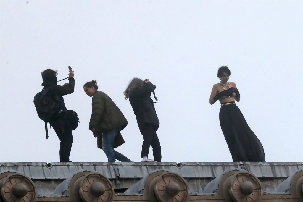 Model Gigi Hadid foi fotografada topless (coberta) com cabelo escuro durante uma sessão de fotos para a Chanel no telhado da Ópera Garnier em Paris no dia 3 de dezembro de 2019.