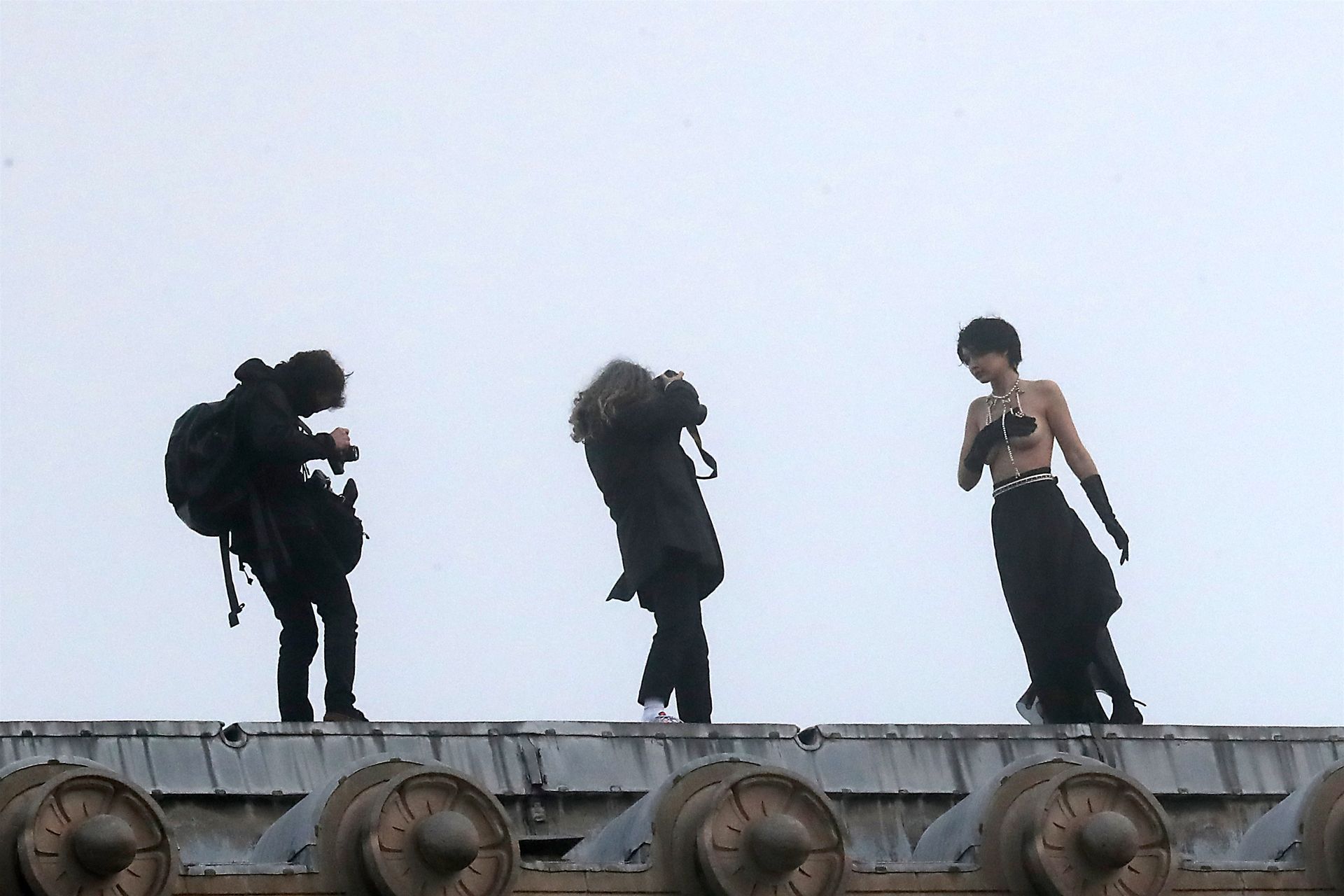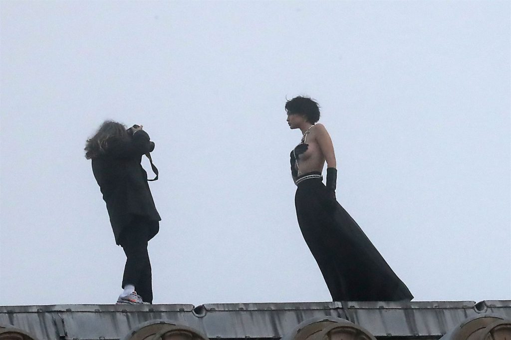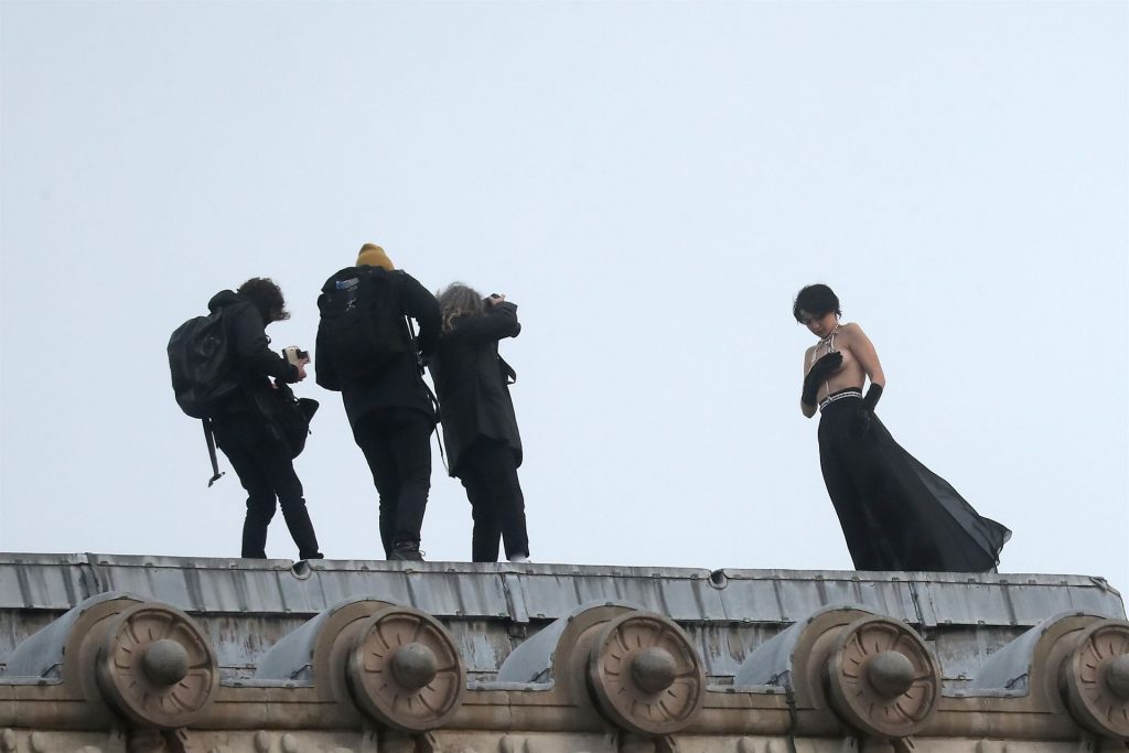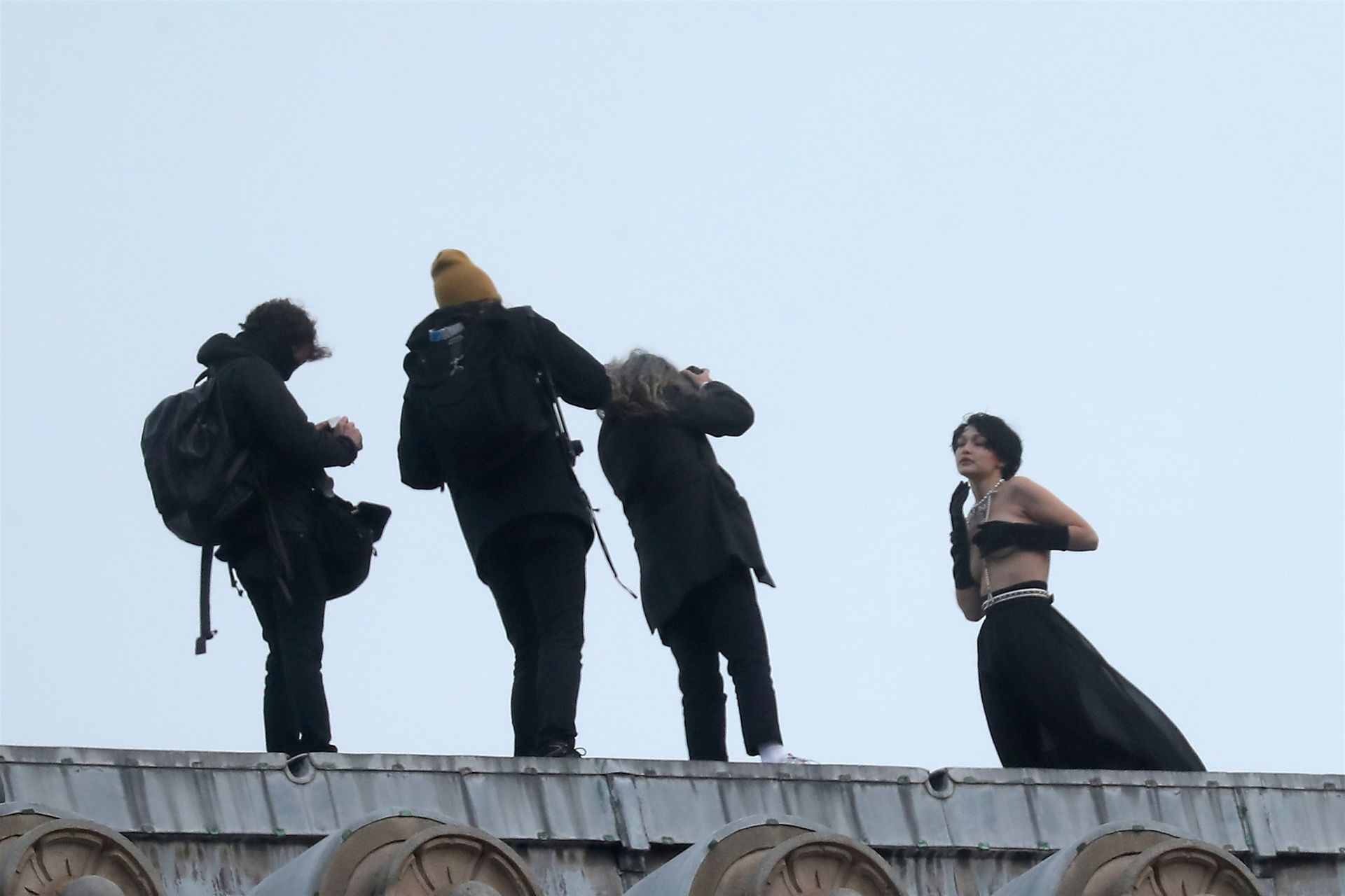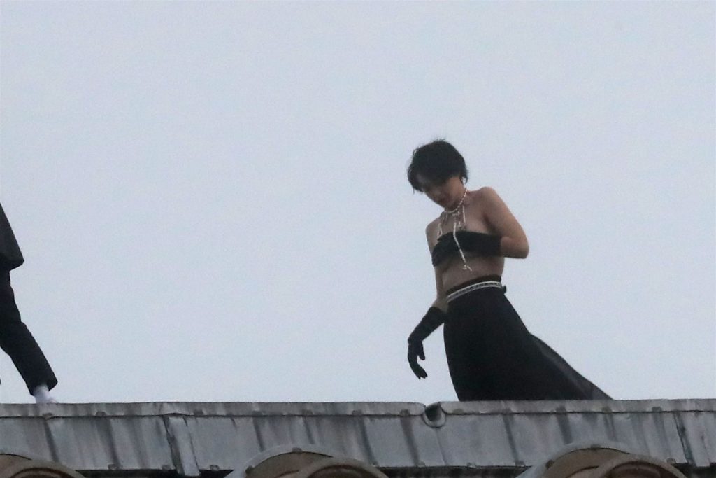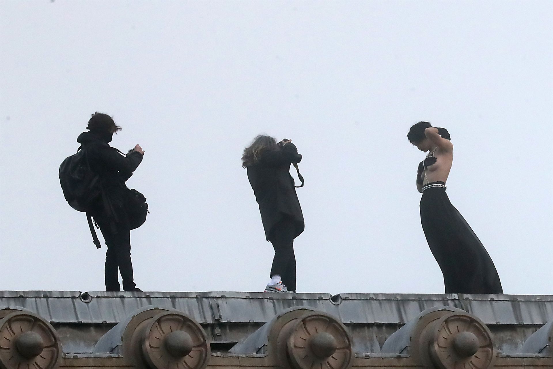 Model Gigi Hadid foi fotografada topless (coberta) com cabelo escuro durante uma sessão de fotos para a Chanel no telhado da Ópera Garnier em Paris no dia 3 de dezembro de 2019.