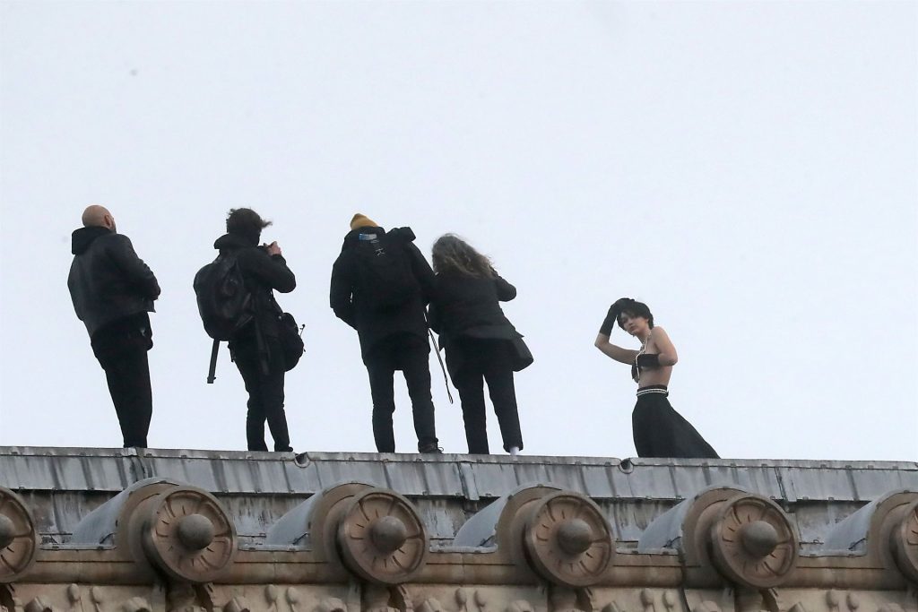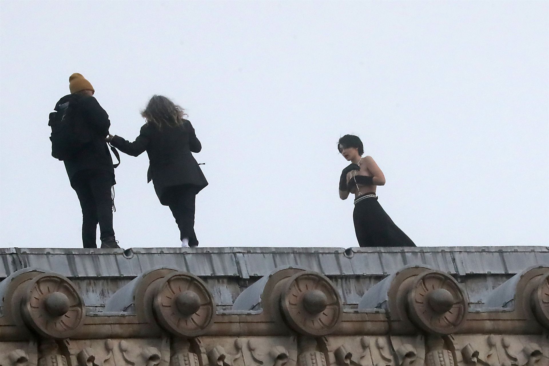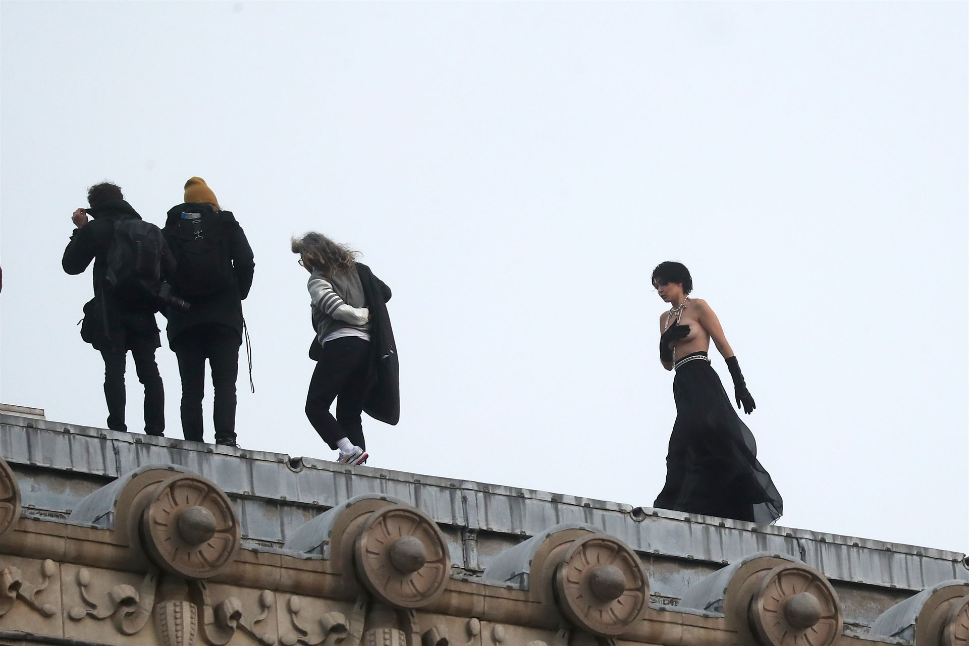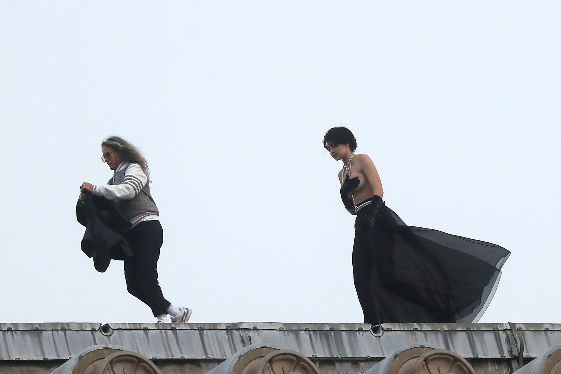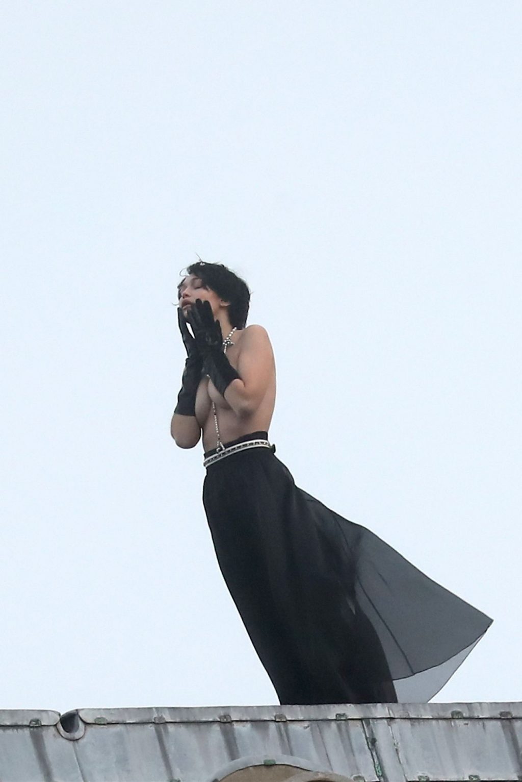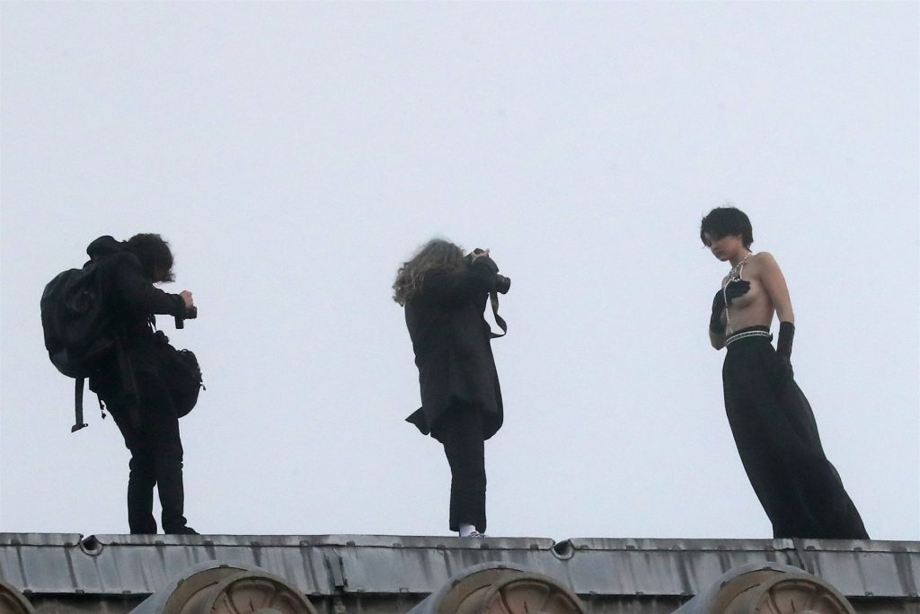 Model Gigi Hadid foi fotografada topless (coberta) com cabelo escuro durante uma sessão de fotos para a Chanel no telhado da Ópera Garnier em Paris no dia 3 de dezembro de 2019.