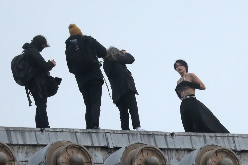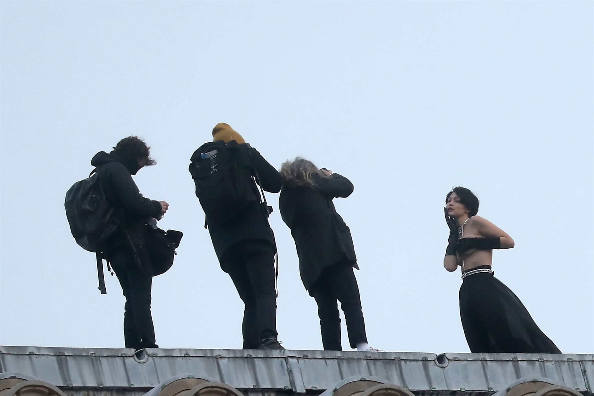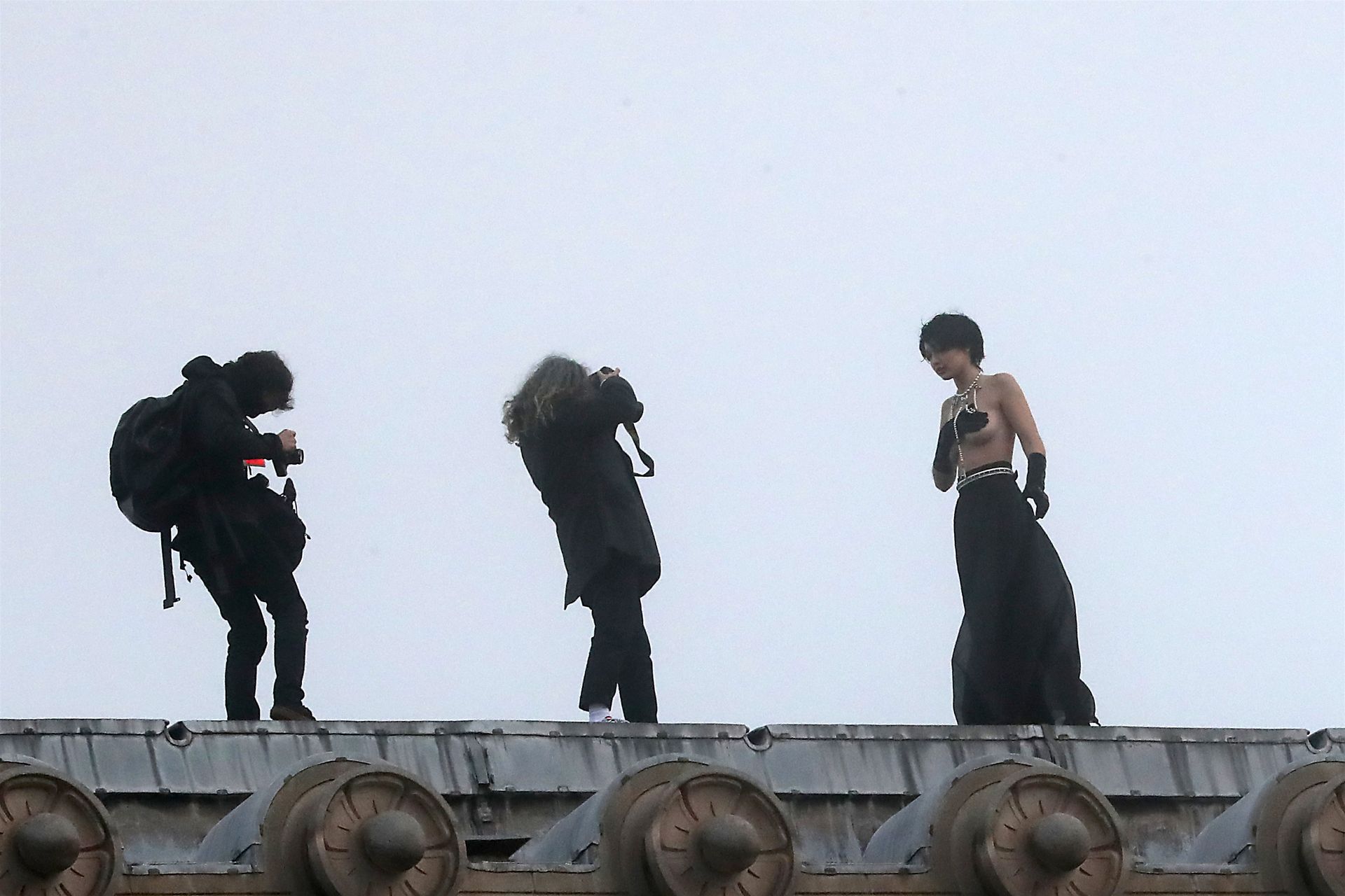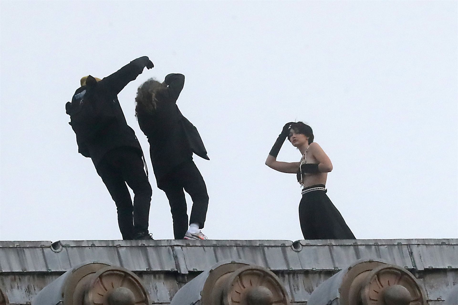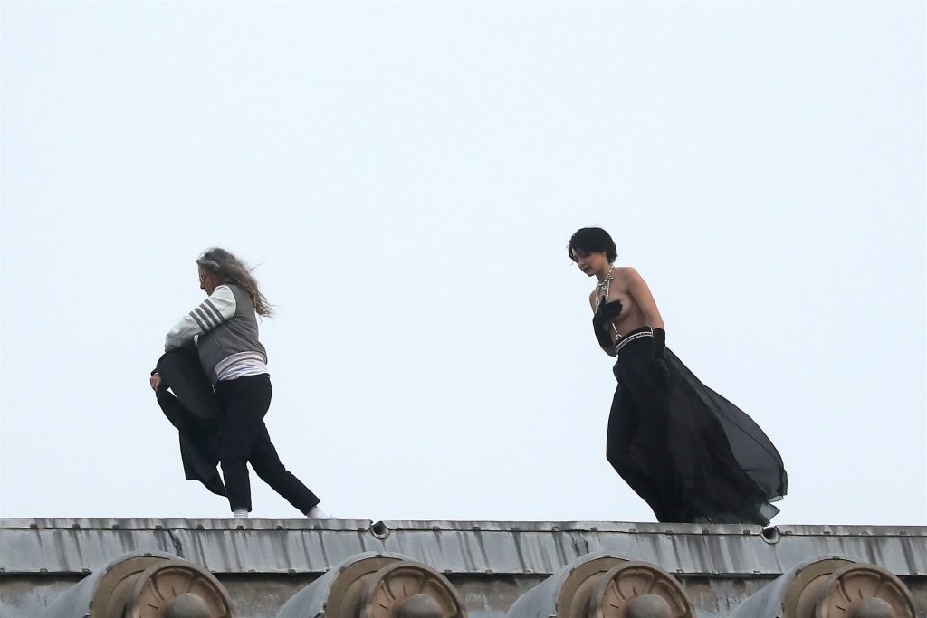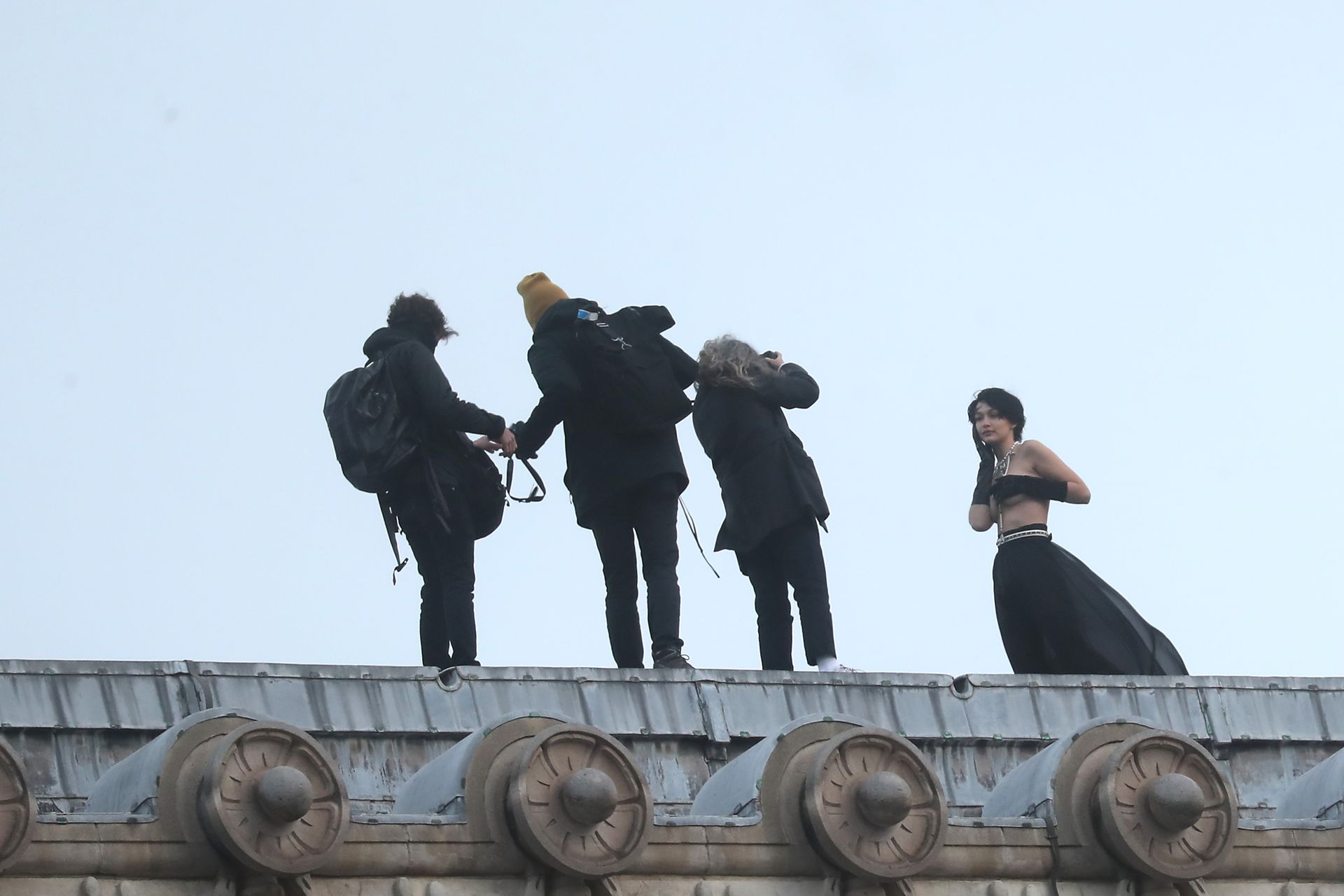 Model Gigi Hadid foi fotografada topless (coberta) com cabelo escuro durante uma sessão de fotos para a Chanel no telhado da Ópera Garnier em Paris no dia 3 de dezembro de 2019.