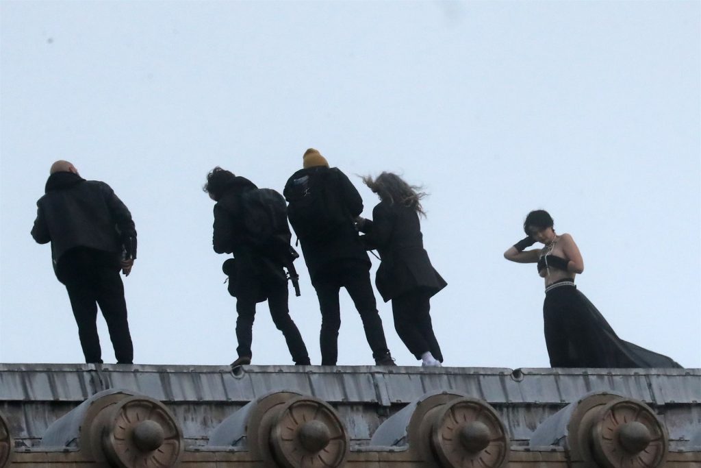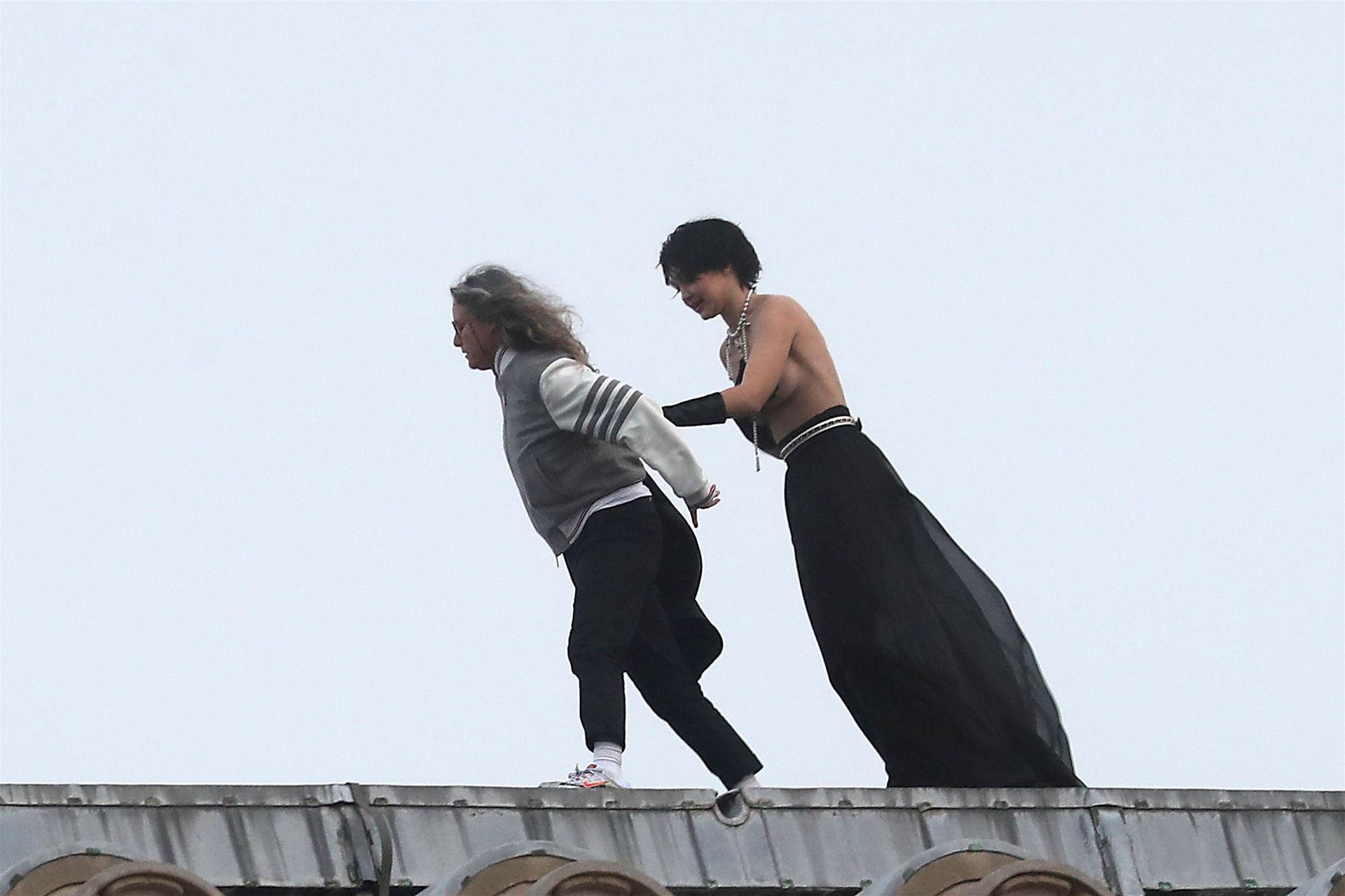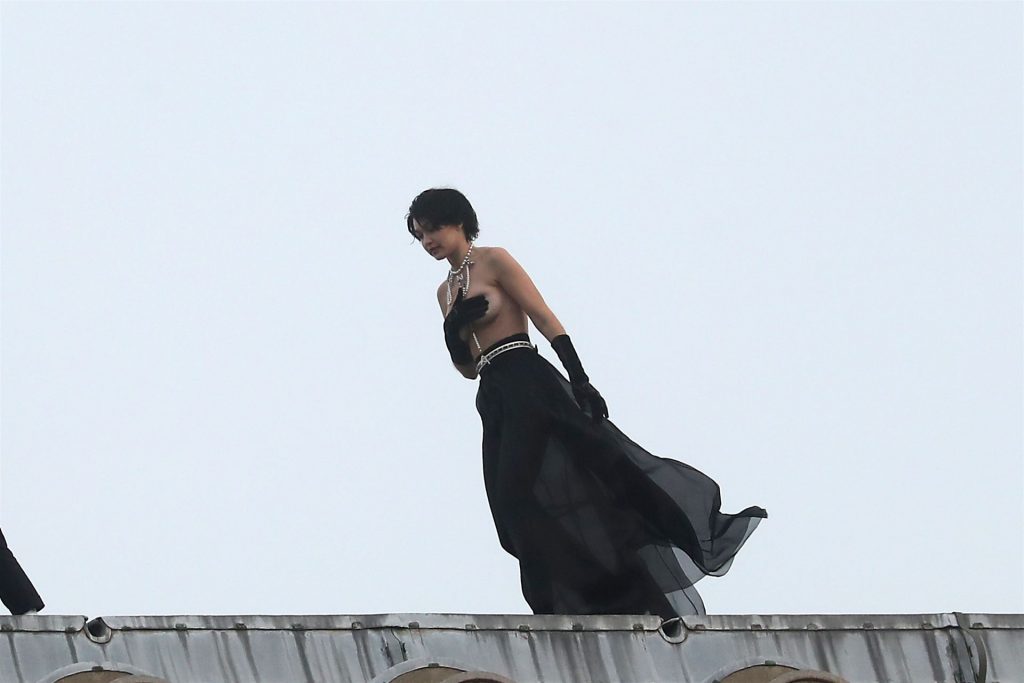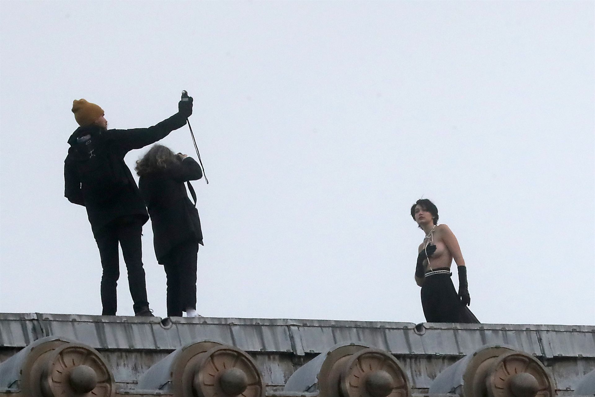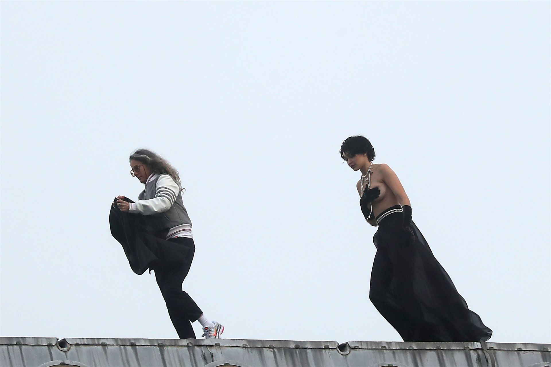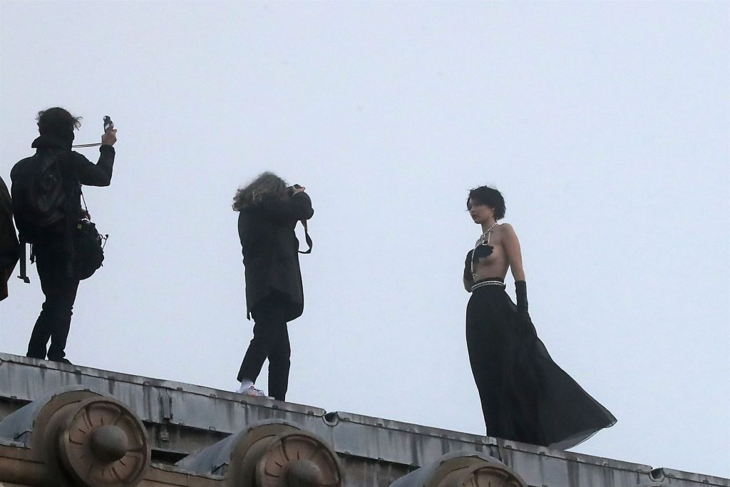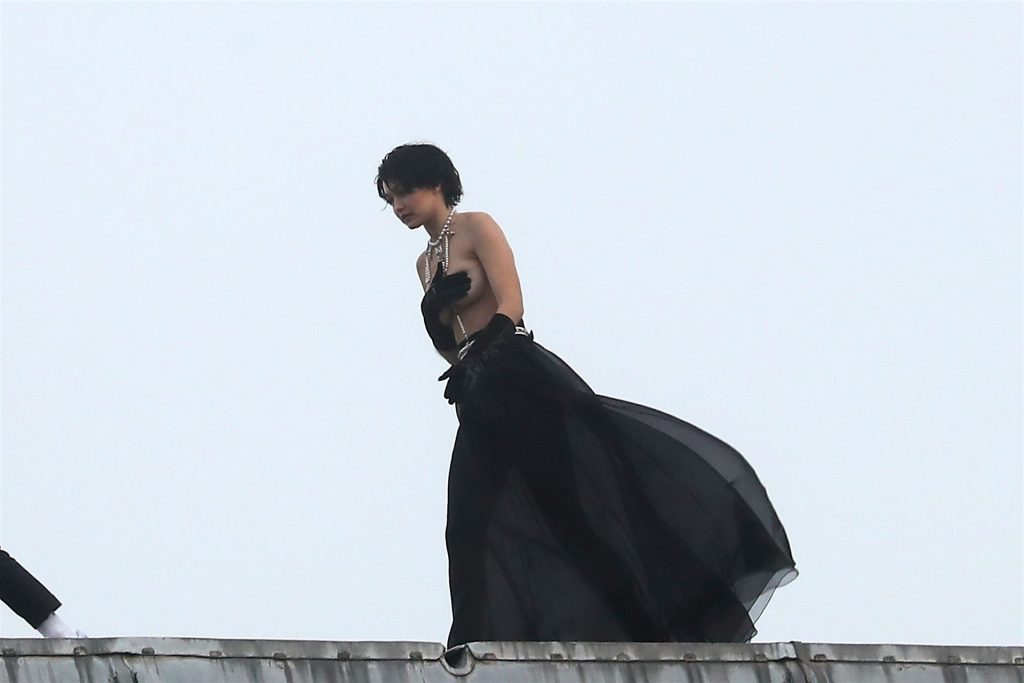 Model Gigi Hadid foi fotografada topless (coberta) com cabelo escuro durante uma sessão de fotos para a Chanel no telhado da Ópera Garnier em Paris no dia 3 de dezembro de 2019.