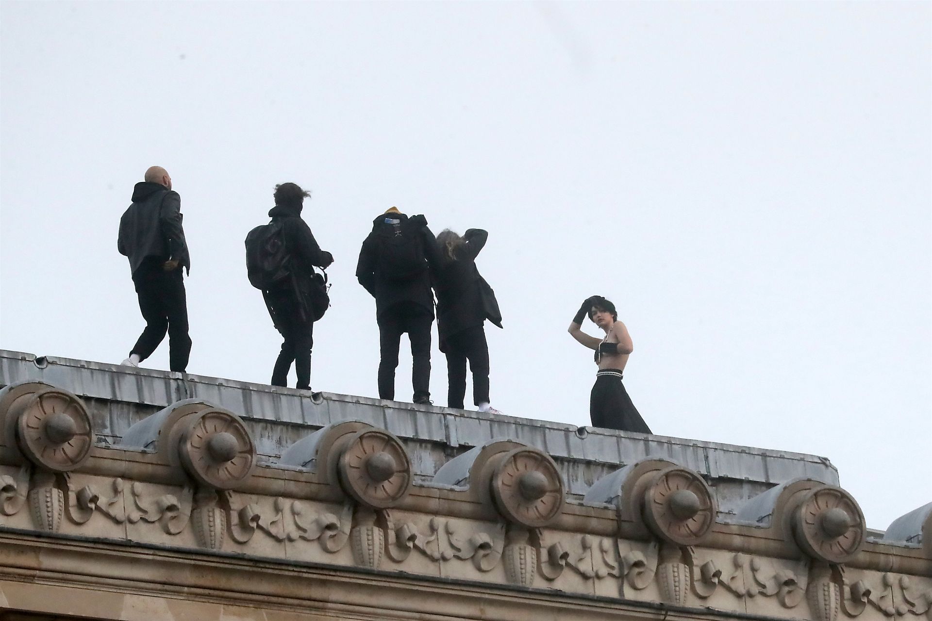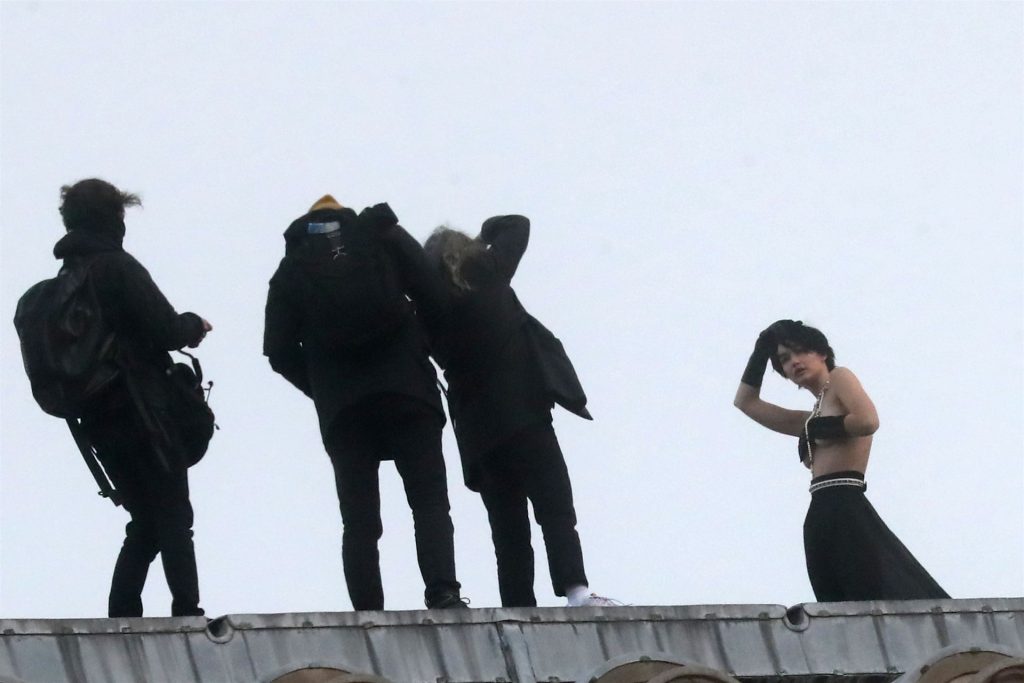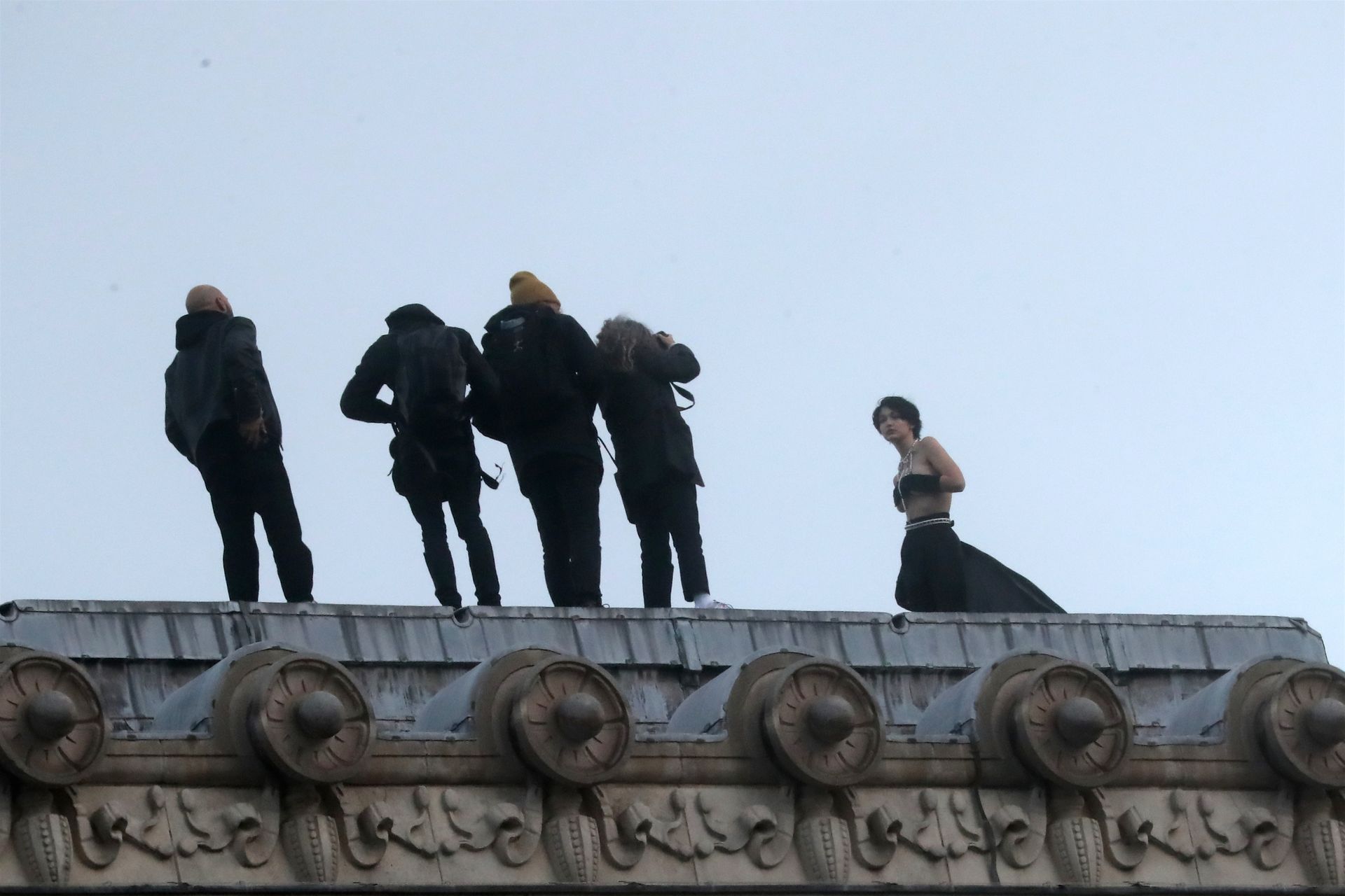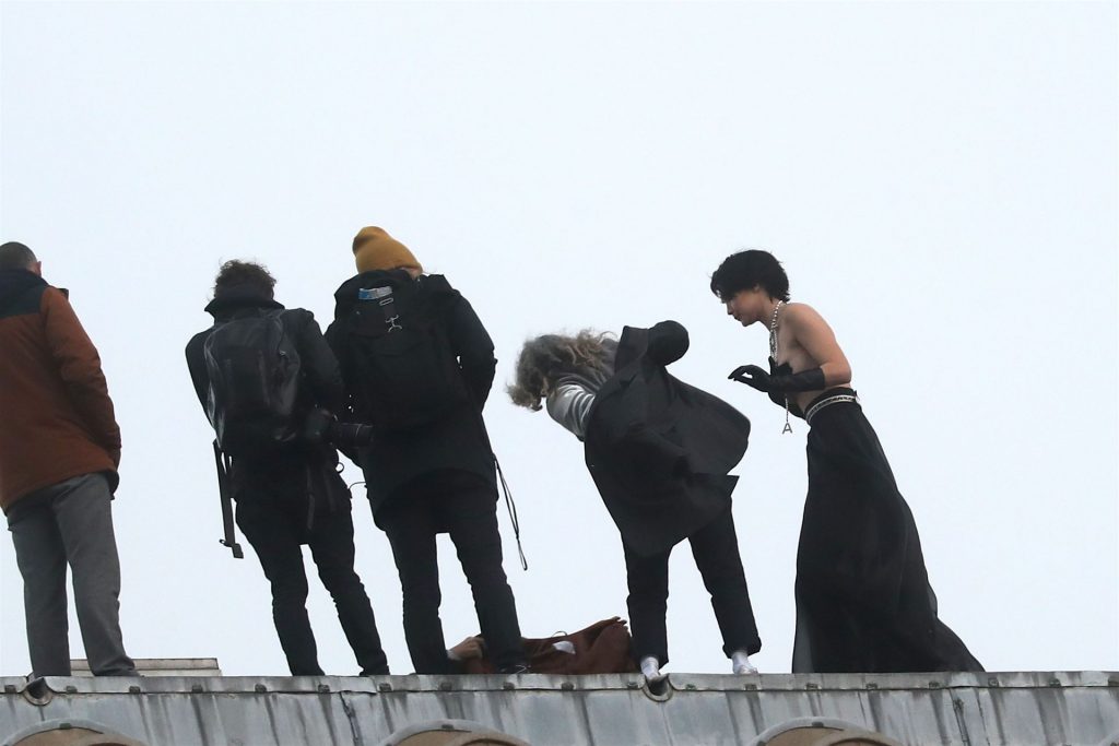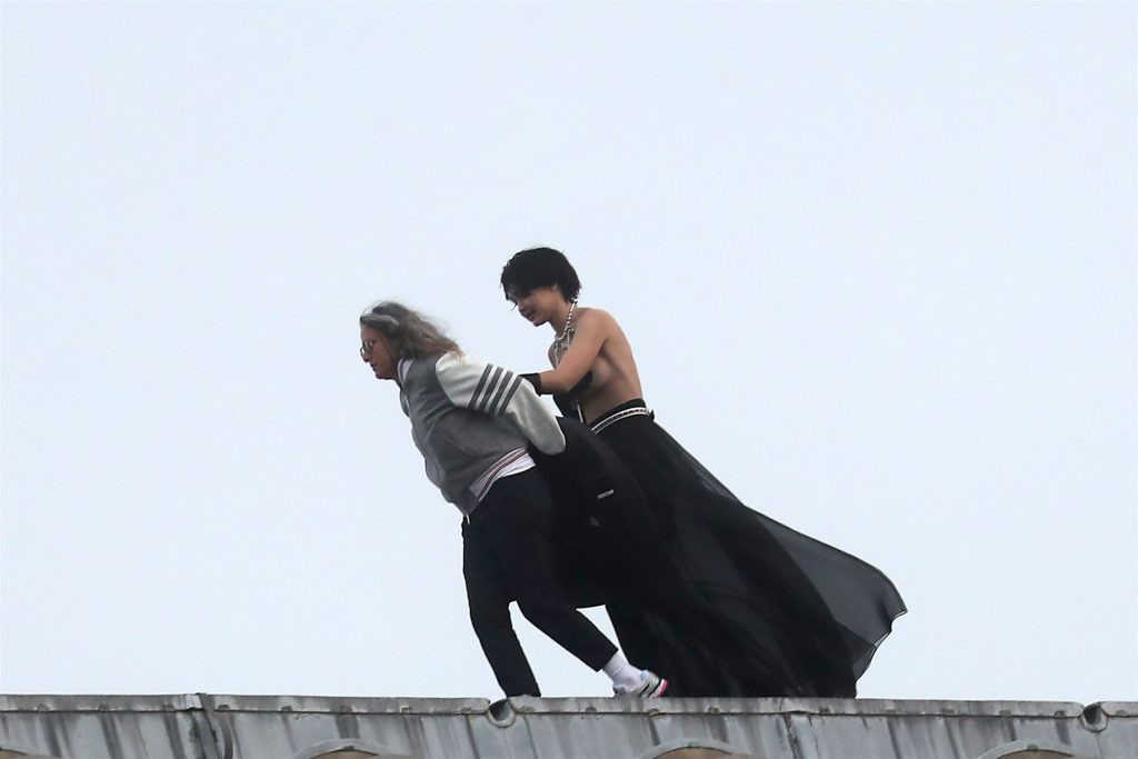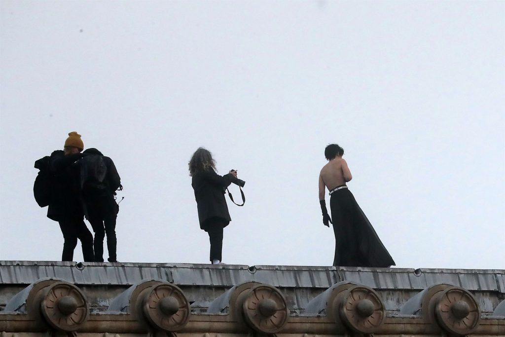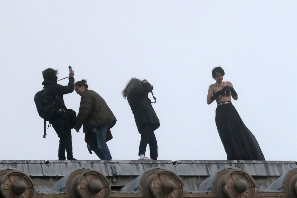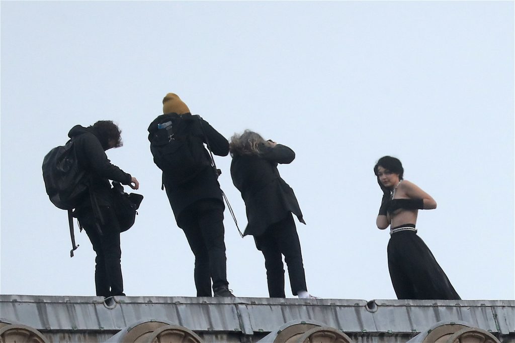 Model Gigi Hadid foi fotografada topless (coberta) com cabelo escuro durante uma sessão de fotos para a Chanel no telhado da Ópera Garnier em Paris no dia 3 de dezembro de 2019.