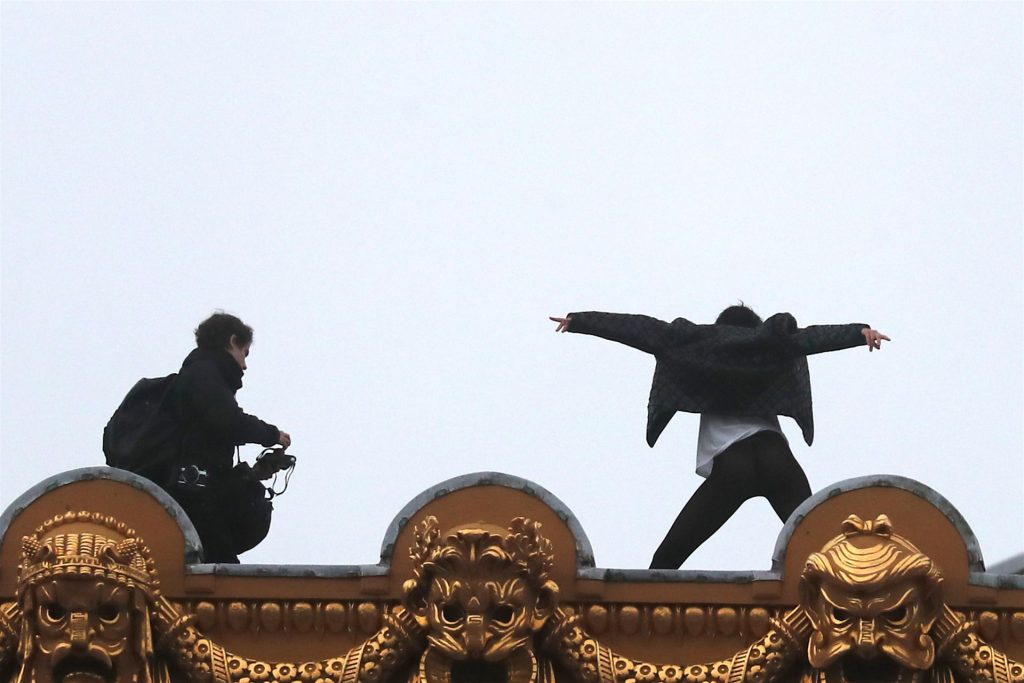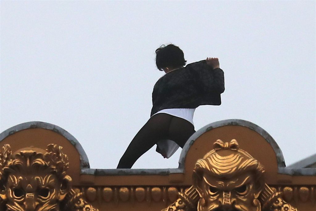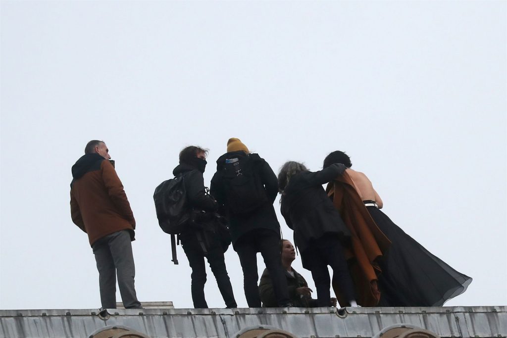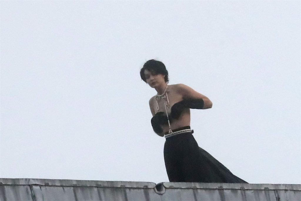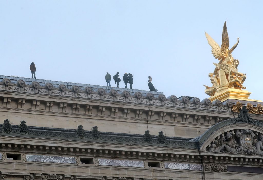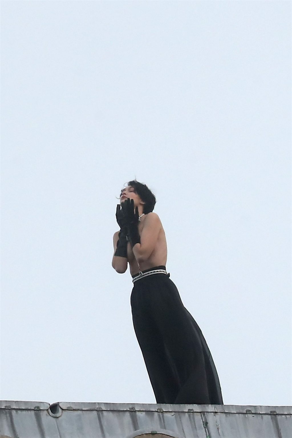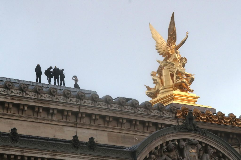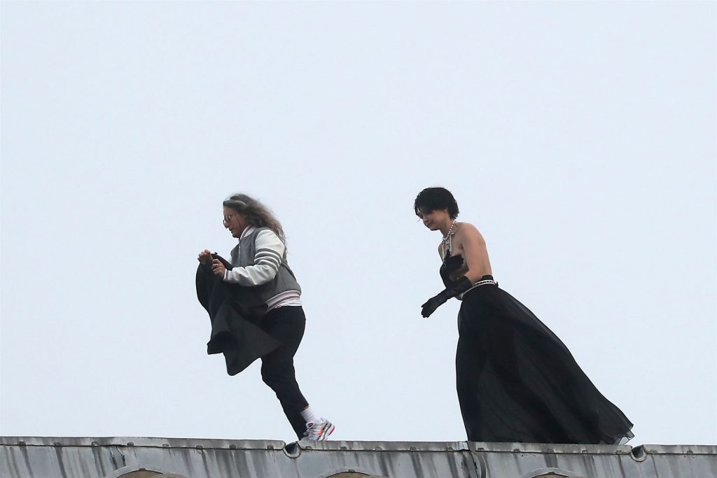 Model Gigi Hadid foi fotografada topless (coberta) com cabelo escuro durante uma sessão de fotos para a Chanel no telhado da Ópera Garnier em Paris no dia 3 de dezembro de 2019.