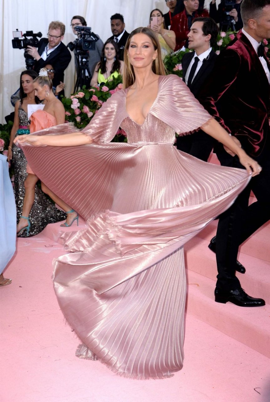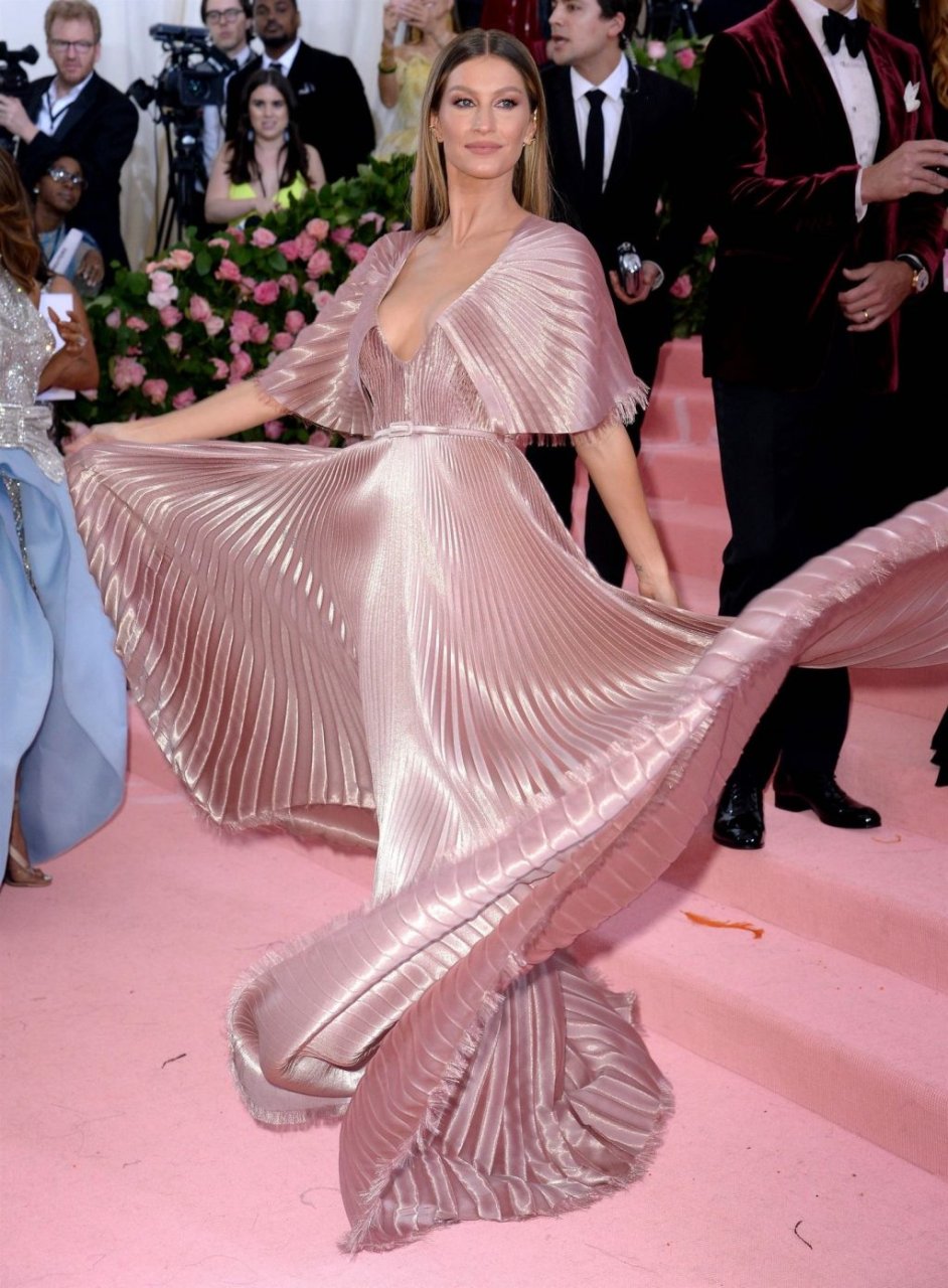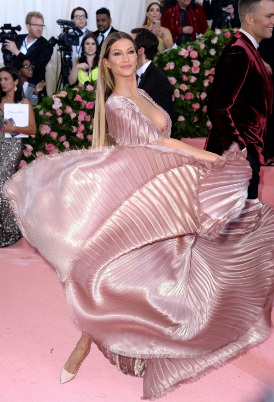 A supermodelo brasileira Gisele Bündchen exibiu seu decote usando um lindo vestido rosa no MET Gala 2019 em NYC, 06/05/2019. Ela apareceu no tapete rosa com seu marido, o jogador de futebol Tom Brady.