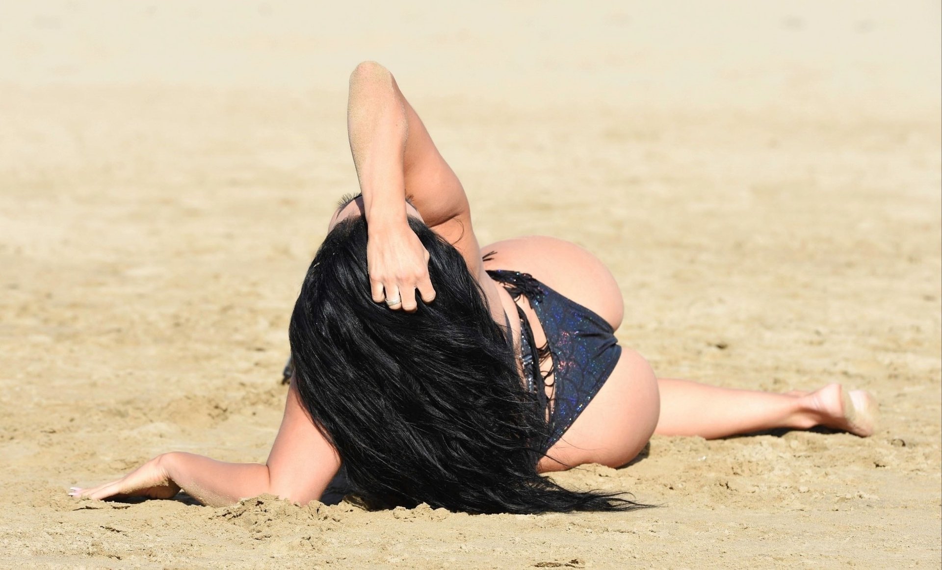 Modelo de glamour Grace J Teal (30) sofre um problema no guarda-roupa enquanto seus enormes atributos escapam do biquíni durante uma escapada na Espanha, 30/09/2018.