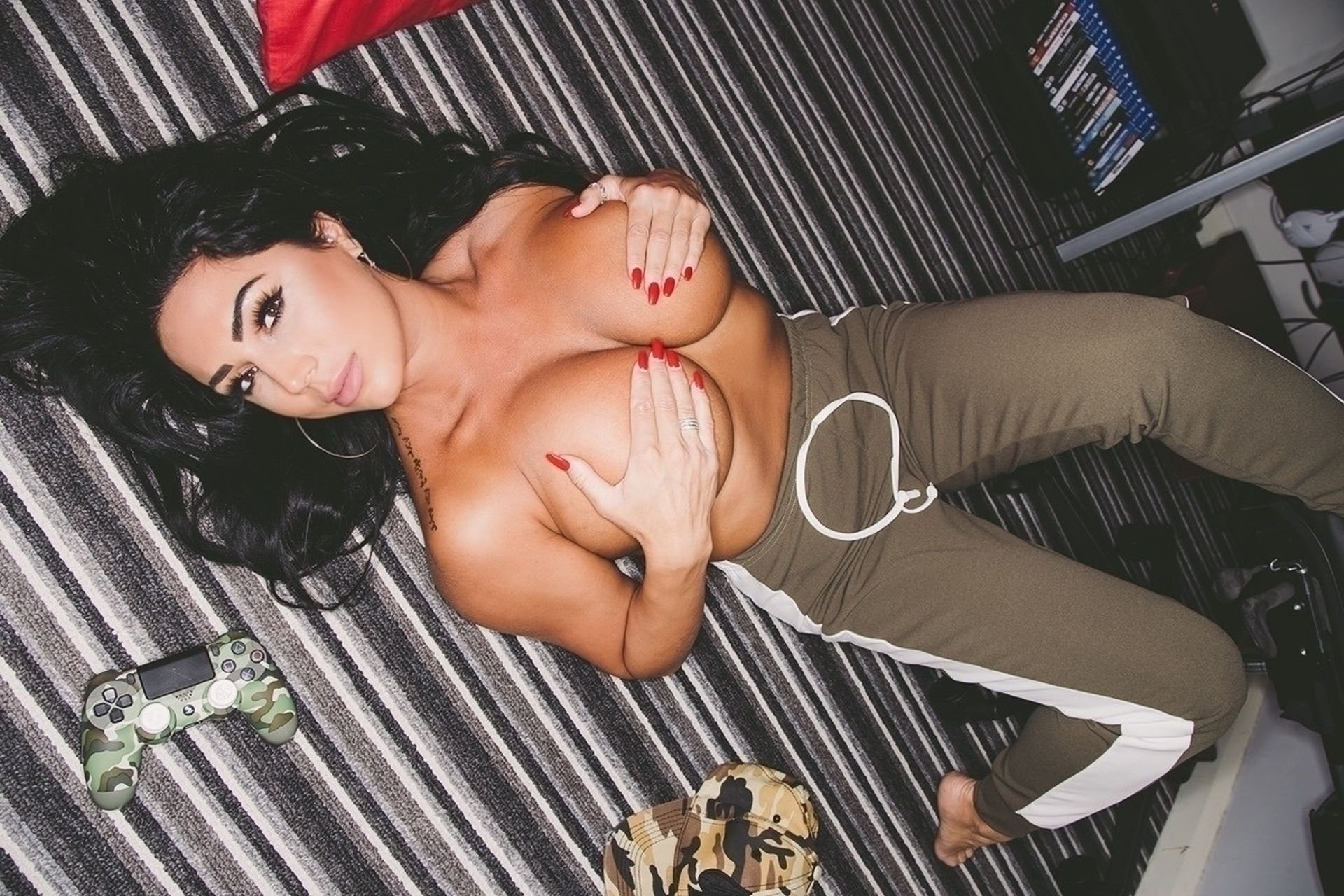 A deslumbrante modelo glamourosa e voluptuosa Grace J Teal aproveita um pouco de ação no PlayStation durante uma pausa em um ensaio fotográfico em Manchester, 17/10/2019.