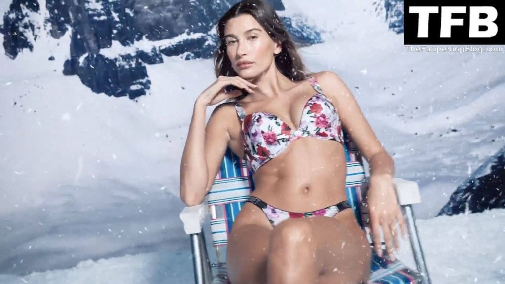 Hailey, 25, brinca em uma paisagem de inverno recriada no estúdio para os novos acessórios que apresentam sutiãs, calcinhas, bodies e mais. Um porta-voz disse que a nova linha tem “um brilho gelado.”