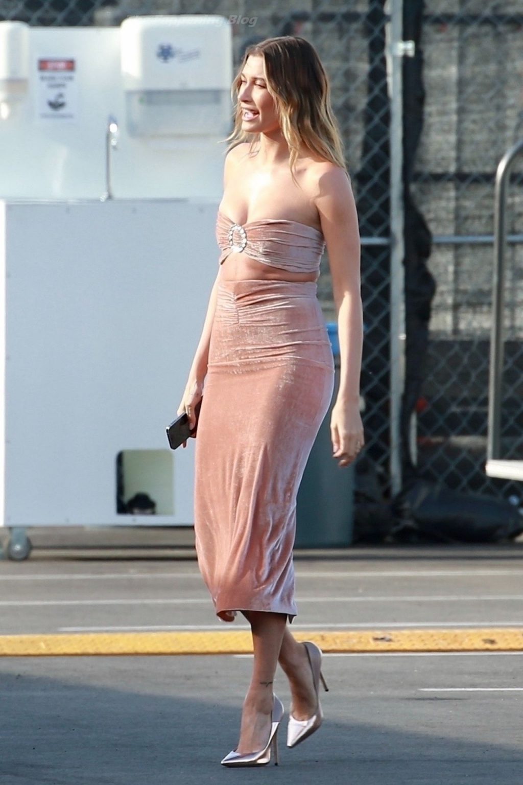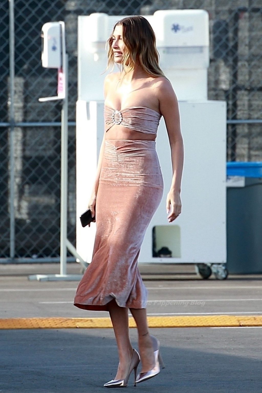 A esposa de Justin Bieber, Hailey Bieber, está incrível em um vestido de veludo rosa pérola com fenda, elegantemente chique, combinado com um top cropped combinando, acessórios com saltos metálicos rosa pérola e um conjunto de brincos de diamante sofisticados em Santa Monica, 10/03/2021.