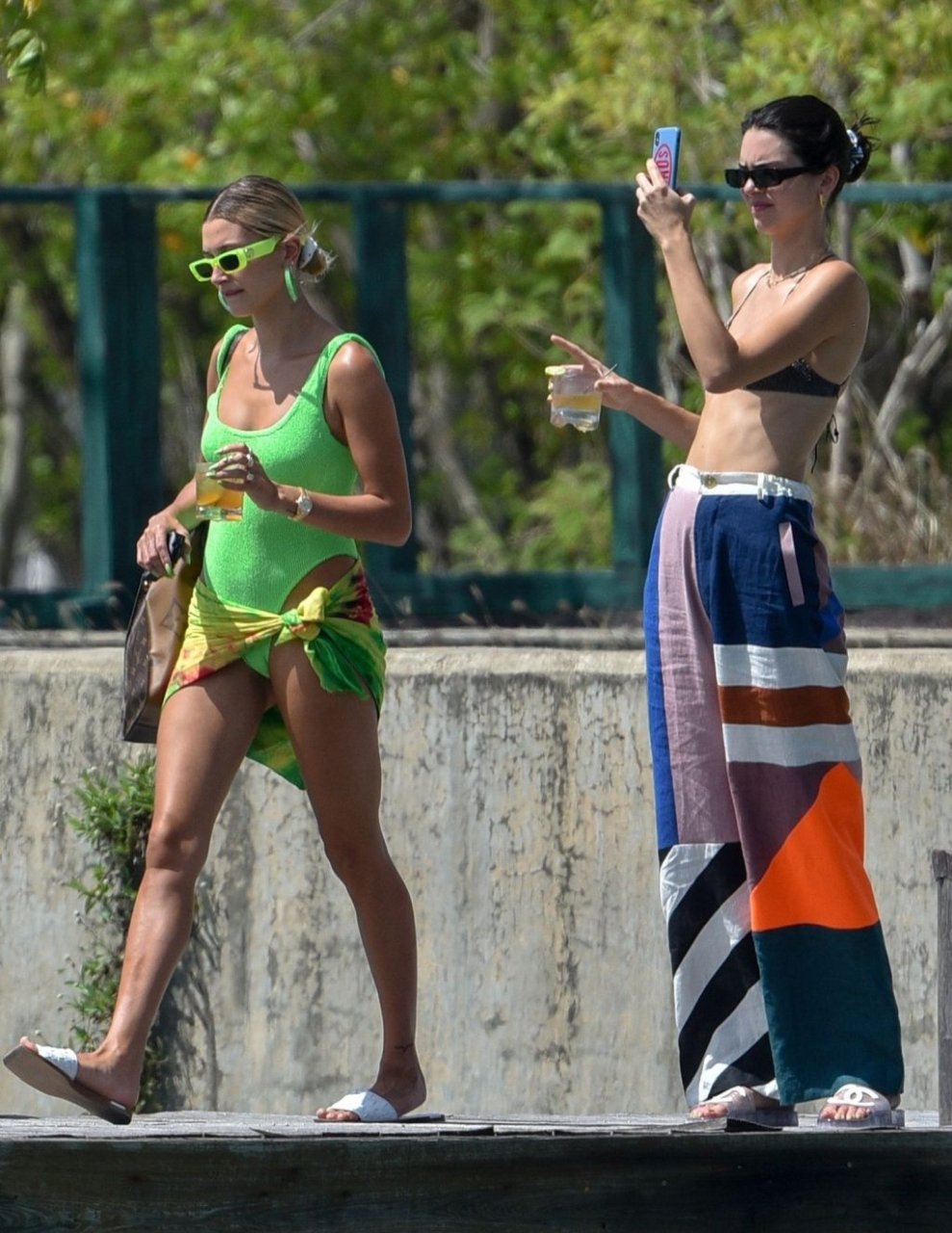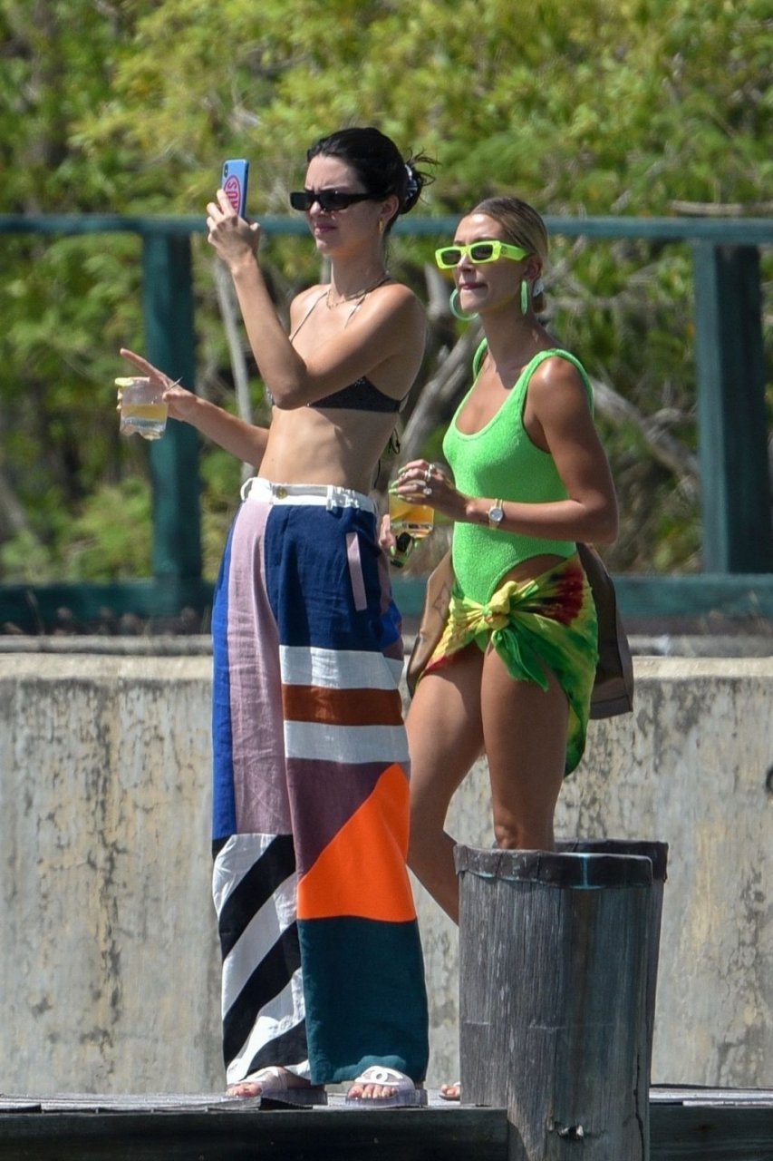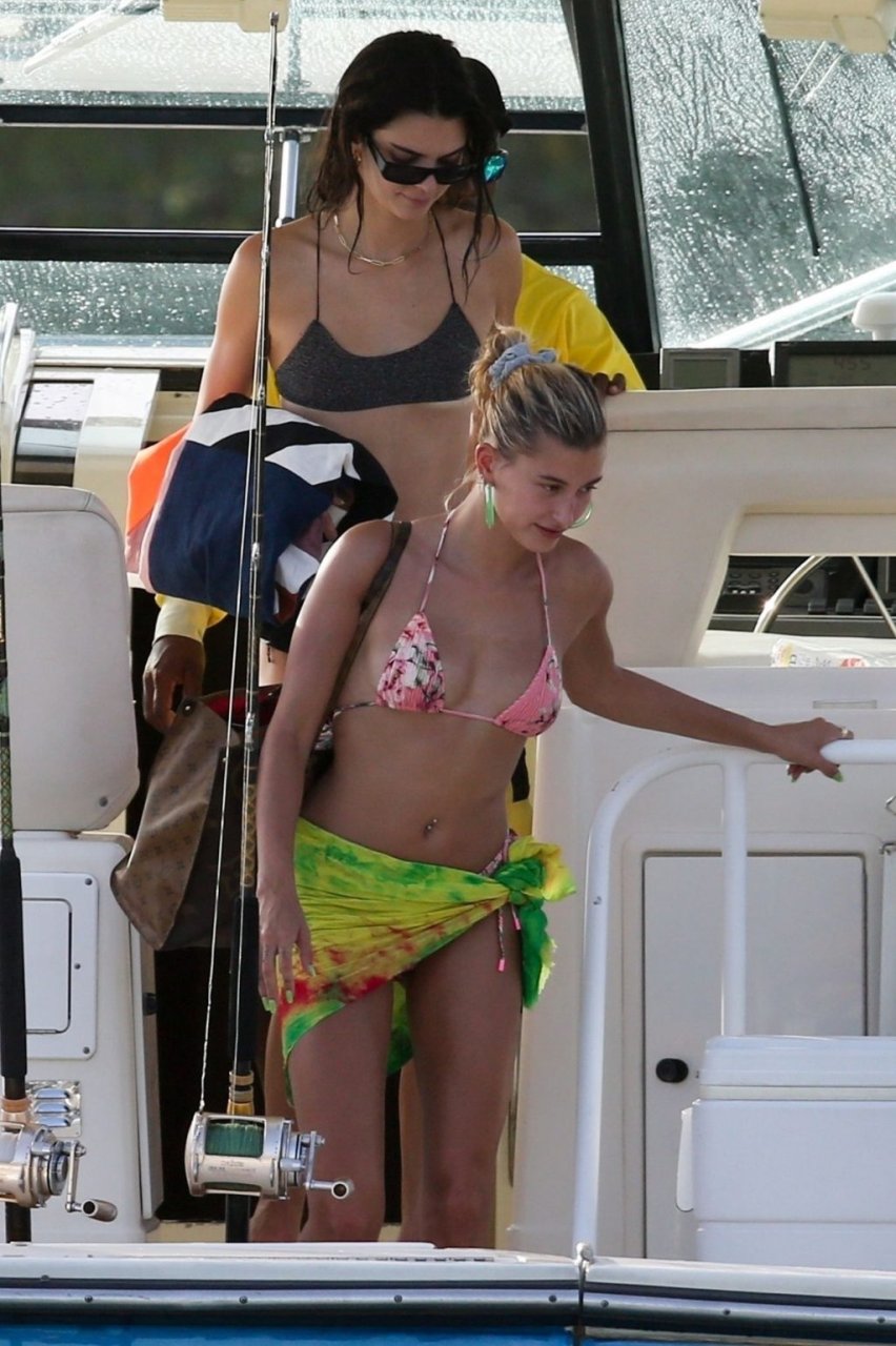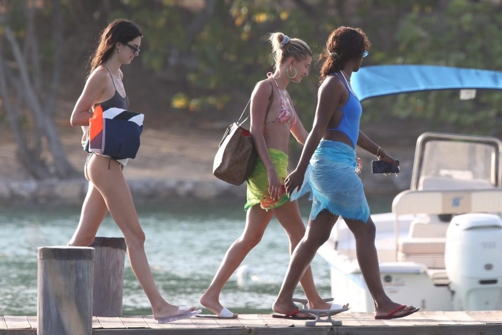 Hailey Bieber, Kendall Jenner e Justine Skye aproveitam coquetéis e bronzeado em um barco, em uma festa que parece ser a despedida de solteira de Hailey na Jamaica, 26/08/2019.