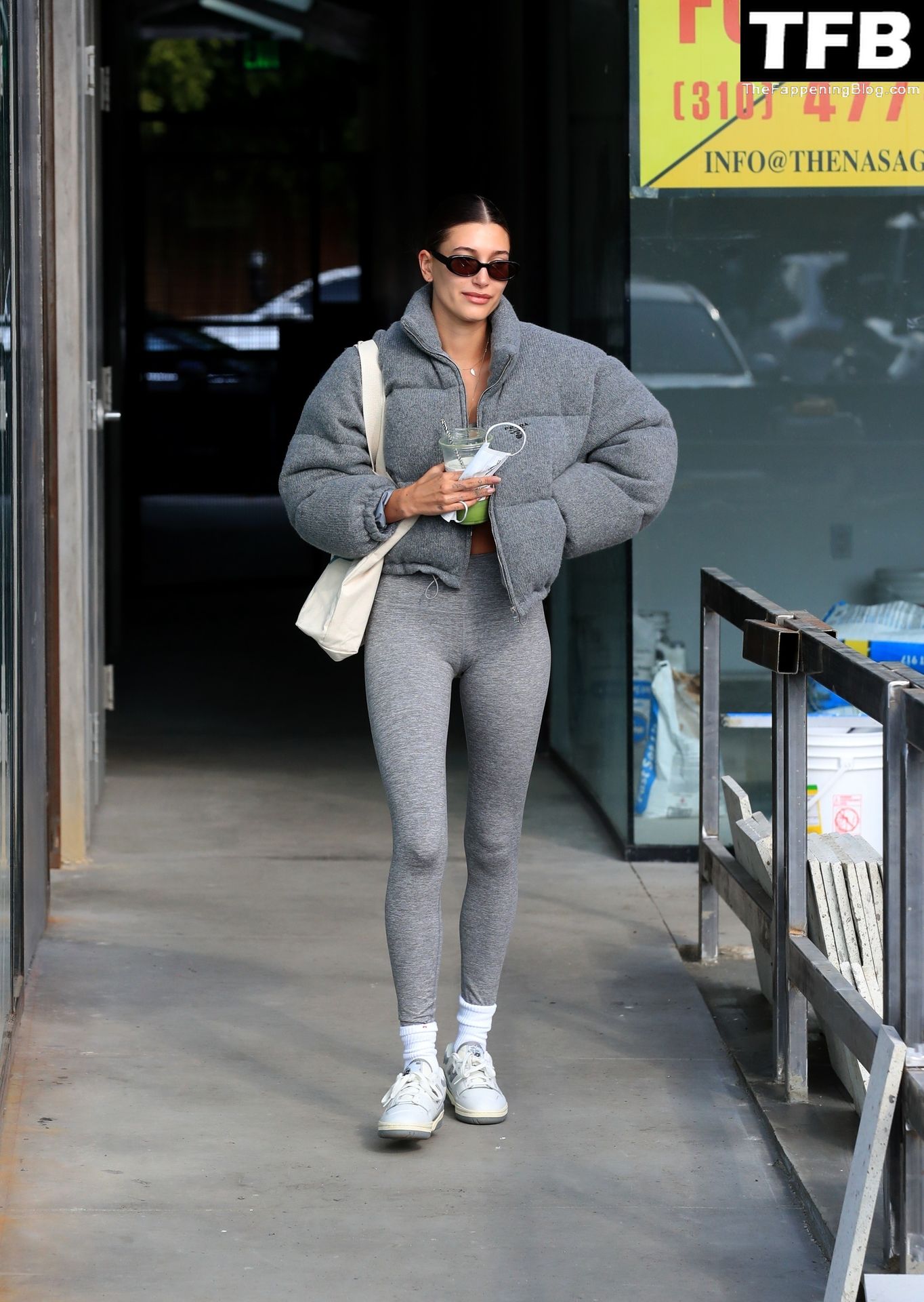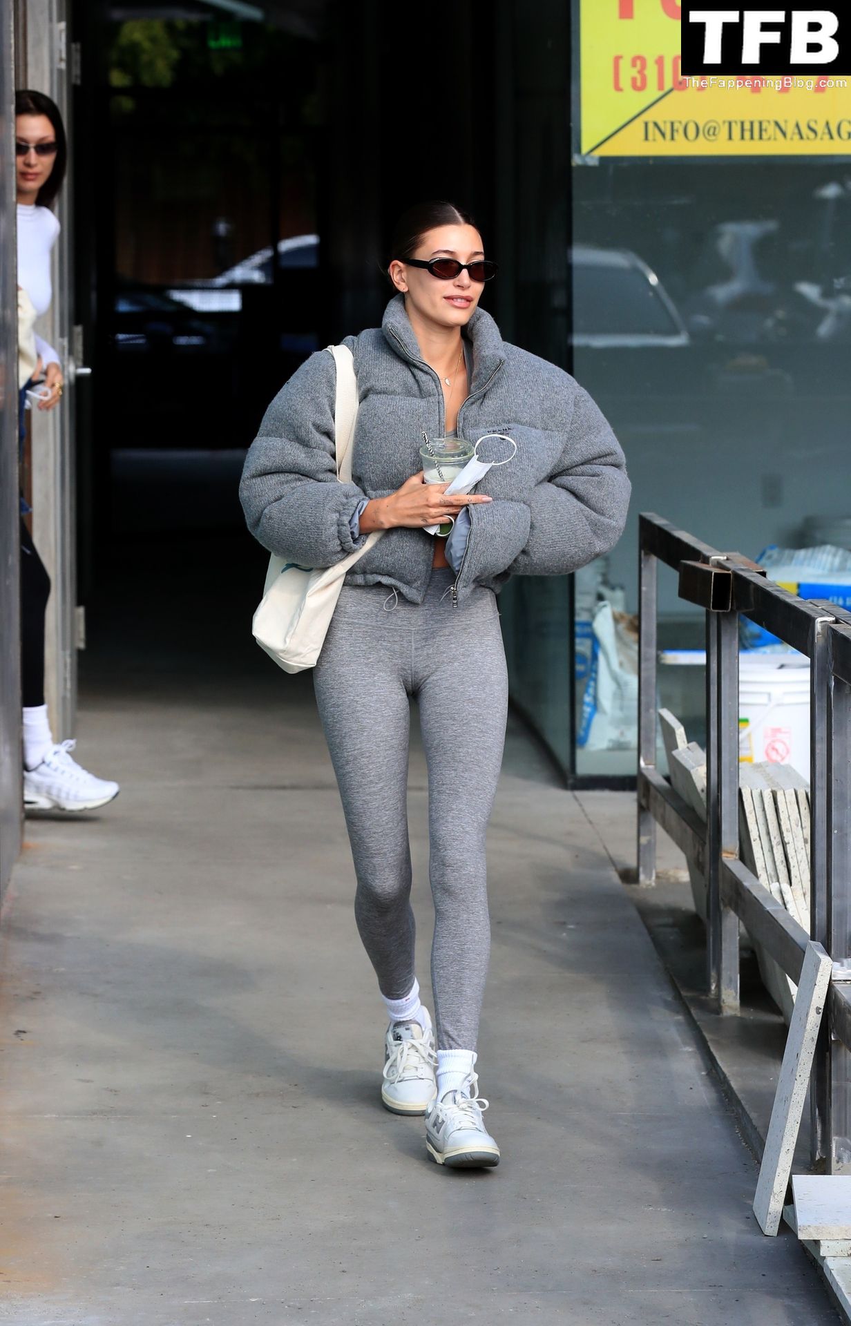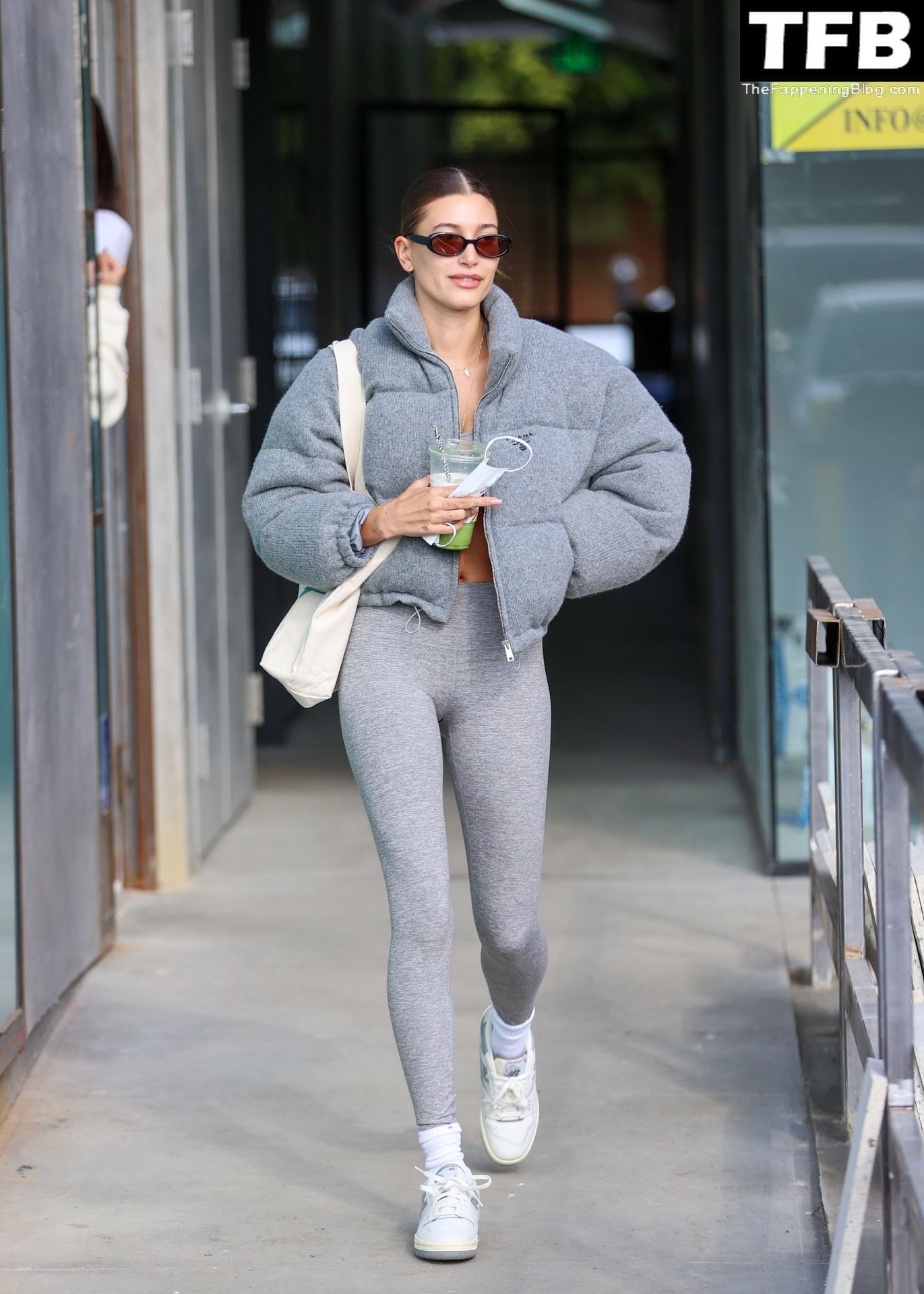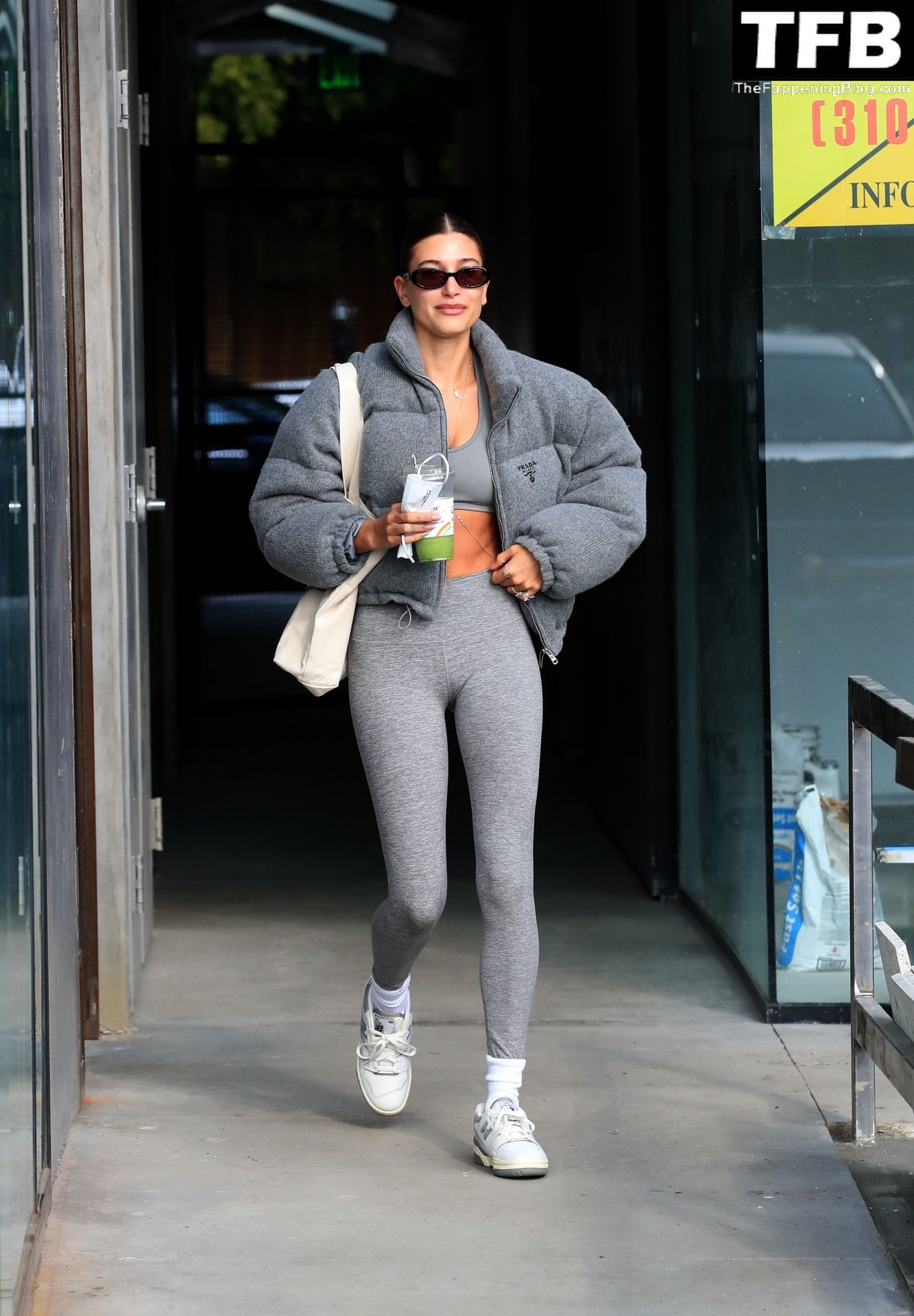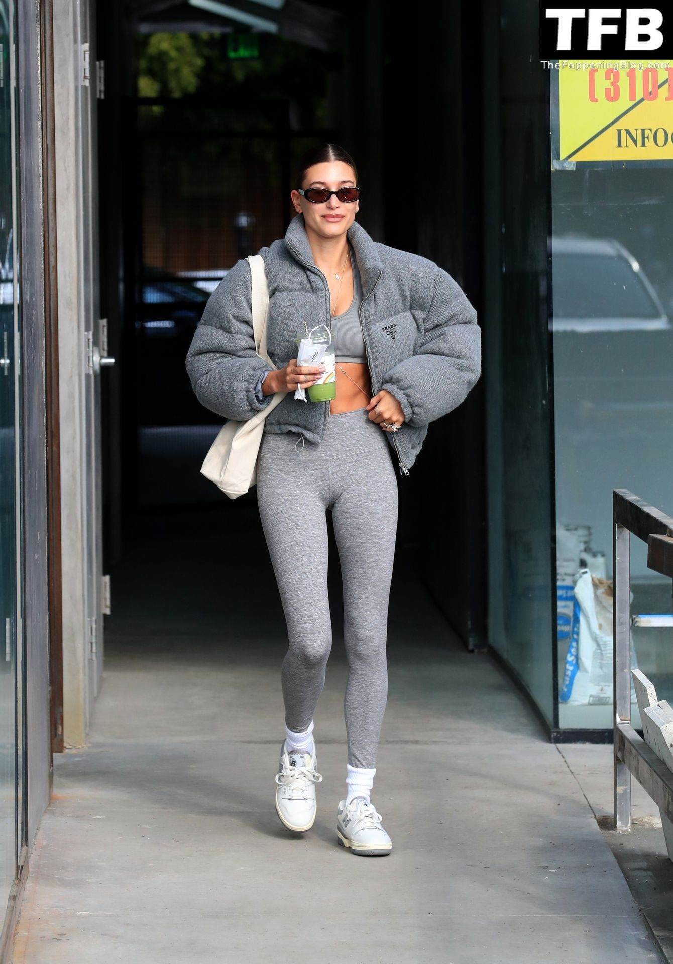 Jovem modelo Hailey Bieber termina uma aula de Pilates em Los Angeles, 01/08/2022.