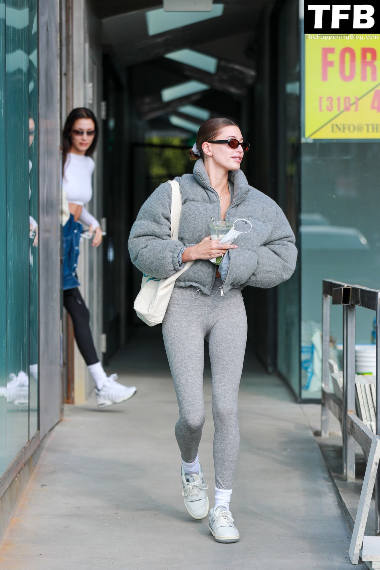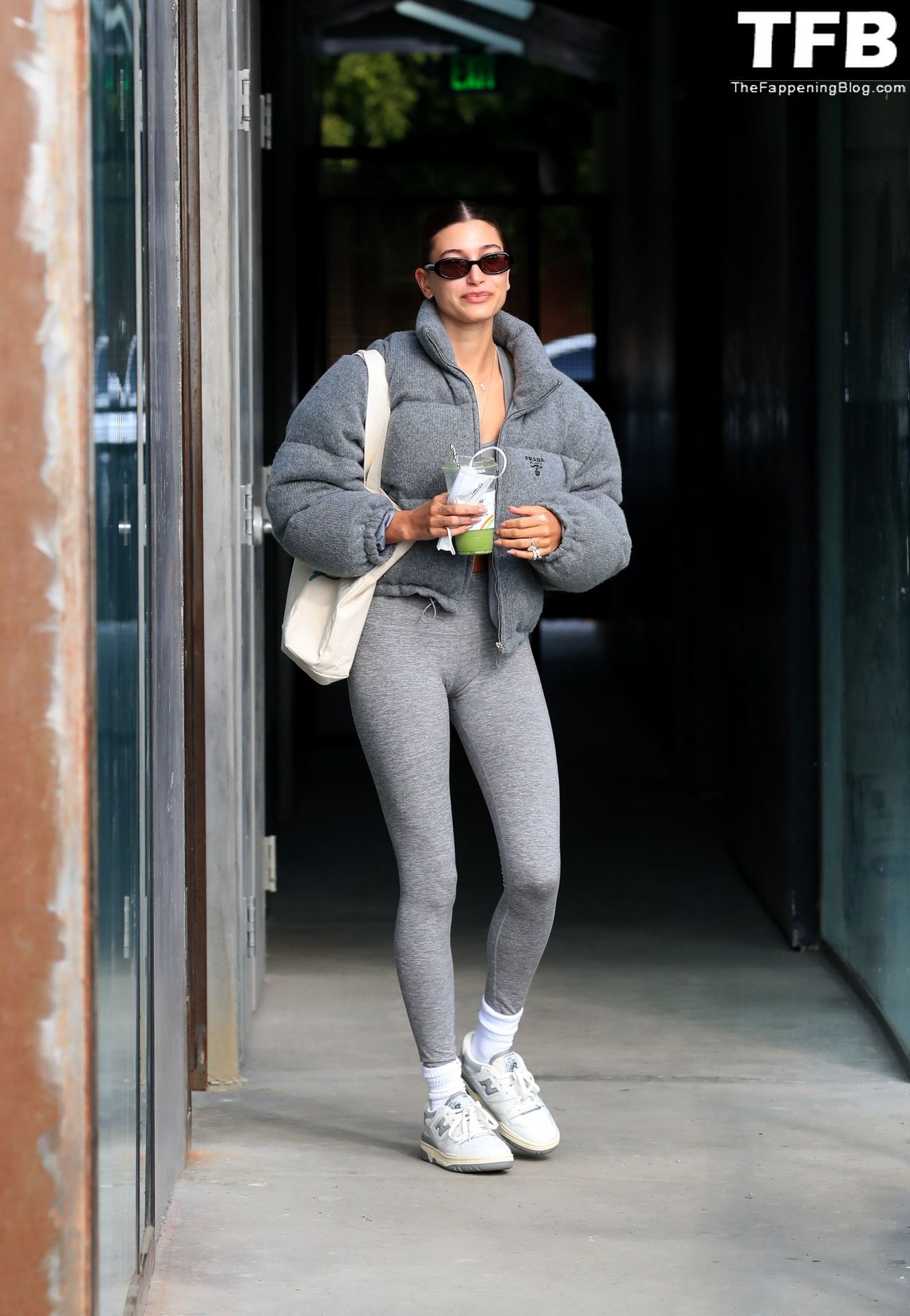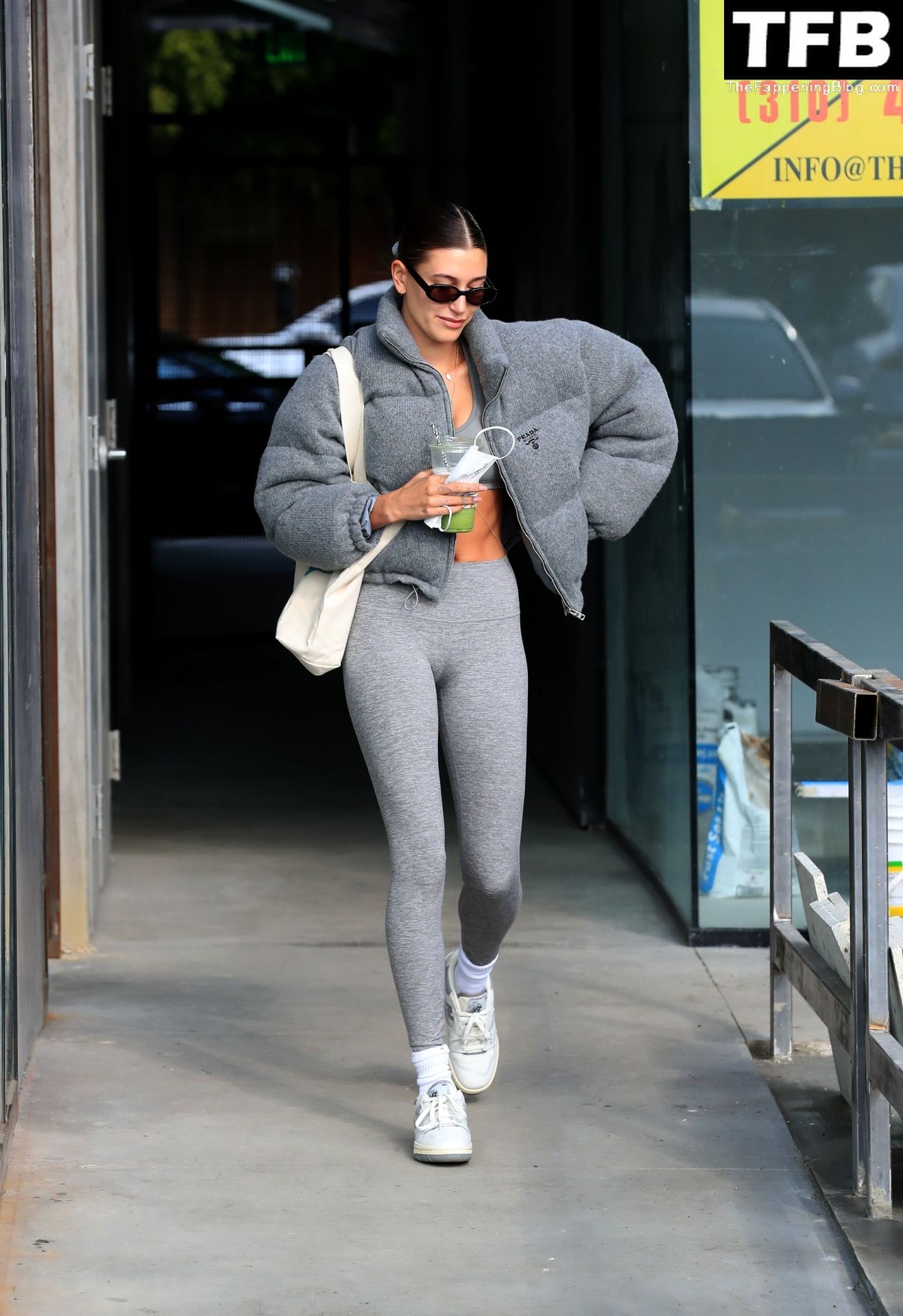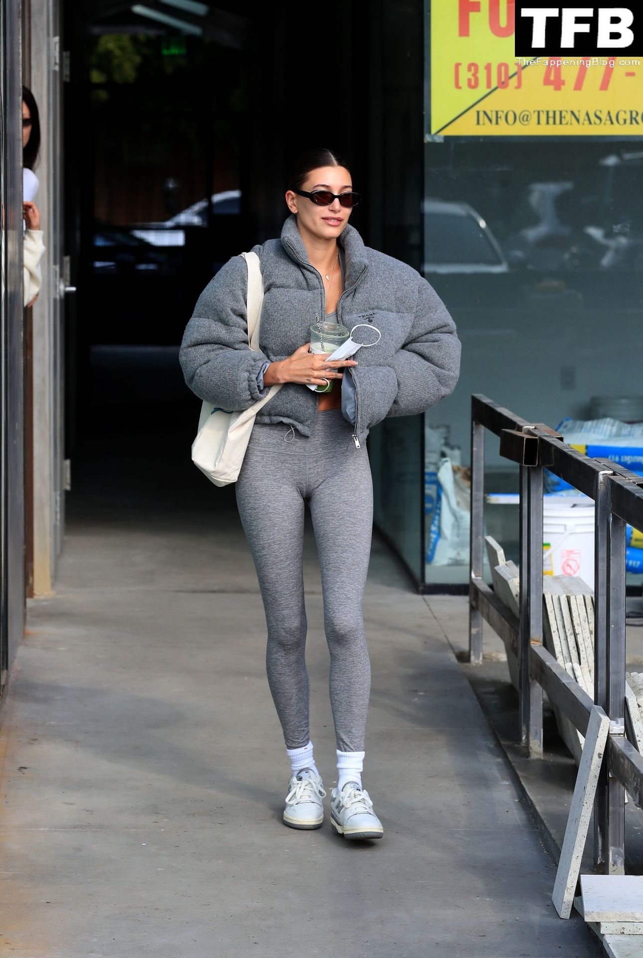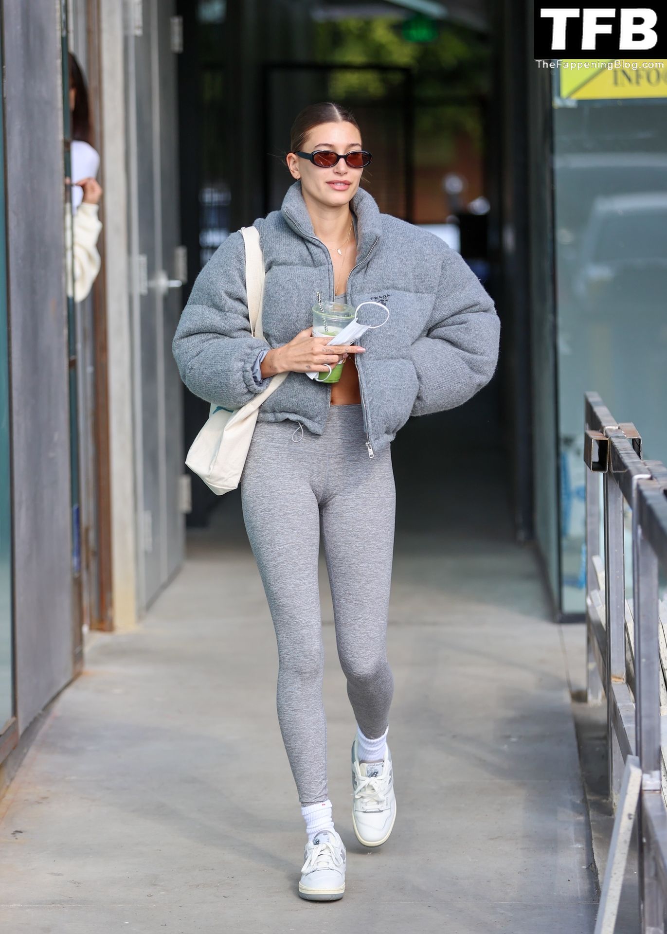 Jovem modelo Hailey Bieber termina uma aula de Pilates em Los Angeles, 01/08/2022.