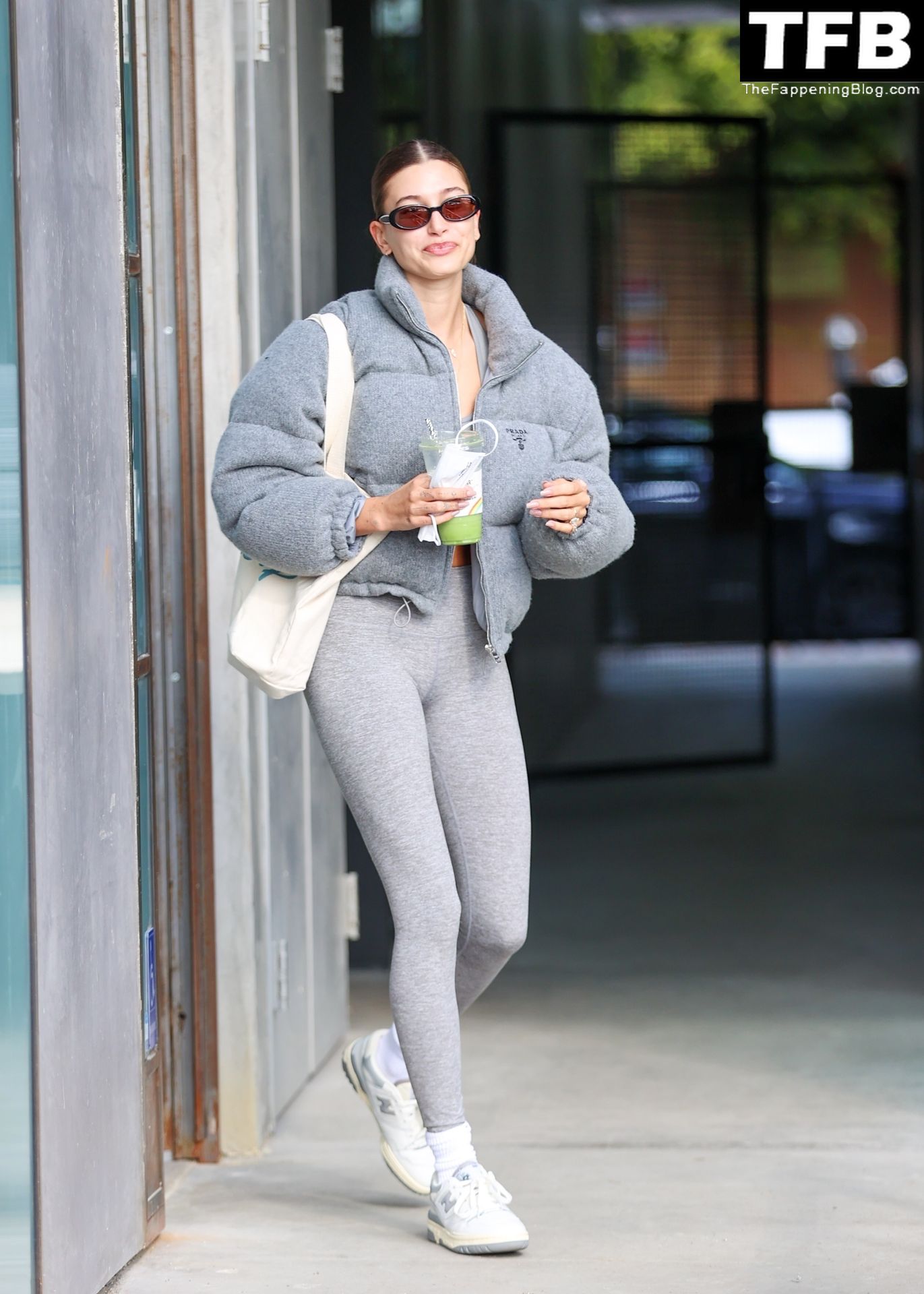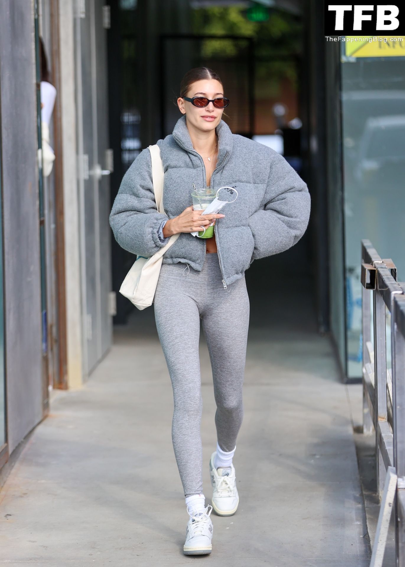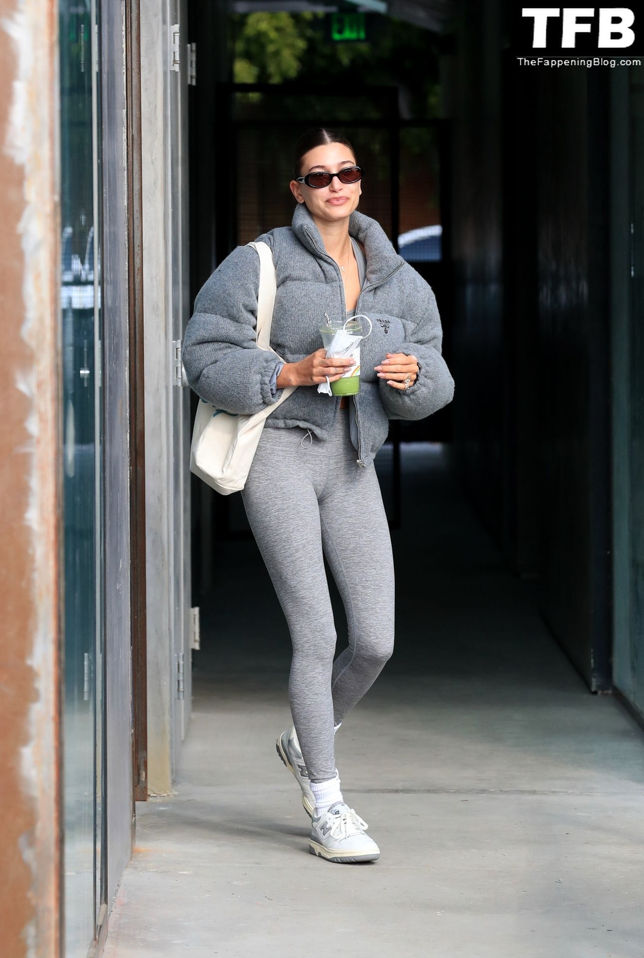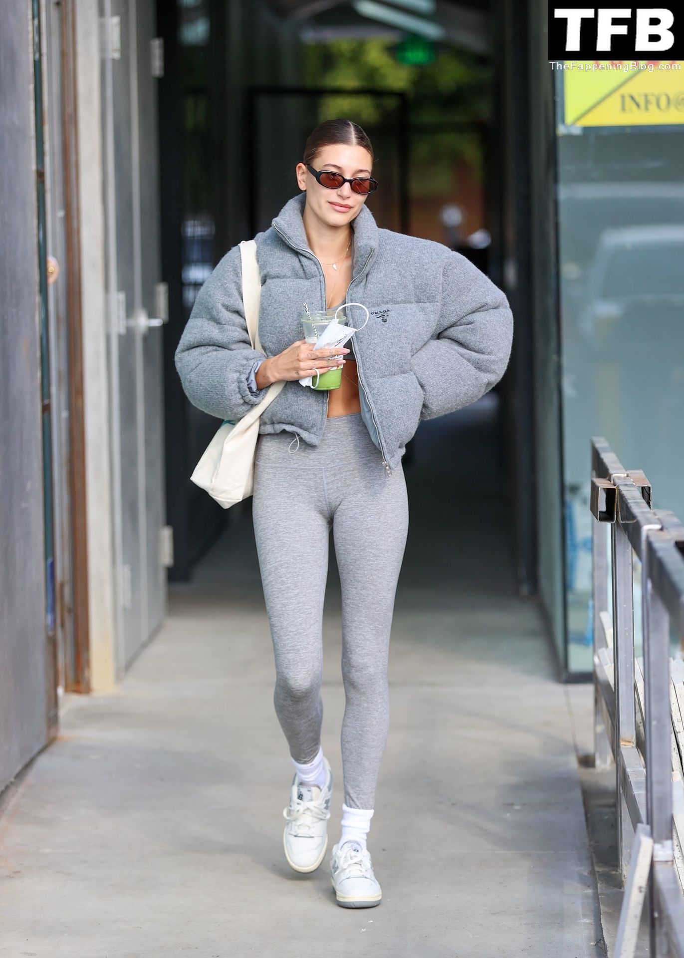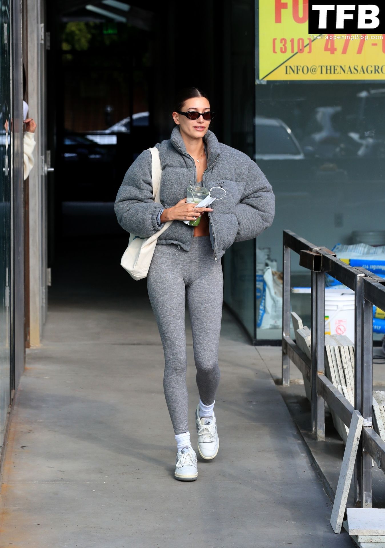 Jovem modelo Hailey Bieber termina uma aula de Pilates em Los Angeles, 01/08/2022.