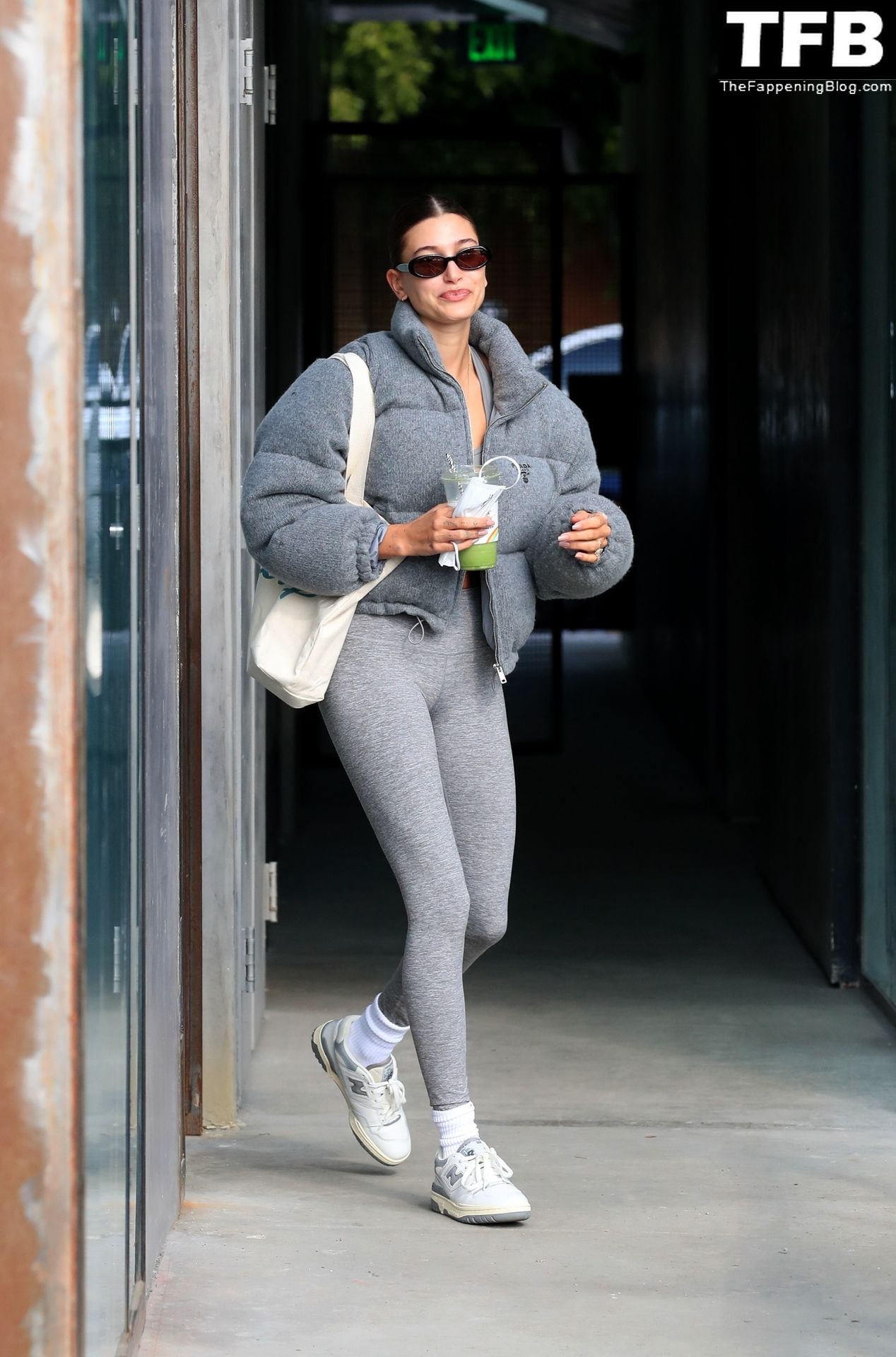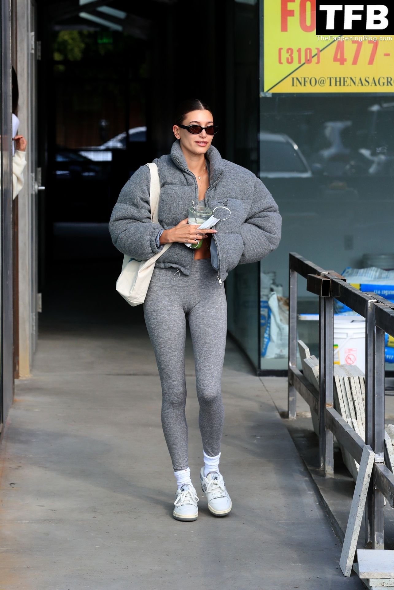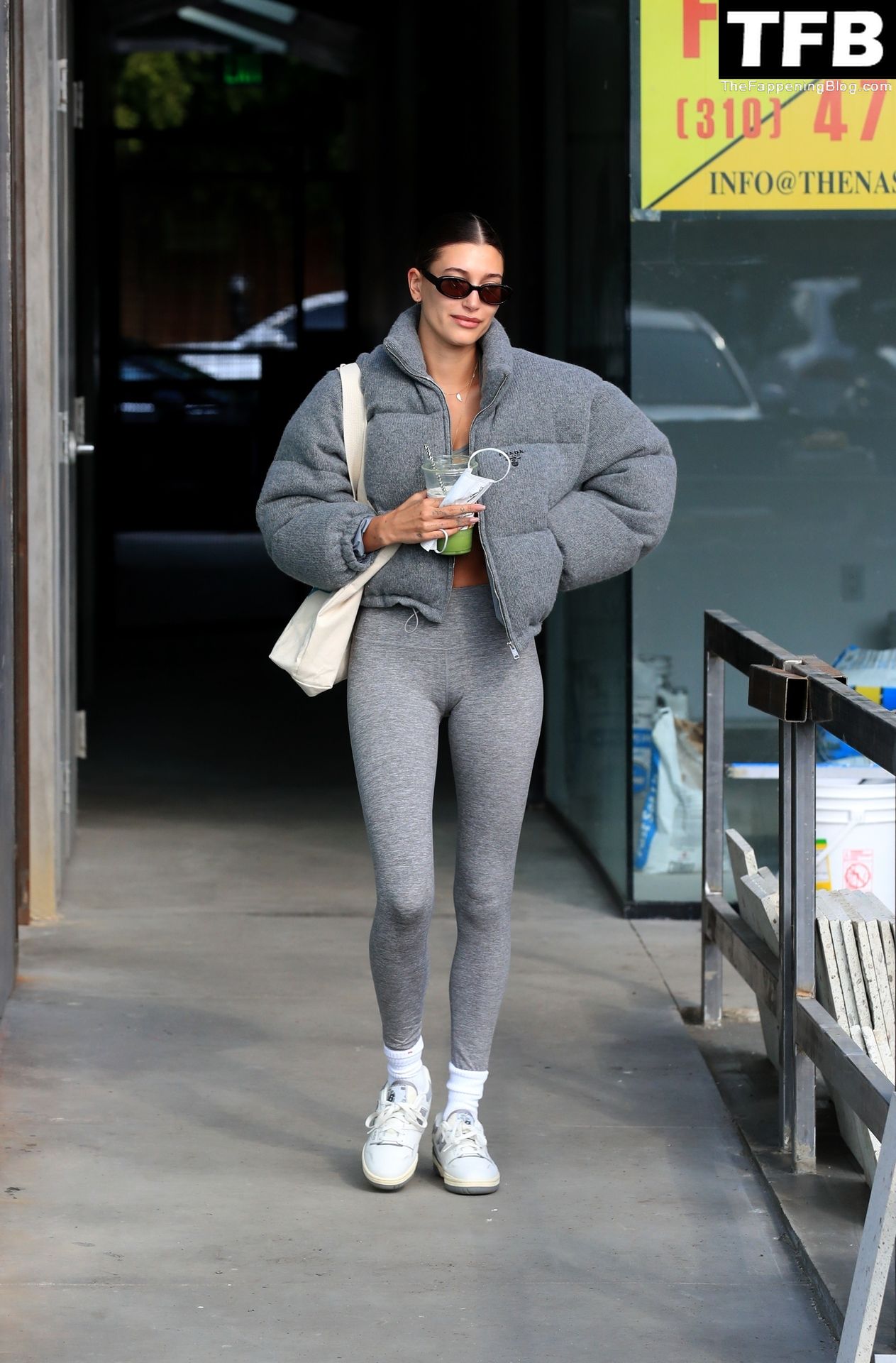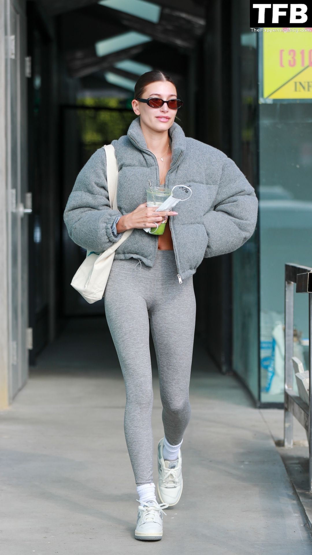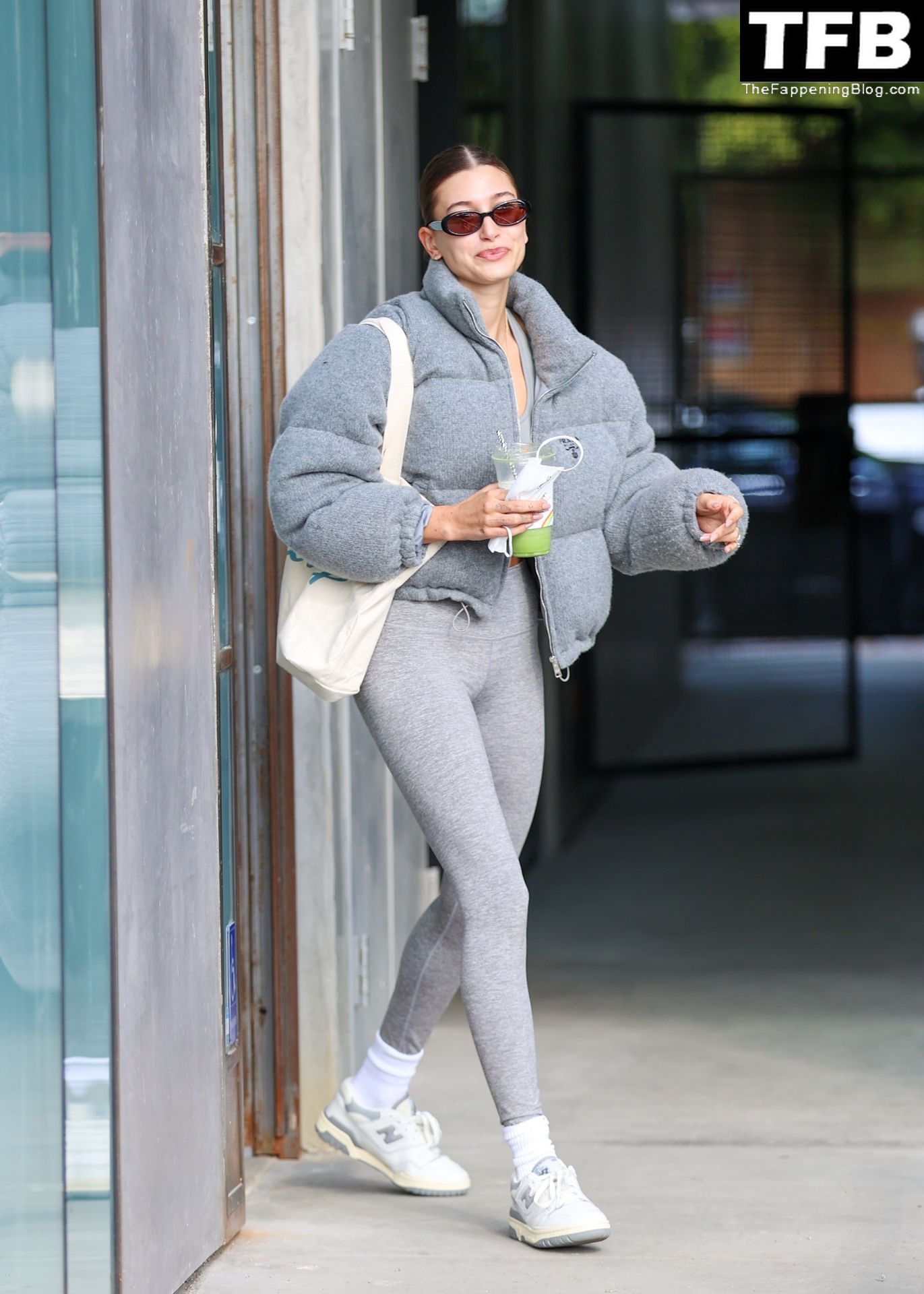 Jovem modelo Hailey Bieber termina uma aula de Pilates em Los Angeles, 01/08/2022.