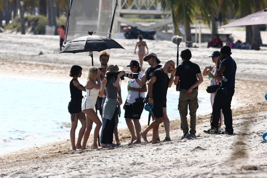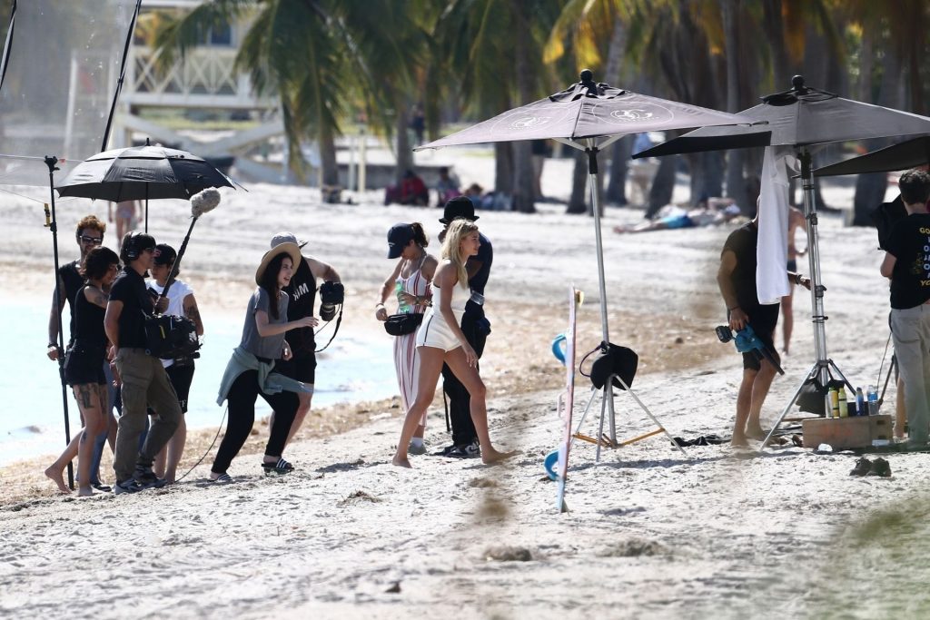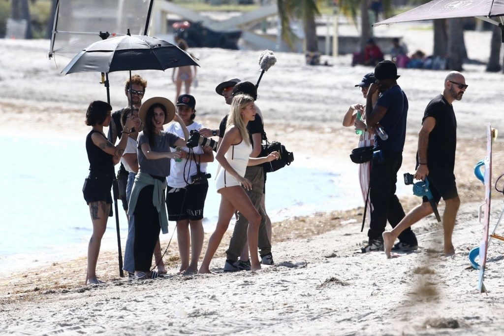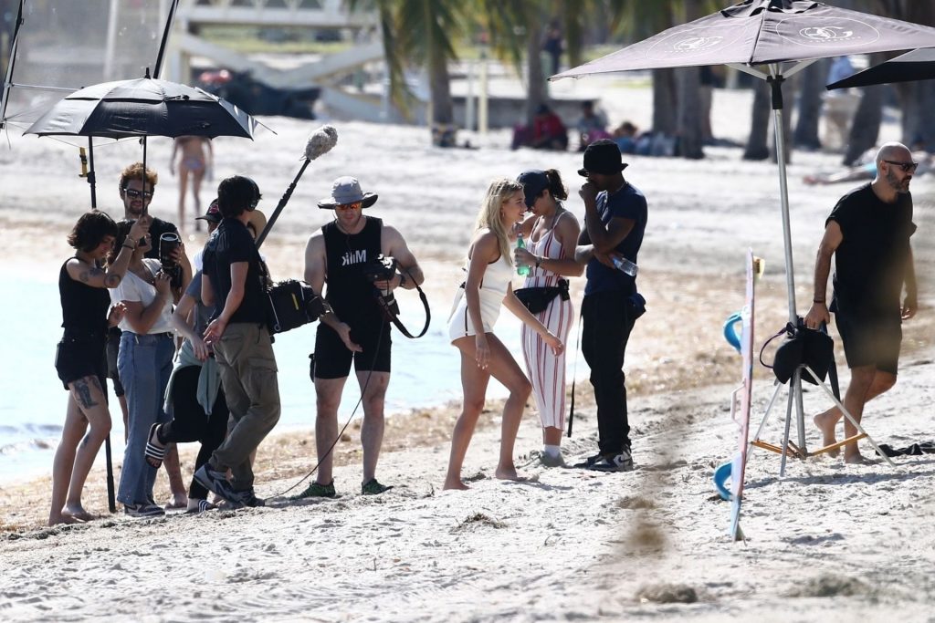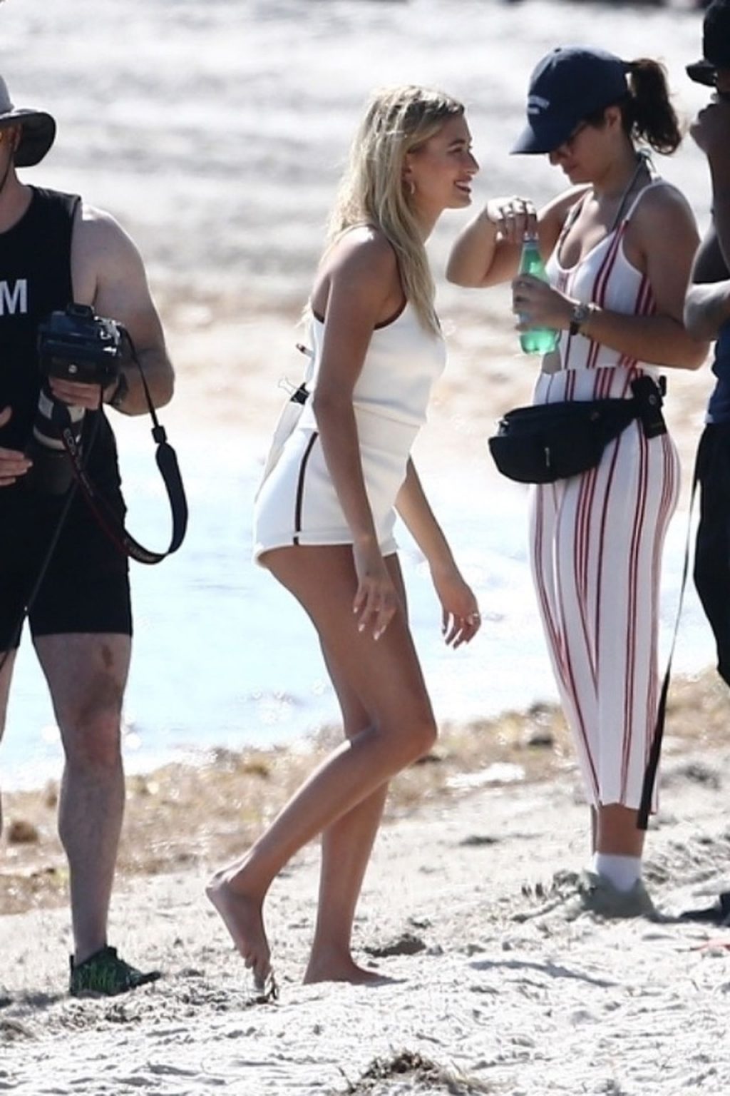 Model Hailey Bieber posa para uma sessão de fotos enquanto visita as praias de Miami, 27/11/2019. Hailey parece casual com uma regata branca combinando e shorts para o passeio.