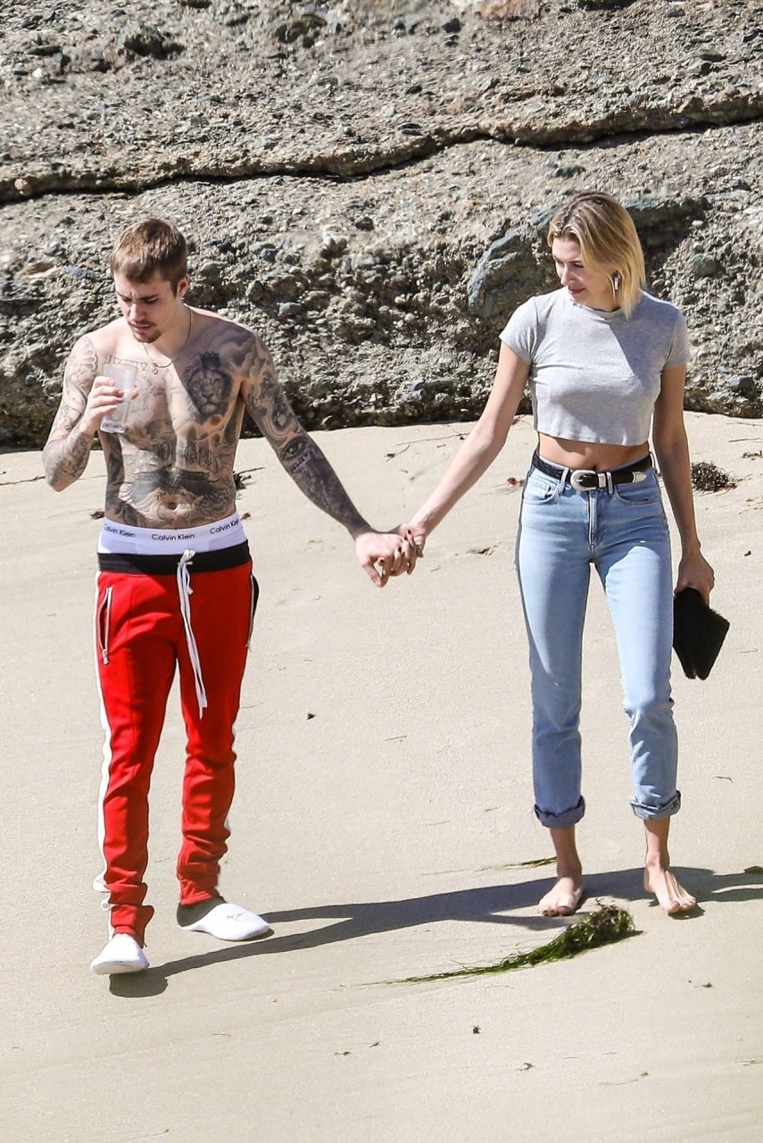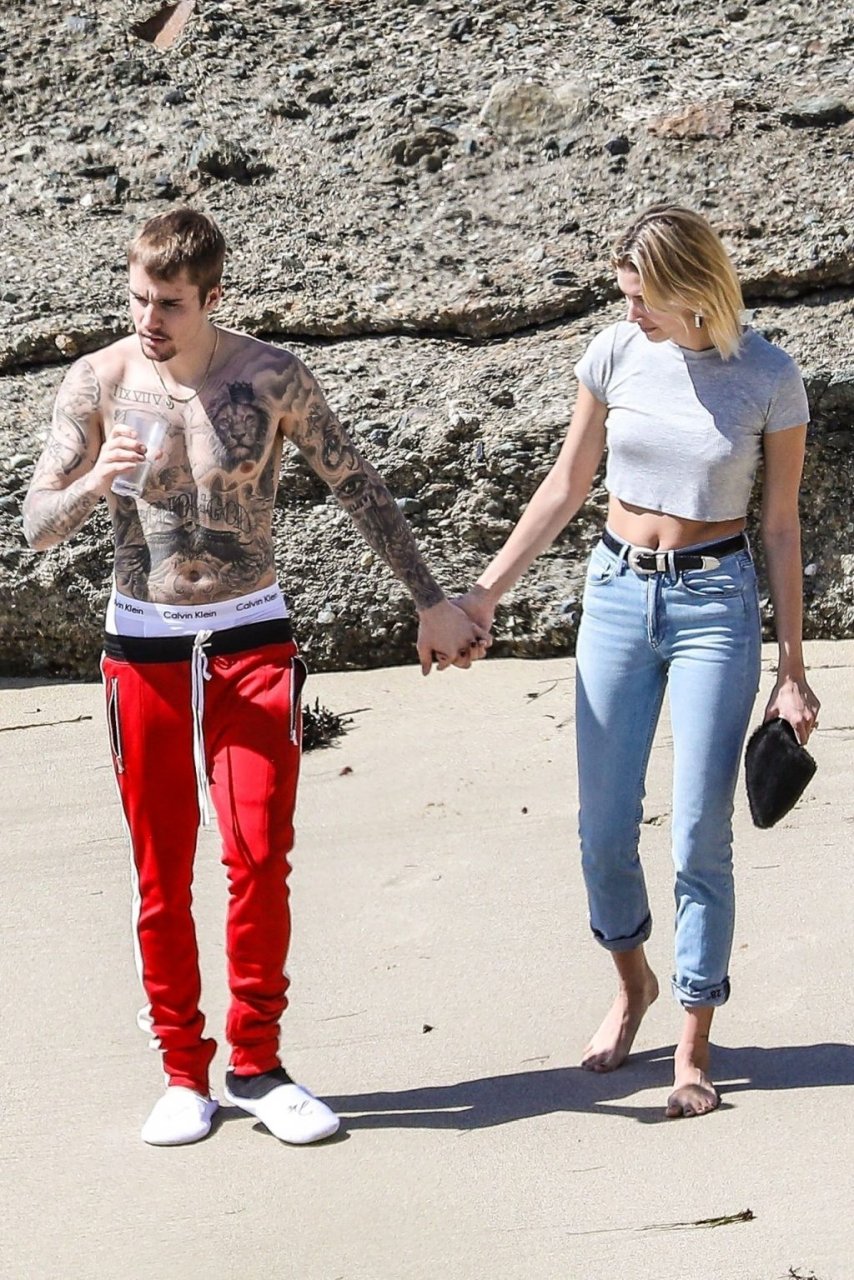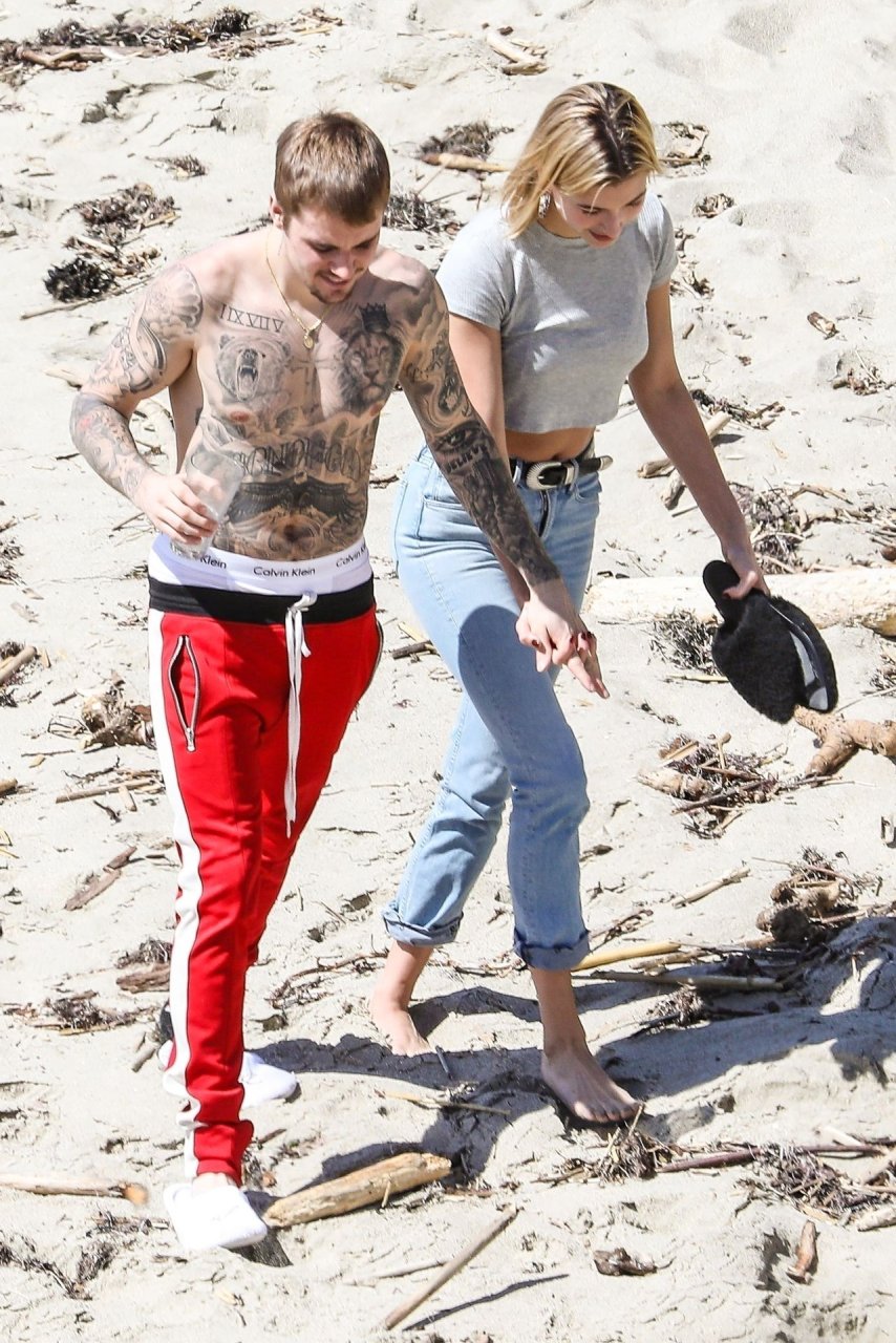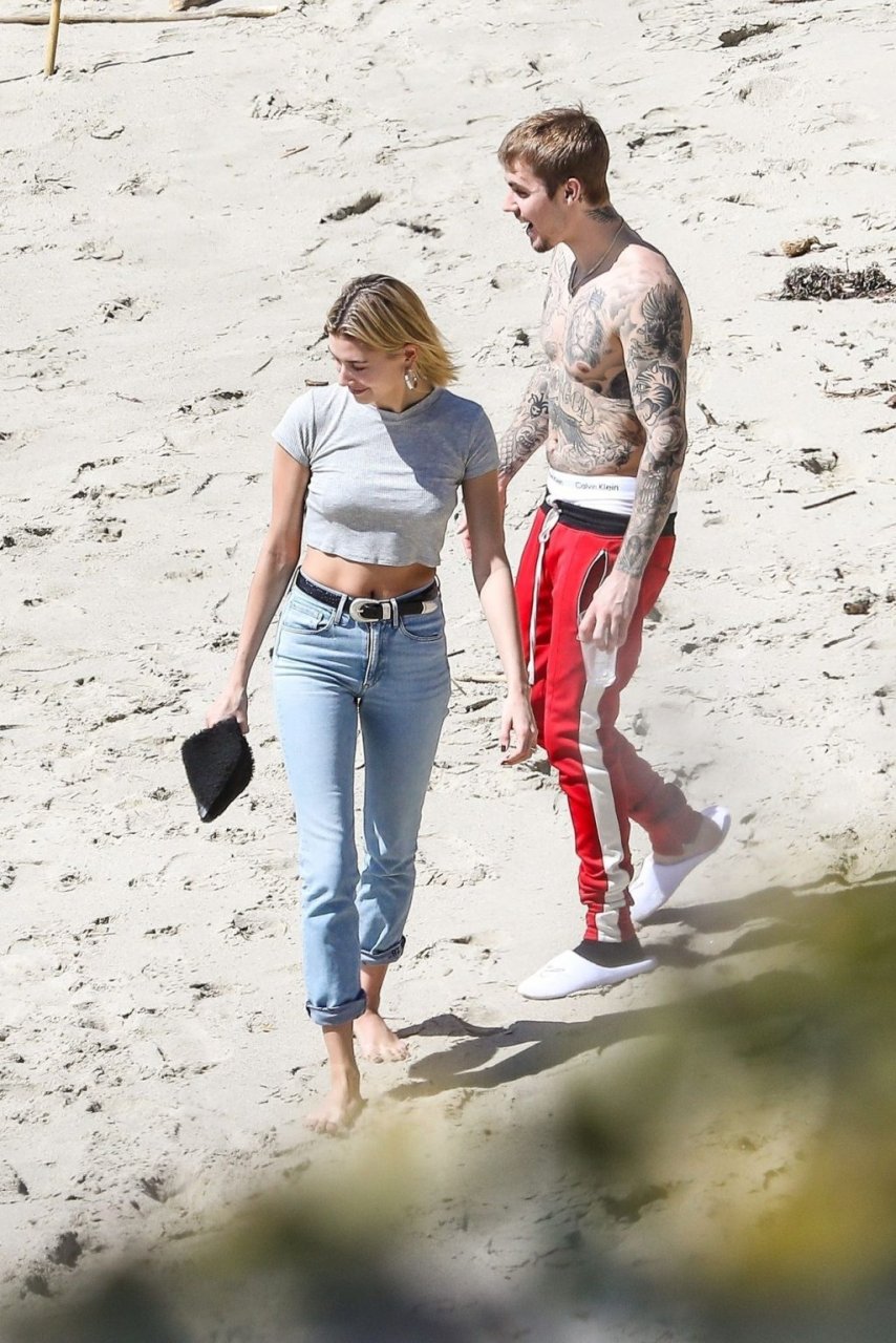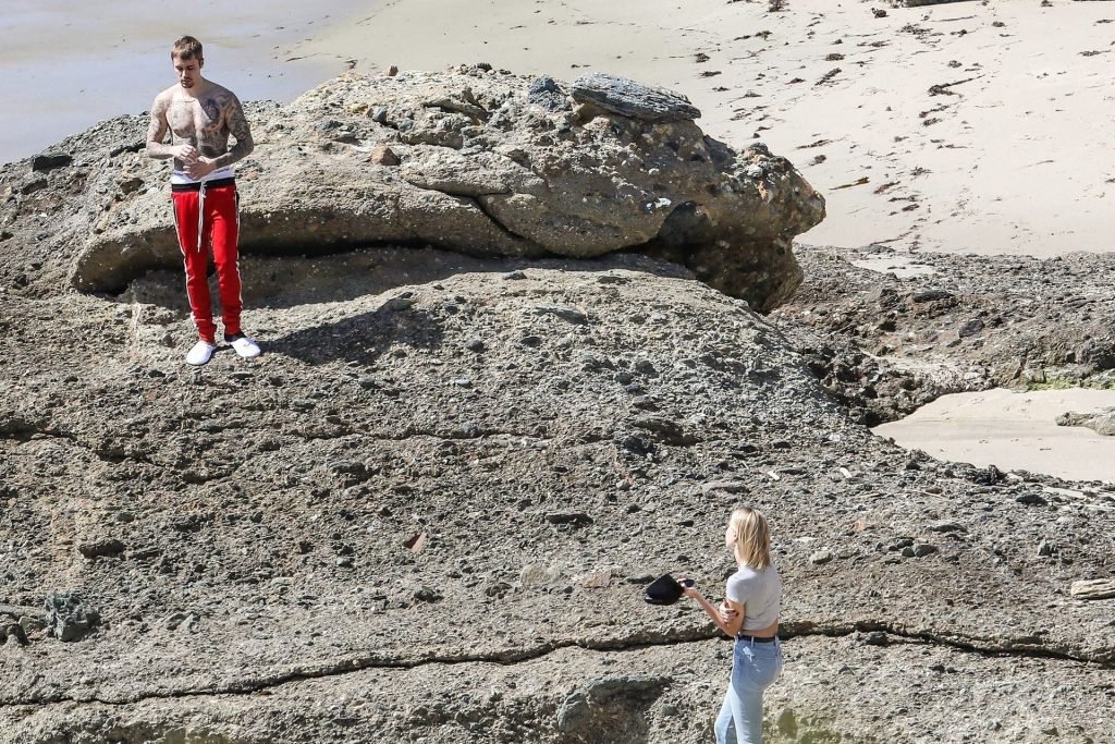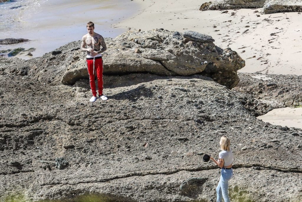 A dupla faz uma caminhada romântica pelas falésias e areia antes de encontrar fãs, que cumprimentam com sorrisos e selfies! Em um momento, Justin parece refletir enquanto está em uma pequena falésia olhando para as ondas quebrando, com a cabeça baixa. JB estava sem camisa durante toda a caminhada; enquanto isso, sua esposa Hailey usava um jeans claro e uma blusa cropped cinza.
