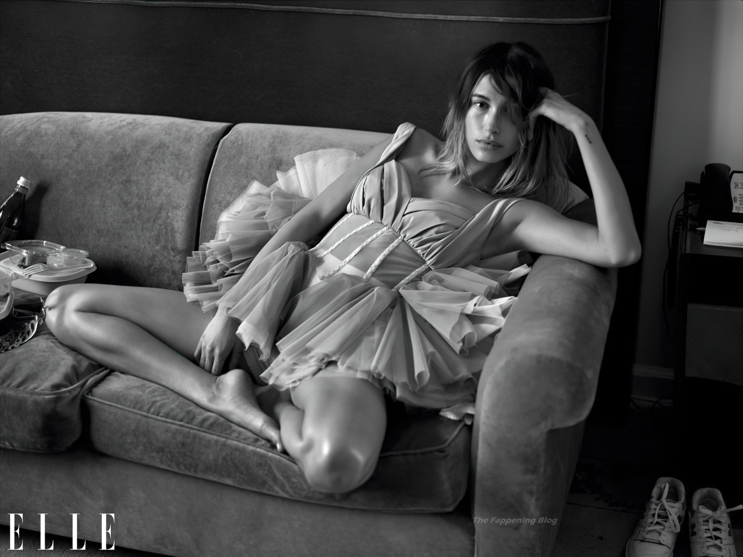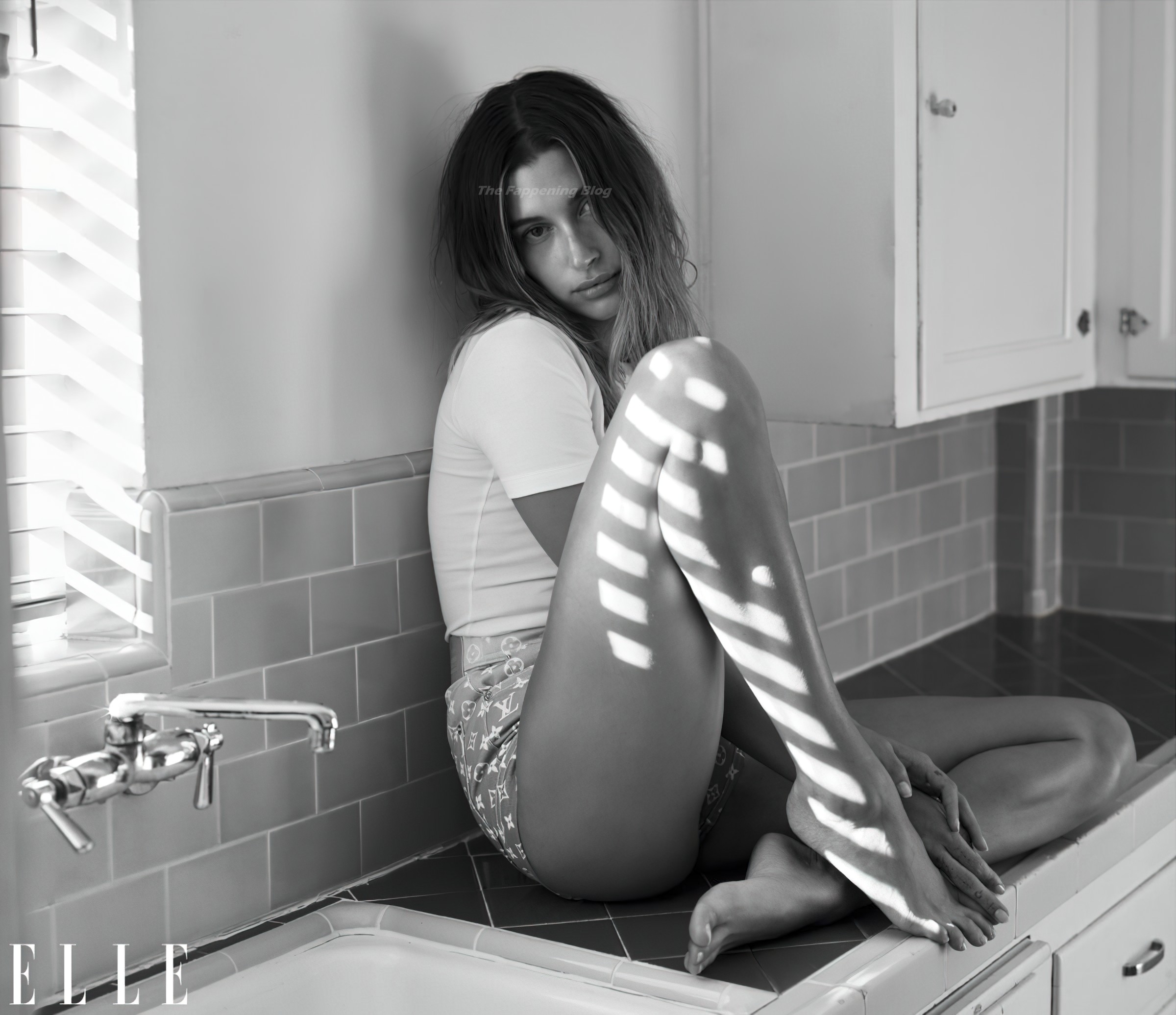A modelo americana Hailey Bieber (Baldwin) exibe suas pernas esbeltas e bela figura posando com vários biquínis e vestidos em um novo ensaio fotográfico de Mario Sorrenti para a edição de abril de 2021 da Revista Elle.