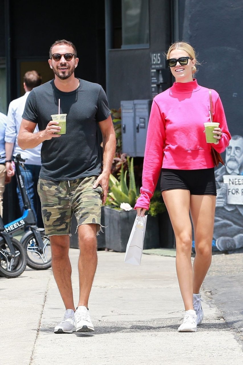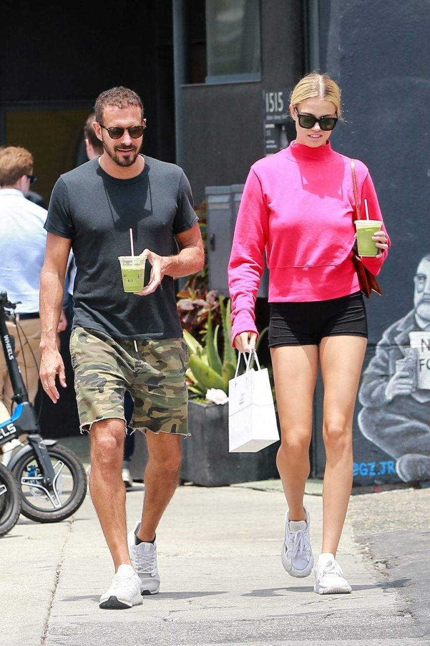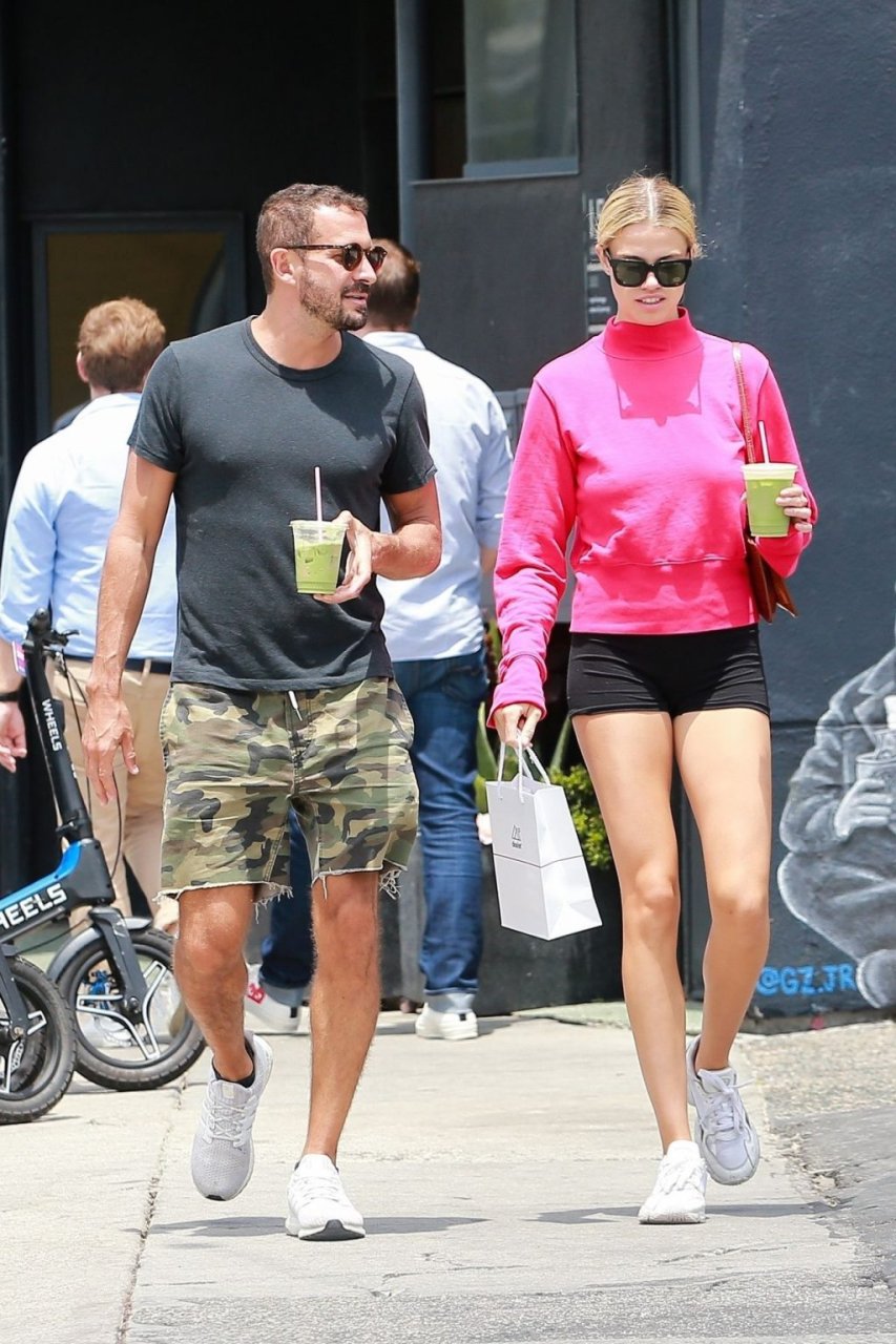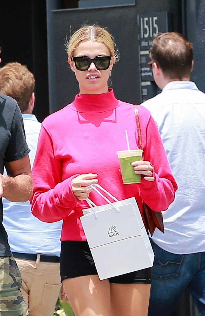 A modelo da Sports Illustrated Hailey Clauson está sorridente saindo da dispensária Dosist com uma sacola de compras e um suco verde na mão em Venice Beach, 03/07/2019.