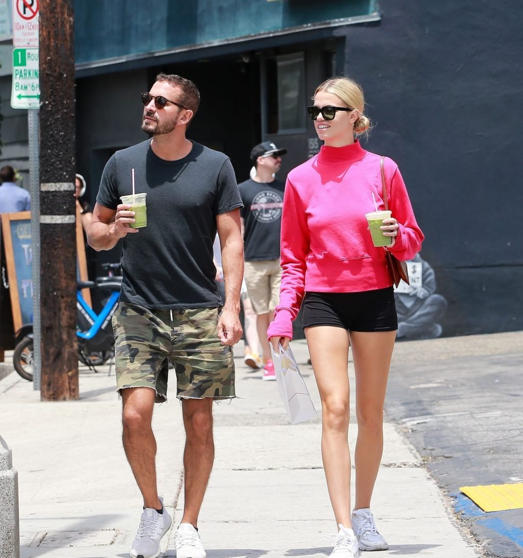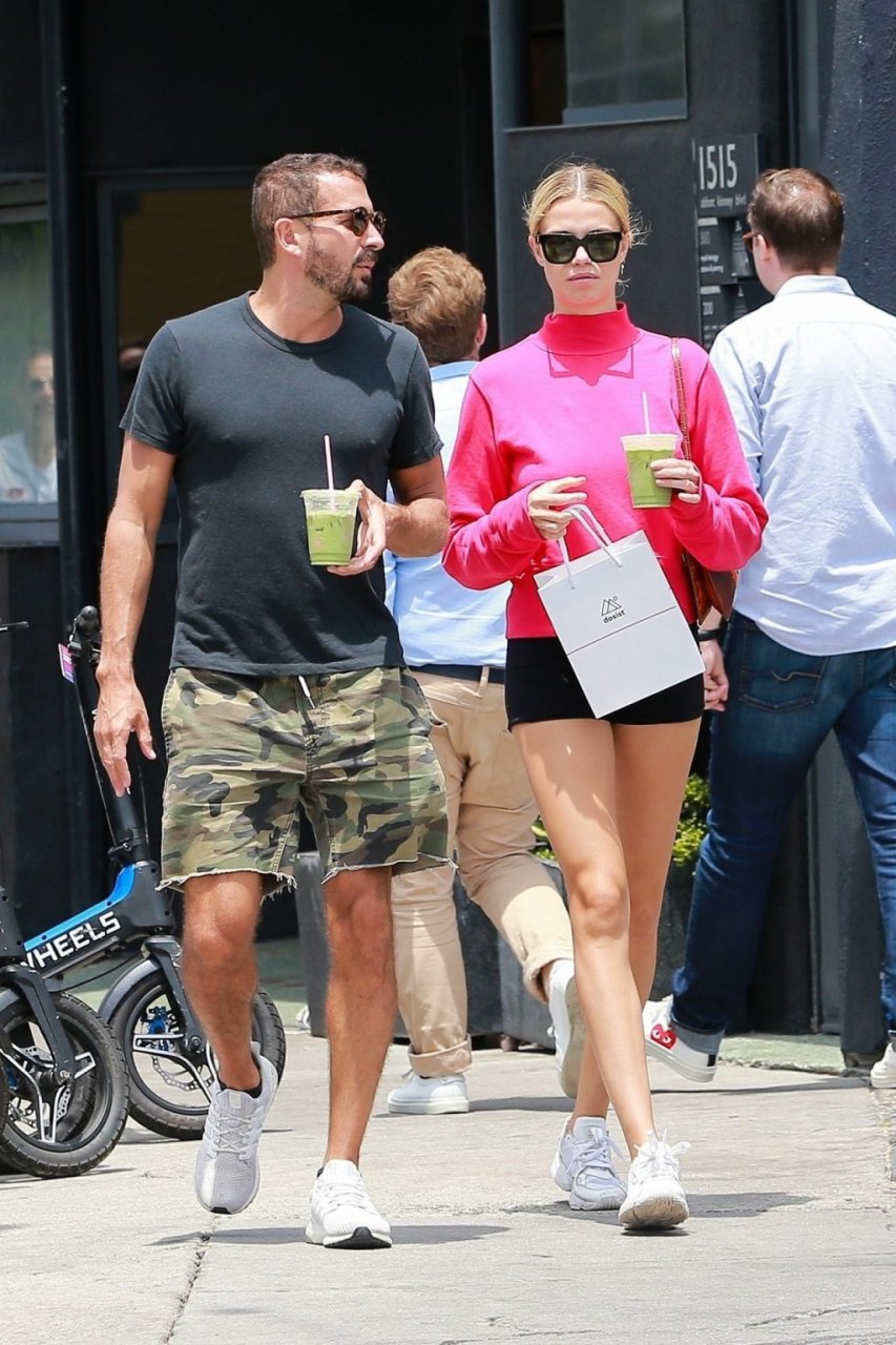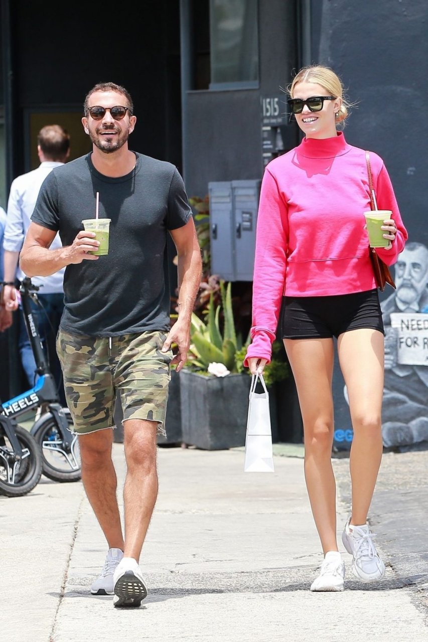 A modelo da Sports Illustrated Hailey Clauson está sorridente saindo da dispensária Dosist com uma sacola de compras e um suco verde na mão em Venice Beach, 03/07/2019.