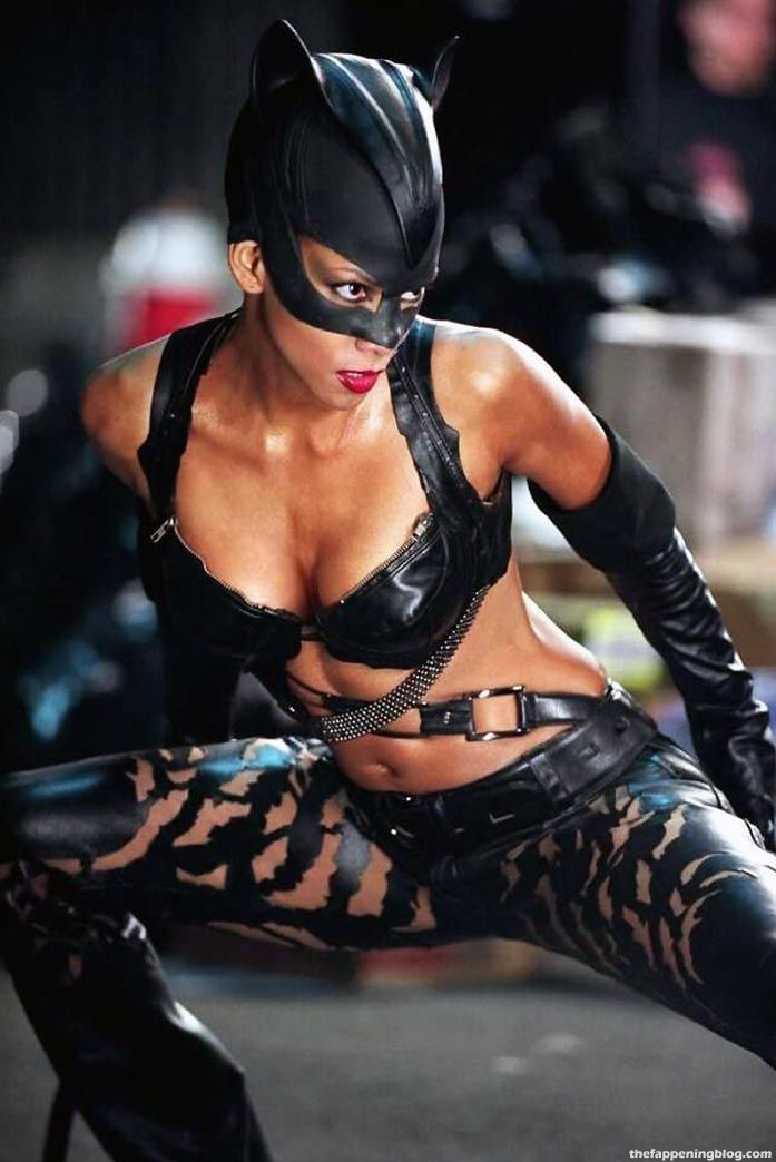 Halle Berry is sexy in tight leather pants and a top that shows lots of her cleavage. The camera is circling her while she walks across a rooftop. The scene is from the famous ‘Catwoman’ film.