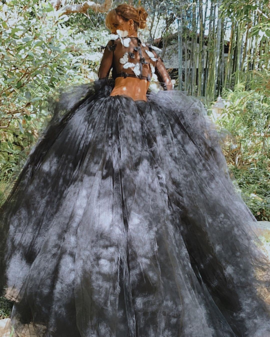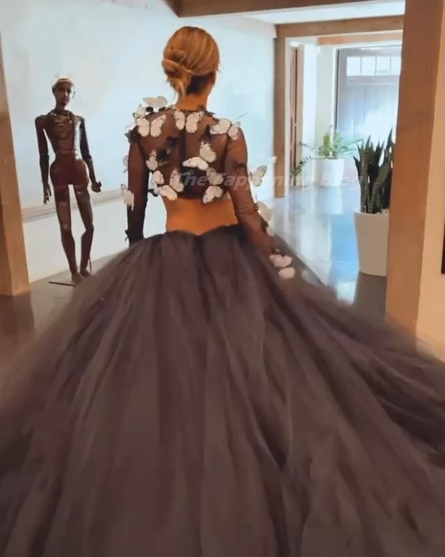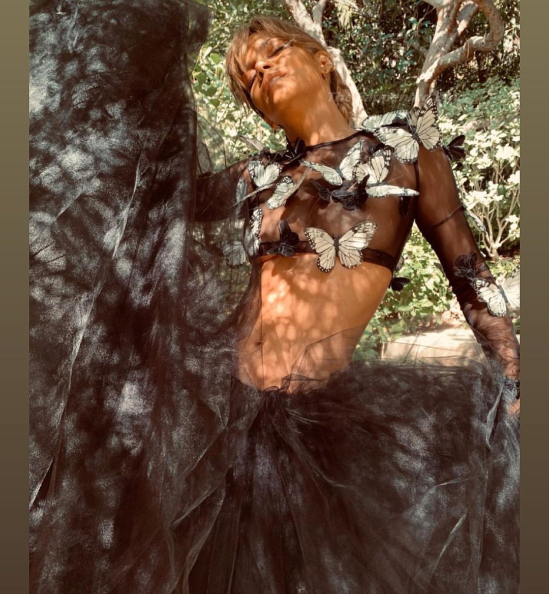A atriz mostra seus seios nus enquanto apresenta seu vestido de Christian Siriano em um novo ensaio fotográfico nas redes sociais (março de 2021).