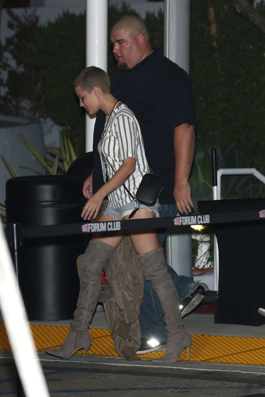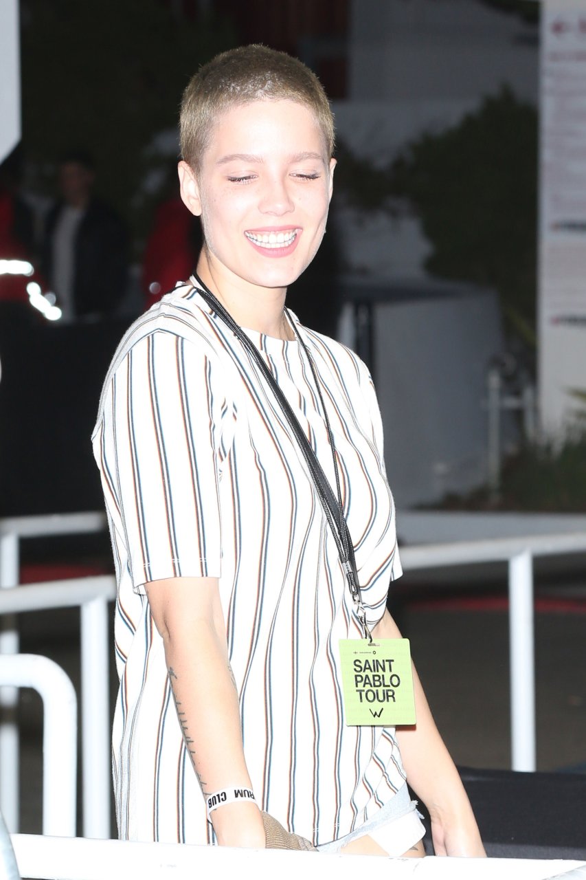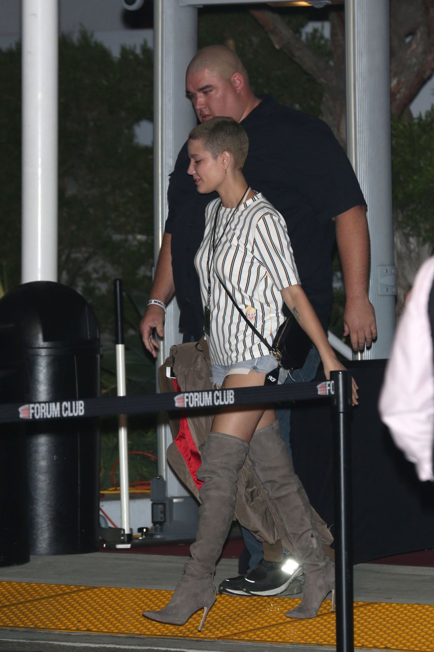 Halsey usa shorts rasgados e aproveita uma noite no Saint Pablo Tour de Kanye West no The Forum em Inglewood, 01/11/2016. Ashley Nicolette Frangipane, também conhecida como Halsey, é uma cantora e compositora americana. Idade: 22 (29 de setembro de 1994).