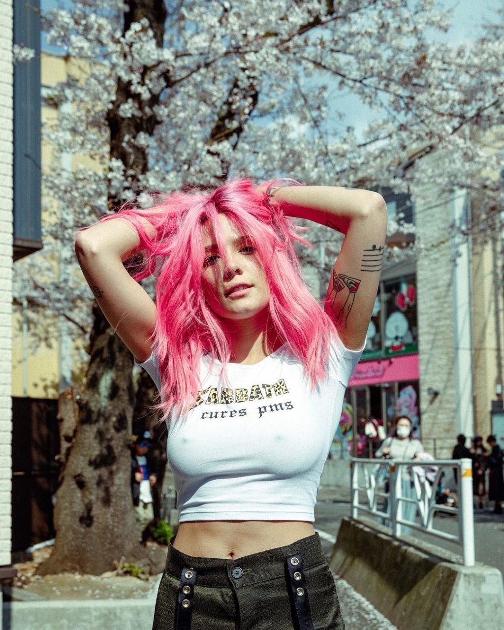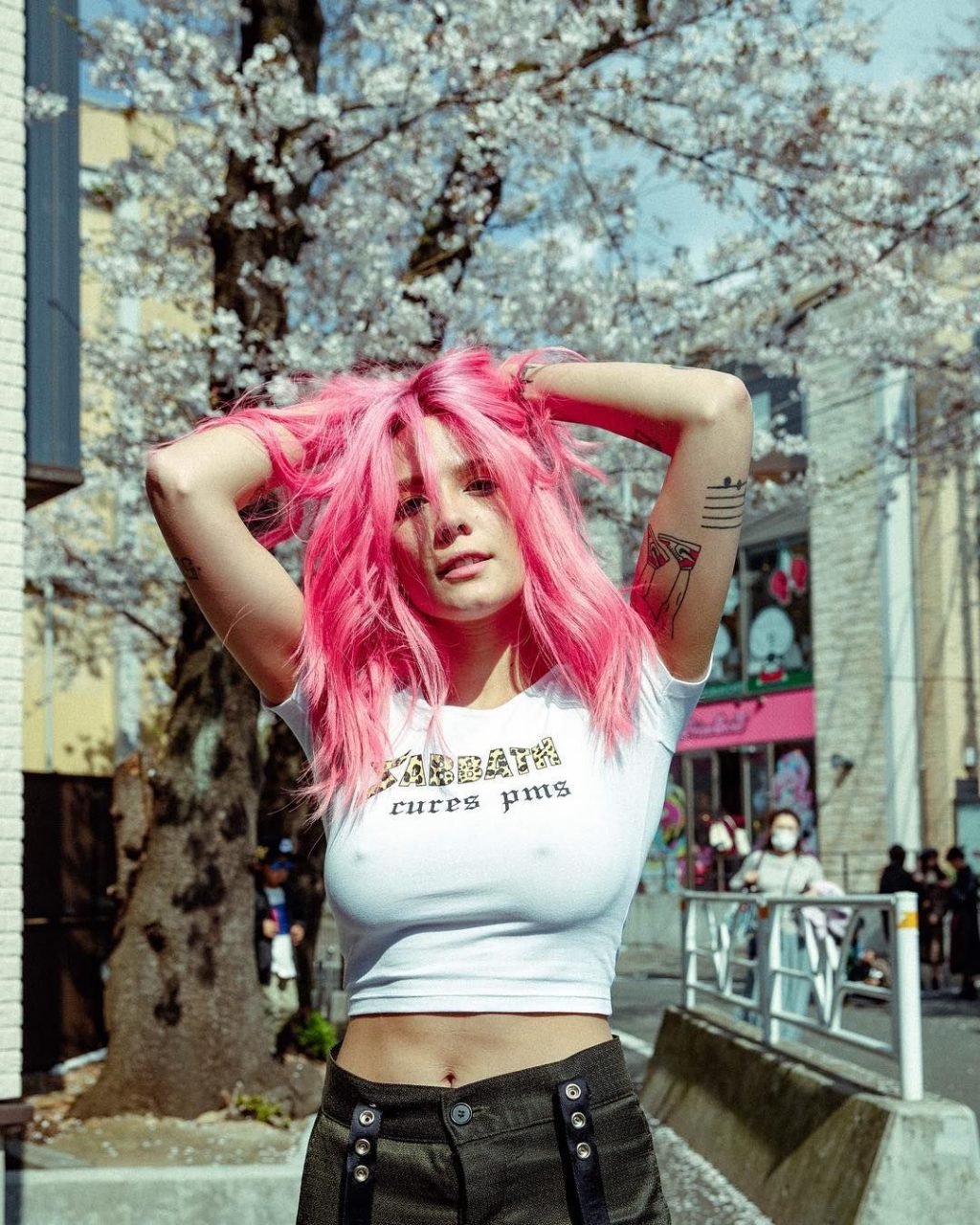 Sakura baby, a cantora Halsey exibe seus seios usando uma camiseta branca justa “Sabbath cures pms” em um ensaio fotográfico em Tóquio, Japão, 31/03/2019.