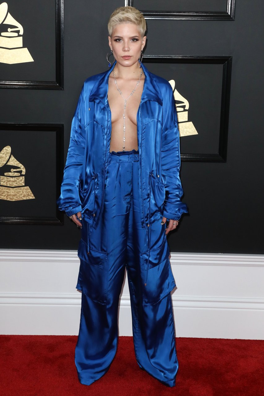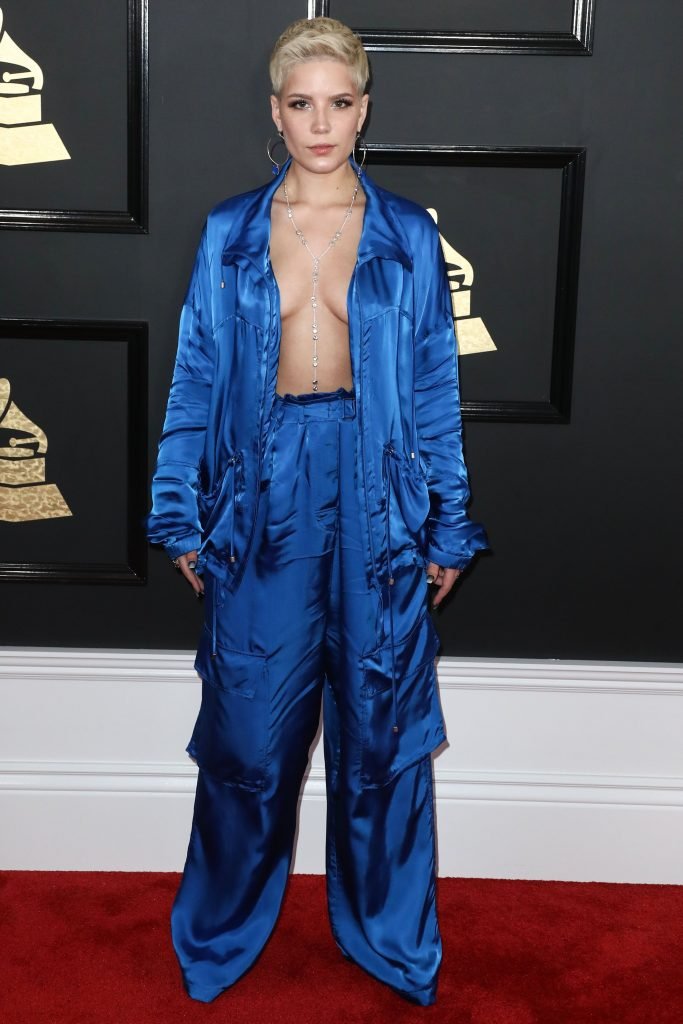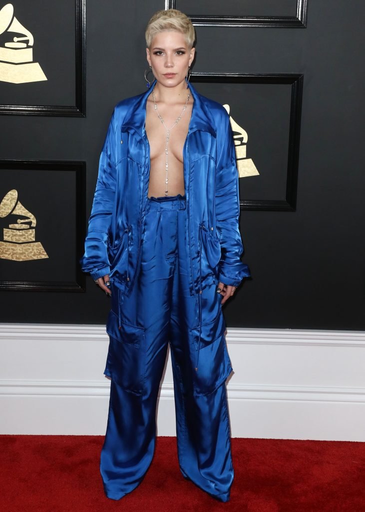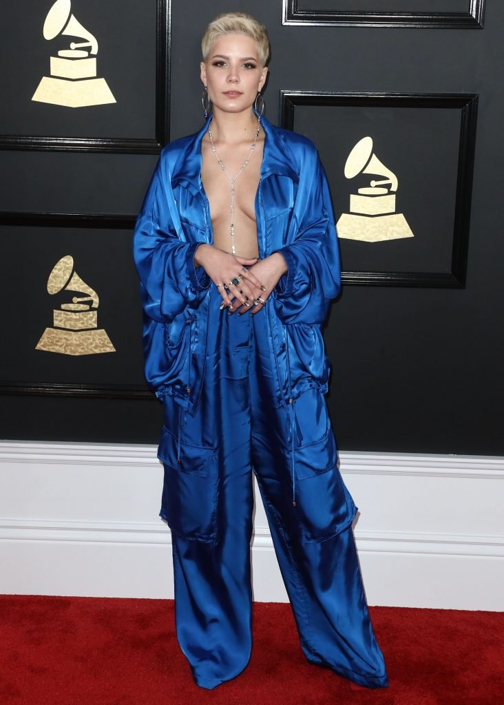 A cantora Halsey usa uma roupa azul no 59º Annual GRAMMY Awards em Los Angeles, 12/02/2017. Ashley Nicolette Frangipane (ou simplesmente Halsey) é uma cantora e compositora americana. Idade – 22 (29 de setembro de 1994).