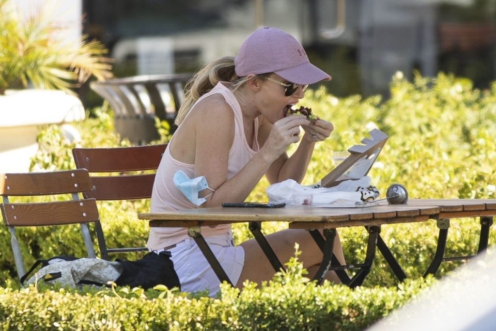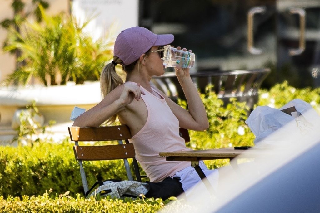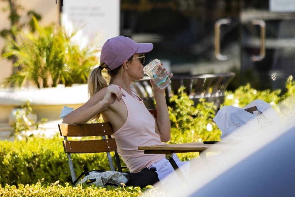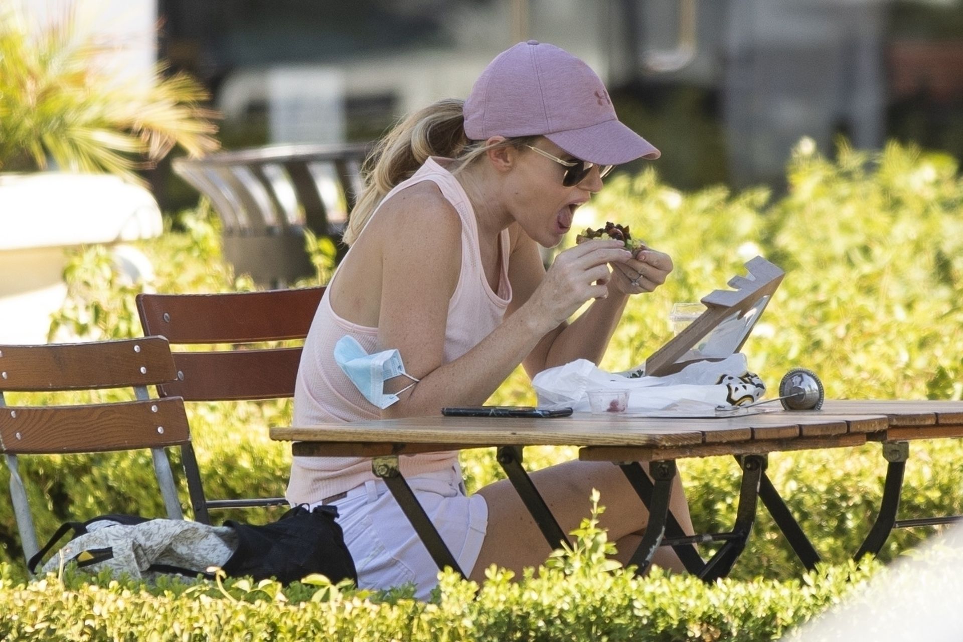 David Hasselhoff’s esposa Hayley Roberts é vista se deliciando com uma torrada de abacate sem sutiã em Calabasas, 10/04/2020.