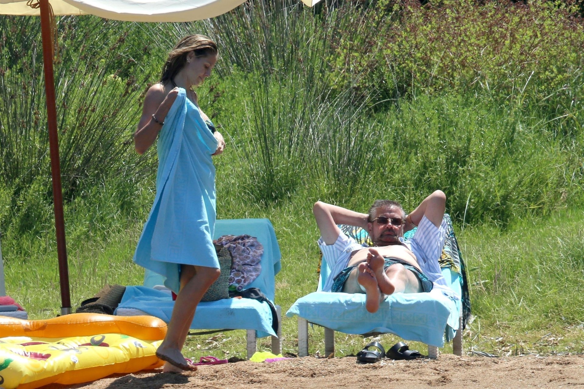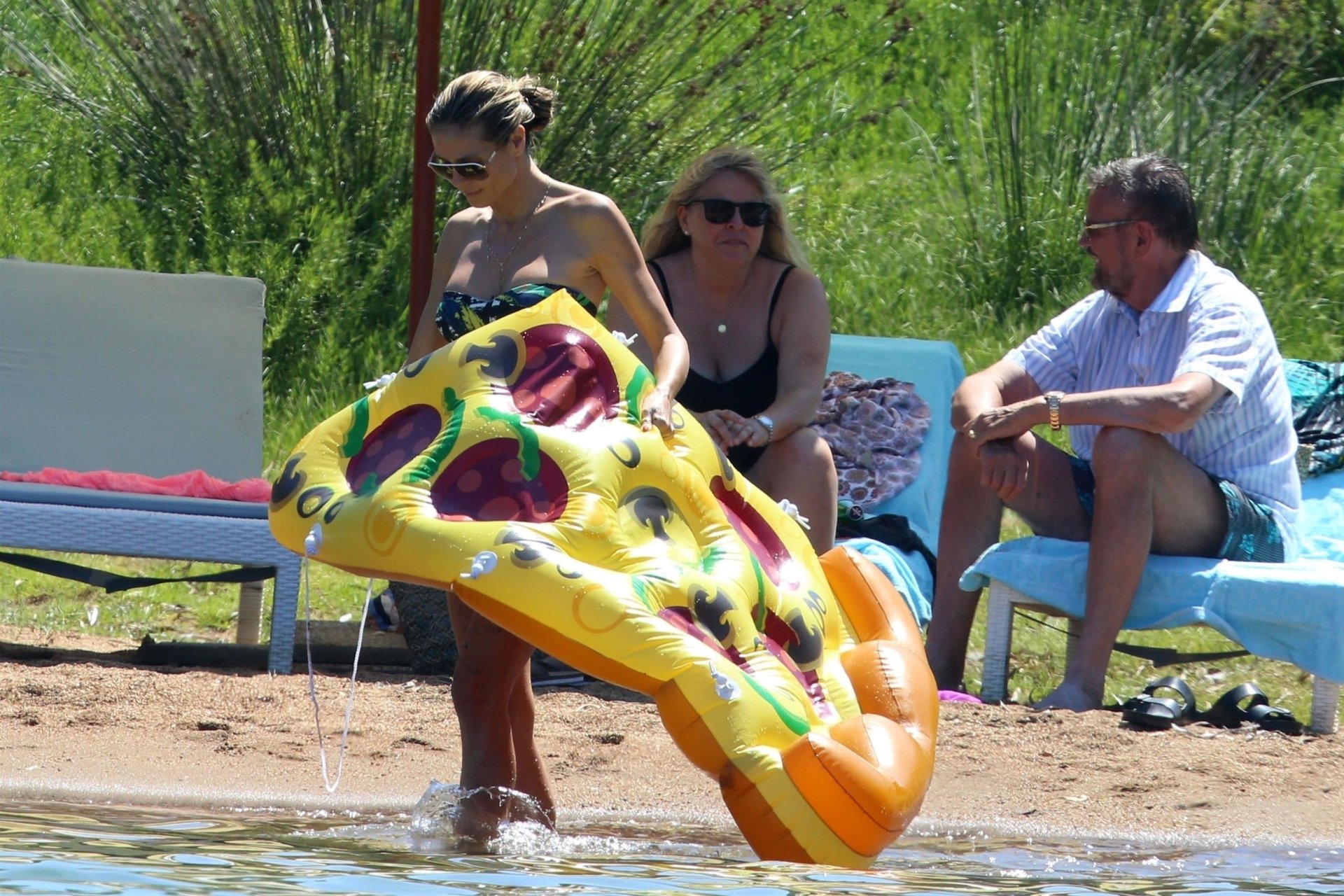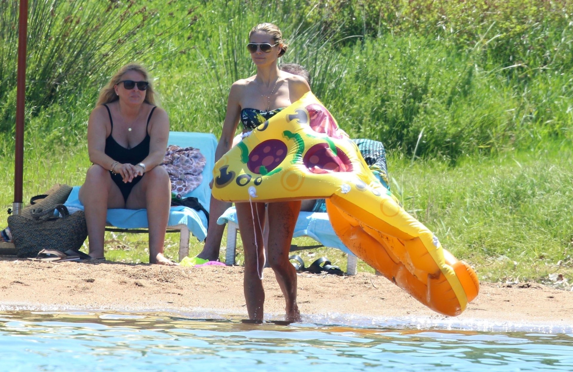 Heidi, junto com seus pais e filhos, aproveitou um dia na praia arrastando um enorme inflável em forma de pizza enquanto descansava ao sol quente.