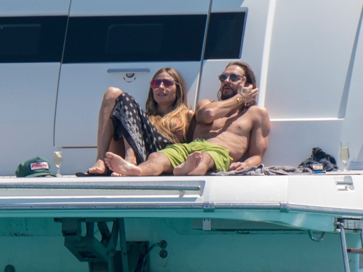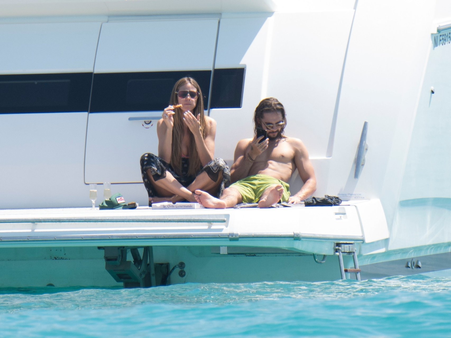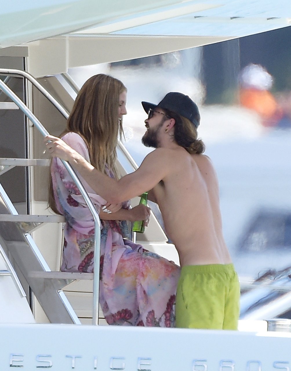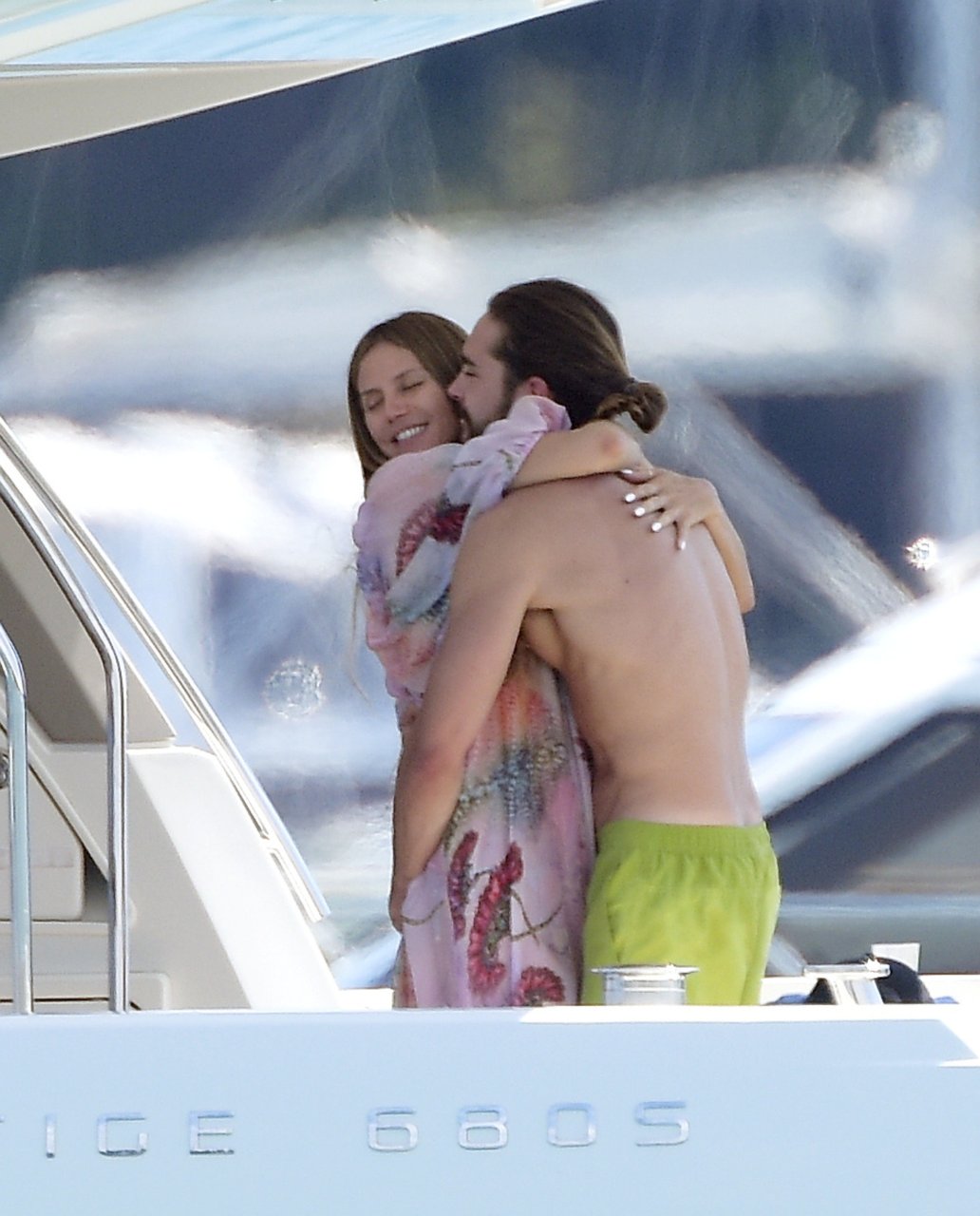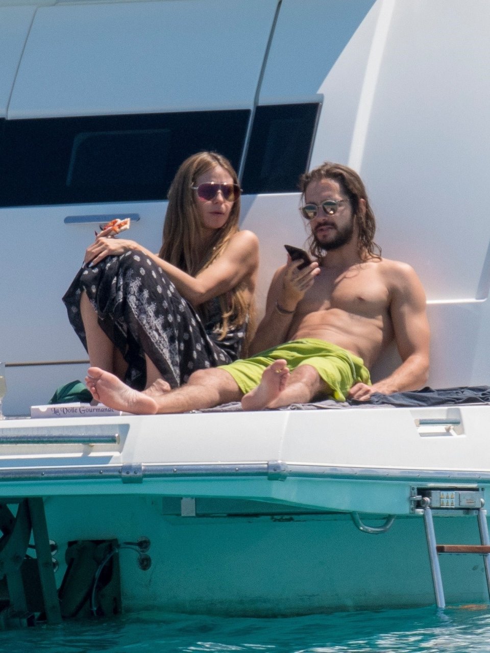 Supermodelo alemã e personalidade da TV Heidi Klum, 44, e seu novo namorado Tom Kaulitz pedem pizza em um barco em Cannes, 19/05/2018. O casal apaixonado se beijou enquanto descansava ao sol.