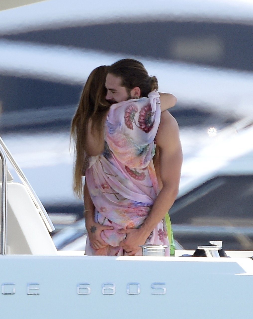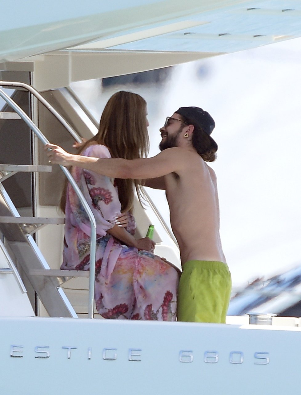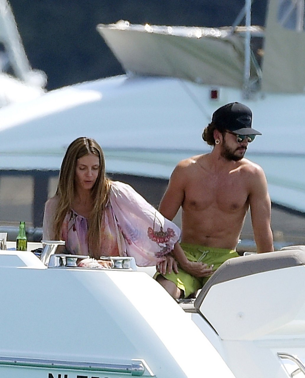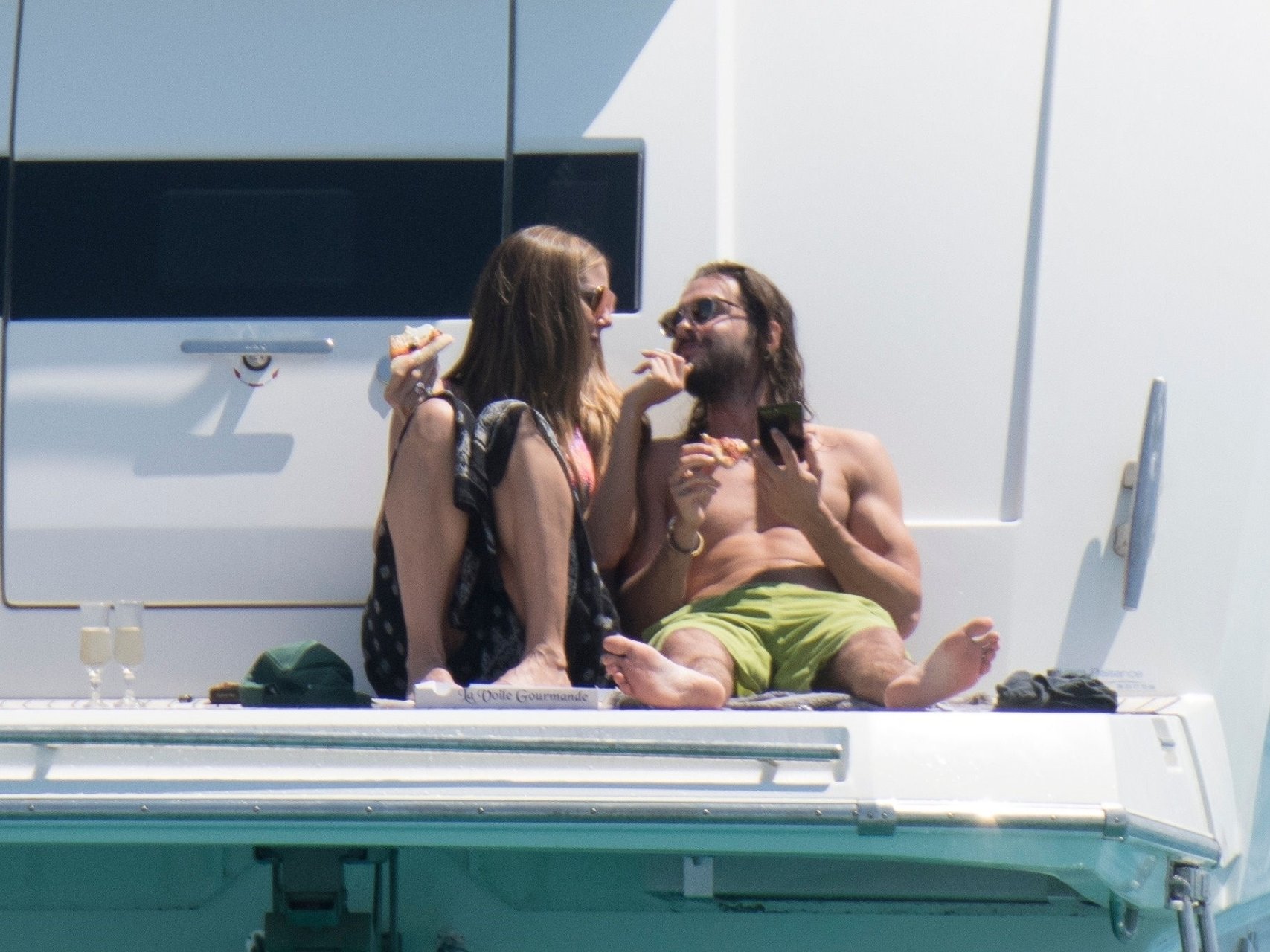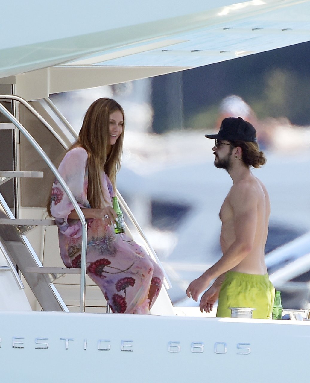 Supermodelo alemã e personalidade da TV Heidi Klum, 44, e seu novo namorado Tom Kaulitz pedem pizza em um barco em Cannes, 19/05/2018. O casal apaixonado se beijou enquanto descansava ao sol.
