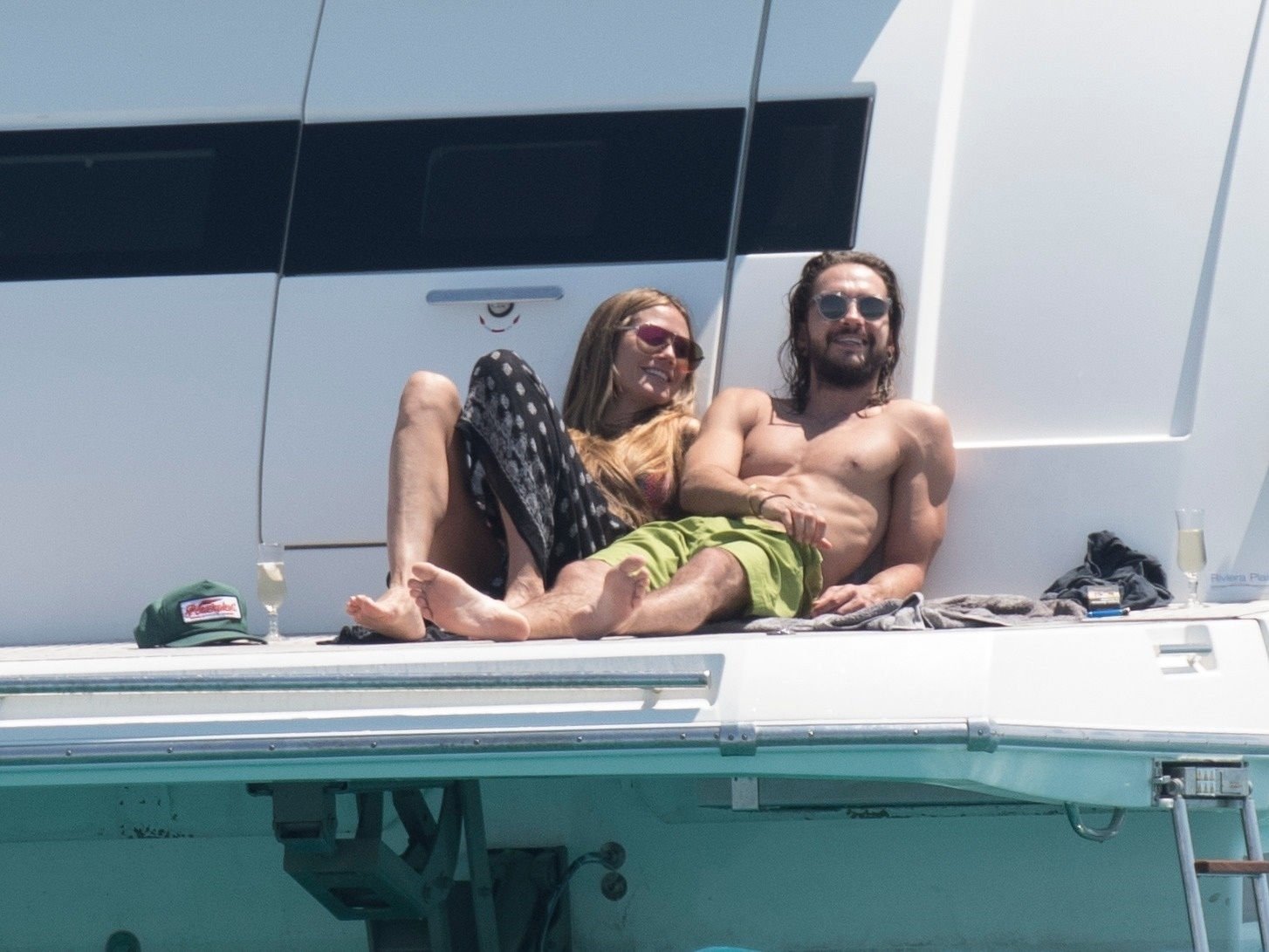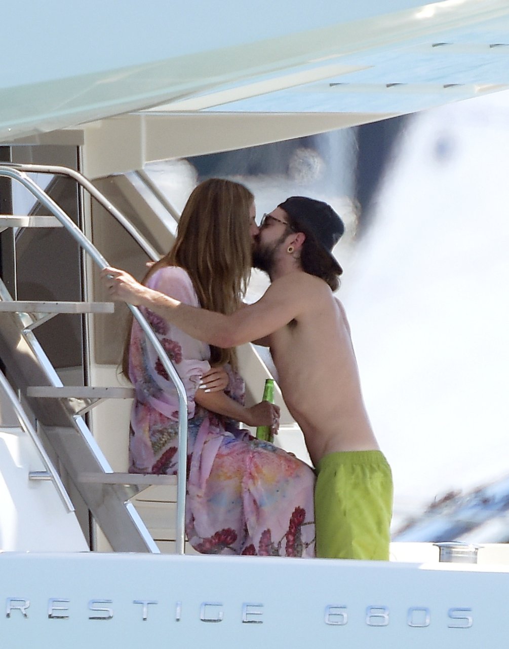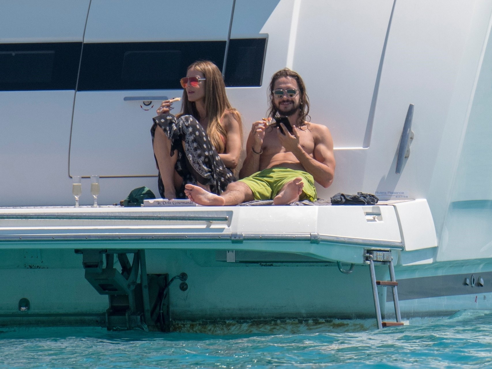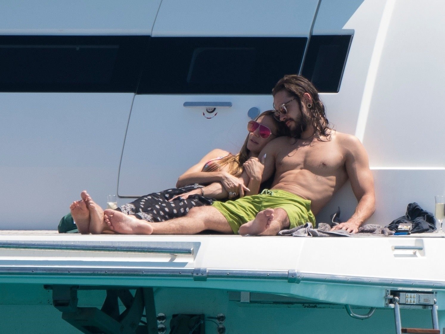 Supermodelo alemã e personalidade da TV Heidi Klum, 44, e seu novo namorado Tom Kaulitz pedem pizza em um barco em Cannes, 19/05/2018. O casal apaixonado se beijou enquanto descansava ao sol.