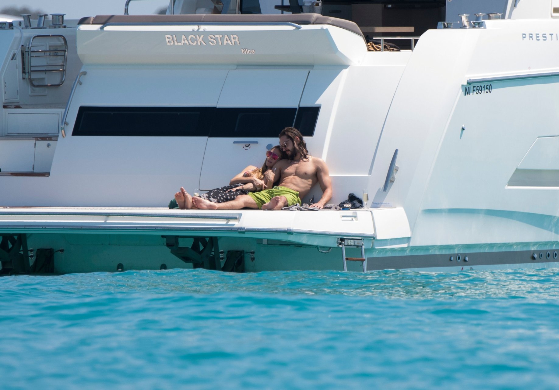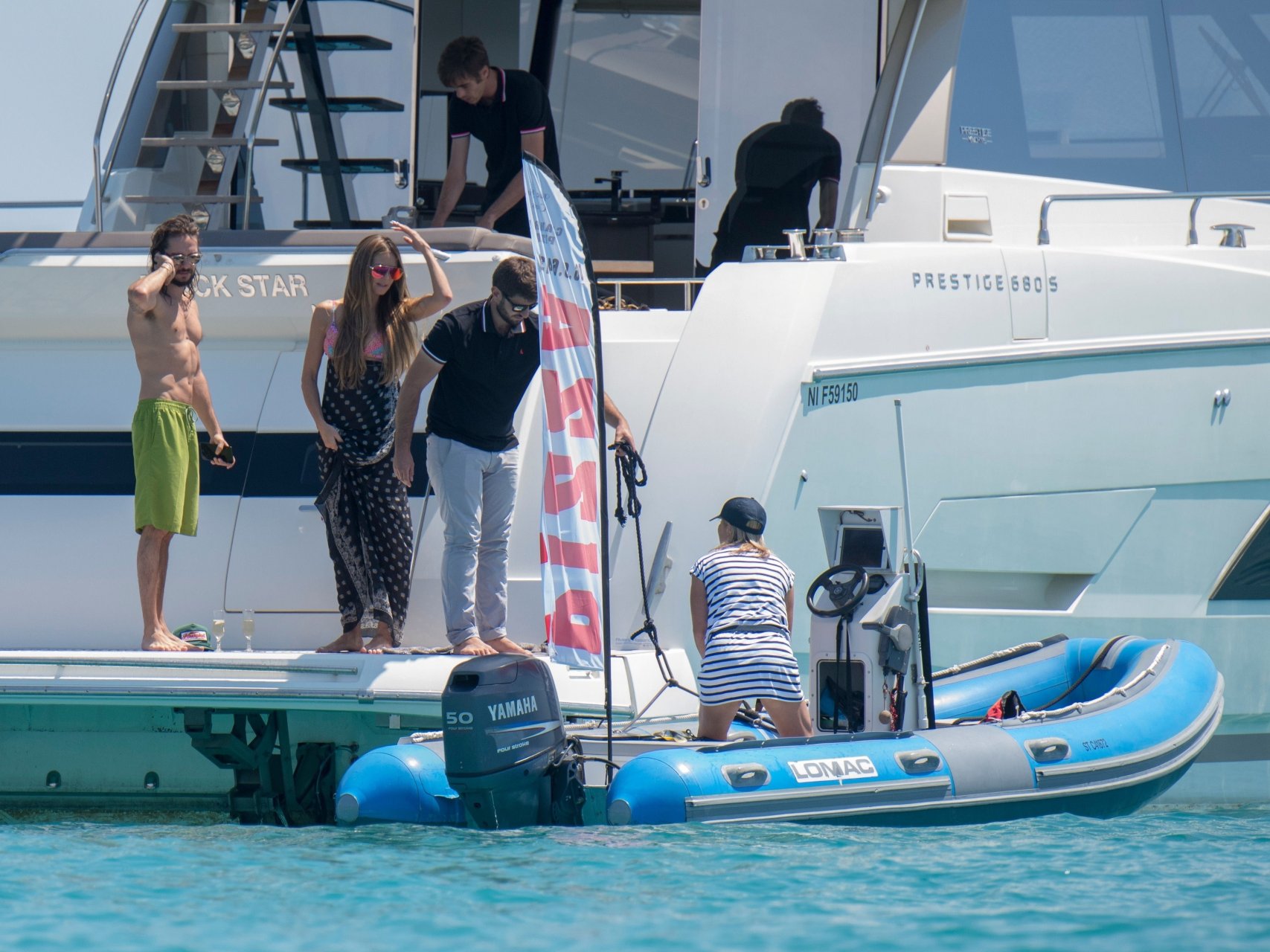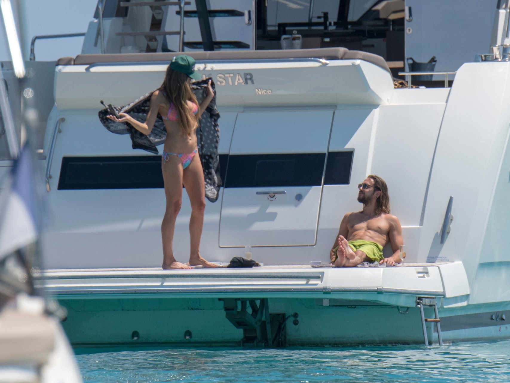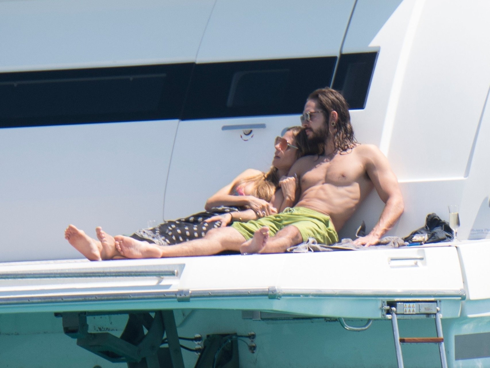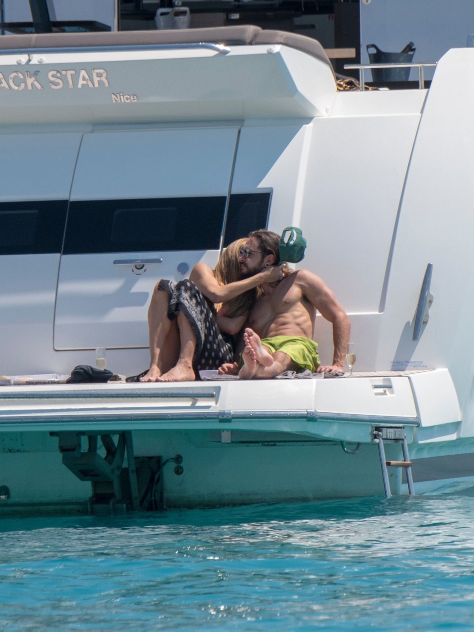 Supermodelo alemã e personalidade da TV Heidi Klum, 44, e seu novo namorado Tom Kaulitz pedem pizza em um barco em Cannes, 19/05/2018. O casal apaixonado se beijou enquanto descansava ao sol.
