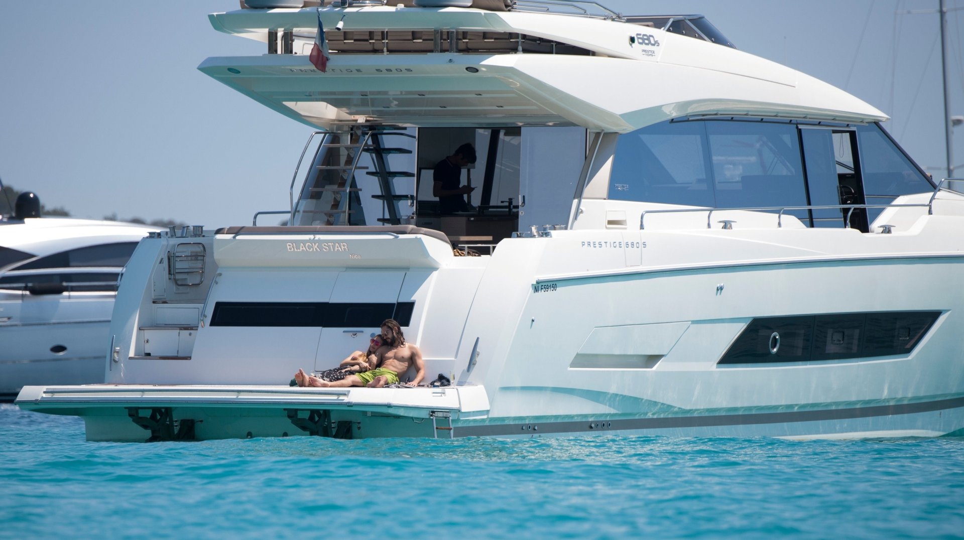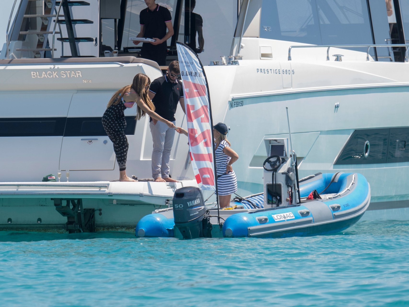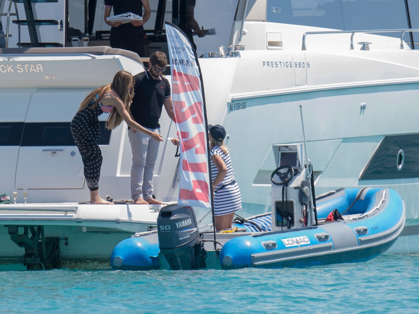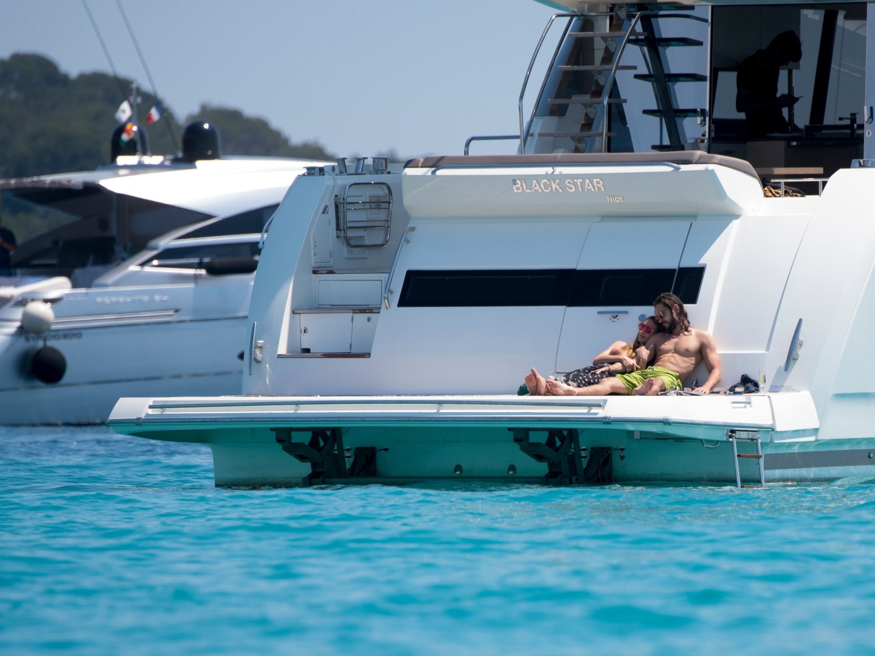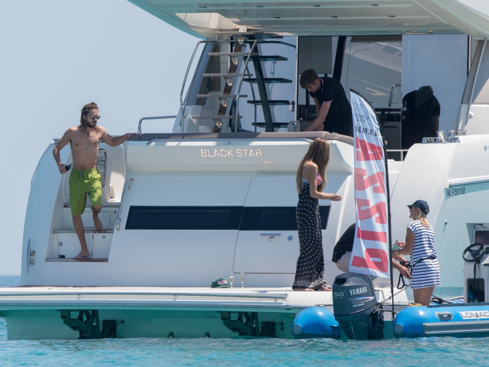 Supermodelo alemã e personalidade da TV Heidi Klum, 44, e seu novo namorado Tom Kaulitz pedem pizza em um barco em Cannes, 19/05/2018. O casal apaixonado se beijou enquanto descansava ao sol.