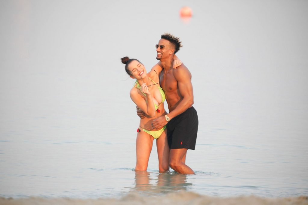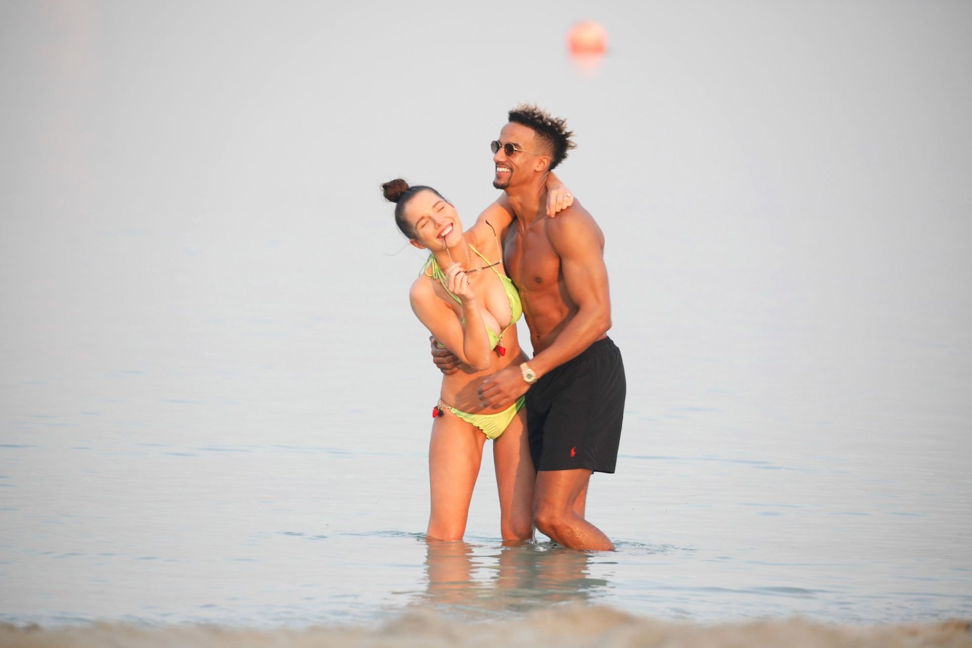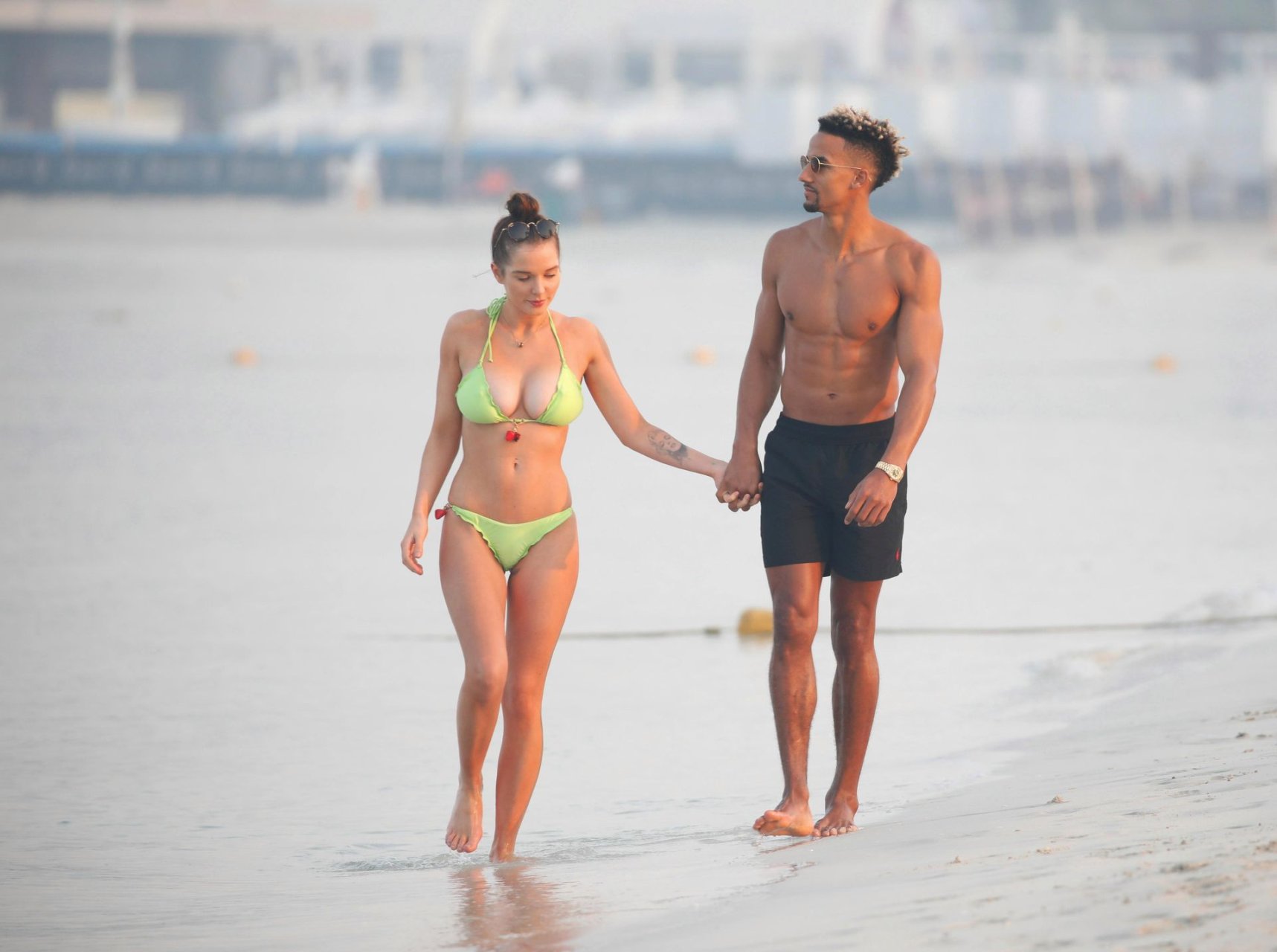 Atriz/Modelo/Estrela de TV Helen Flanagan (28) exibe seu corpo deslumbrante usando um biquíni verde enquanto passeia na praia em Dubai, 01/05/2019.