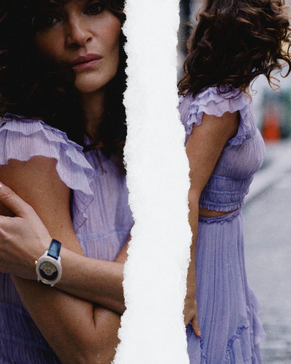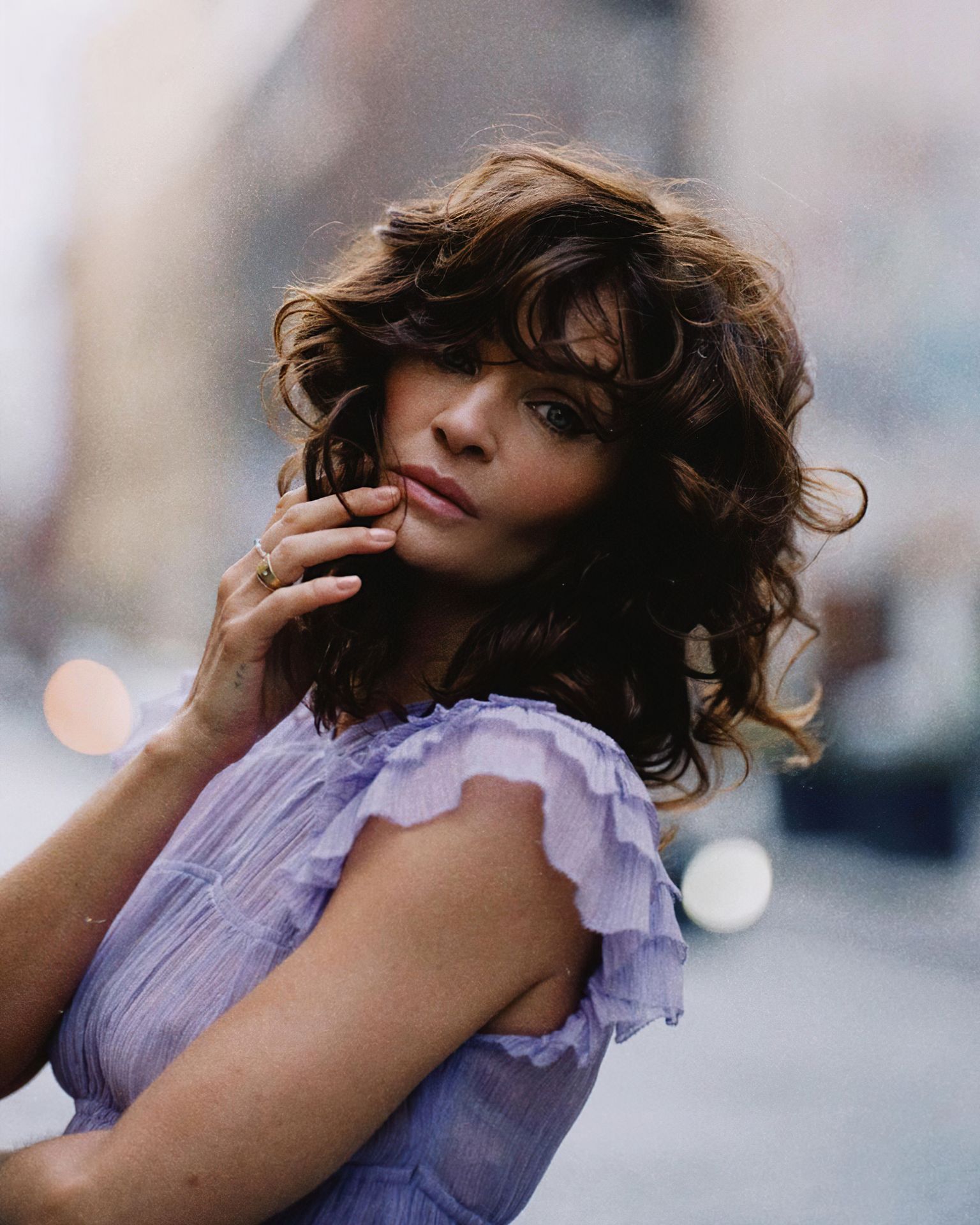 A supermodelo dinamarquesa Helena Christensen mostra seus seios posando com um vestido roxo na rua em um ensaio fotográfico de Kat Irlin – Instagram, 13/07/2020.