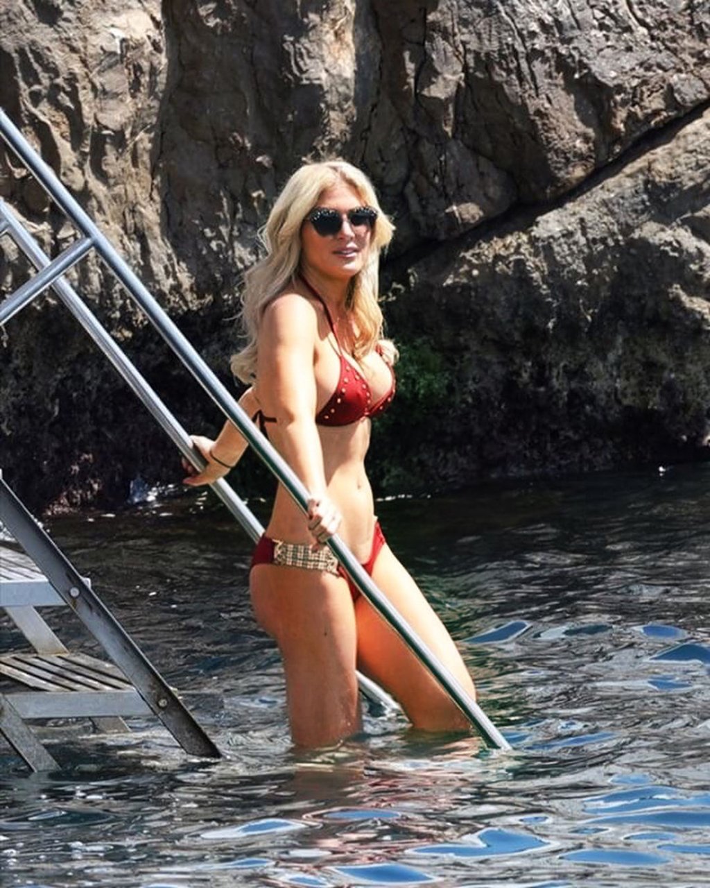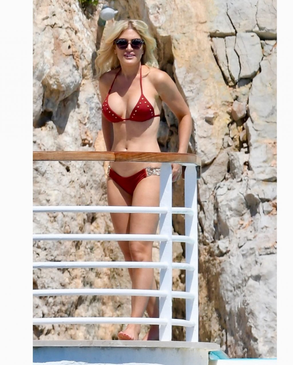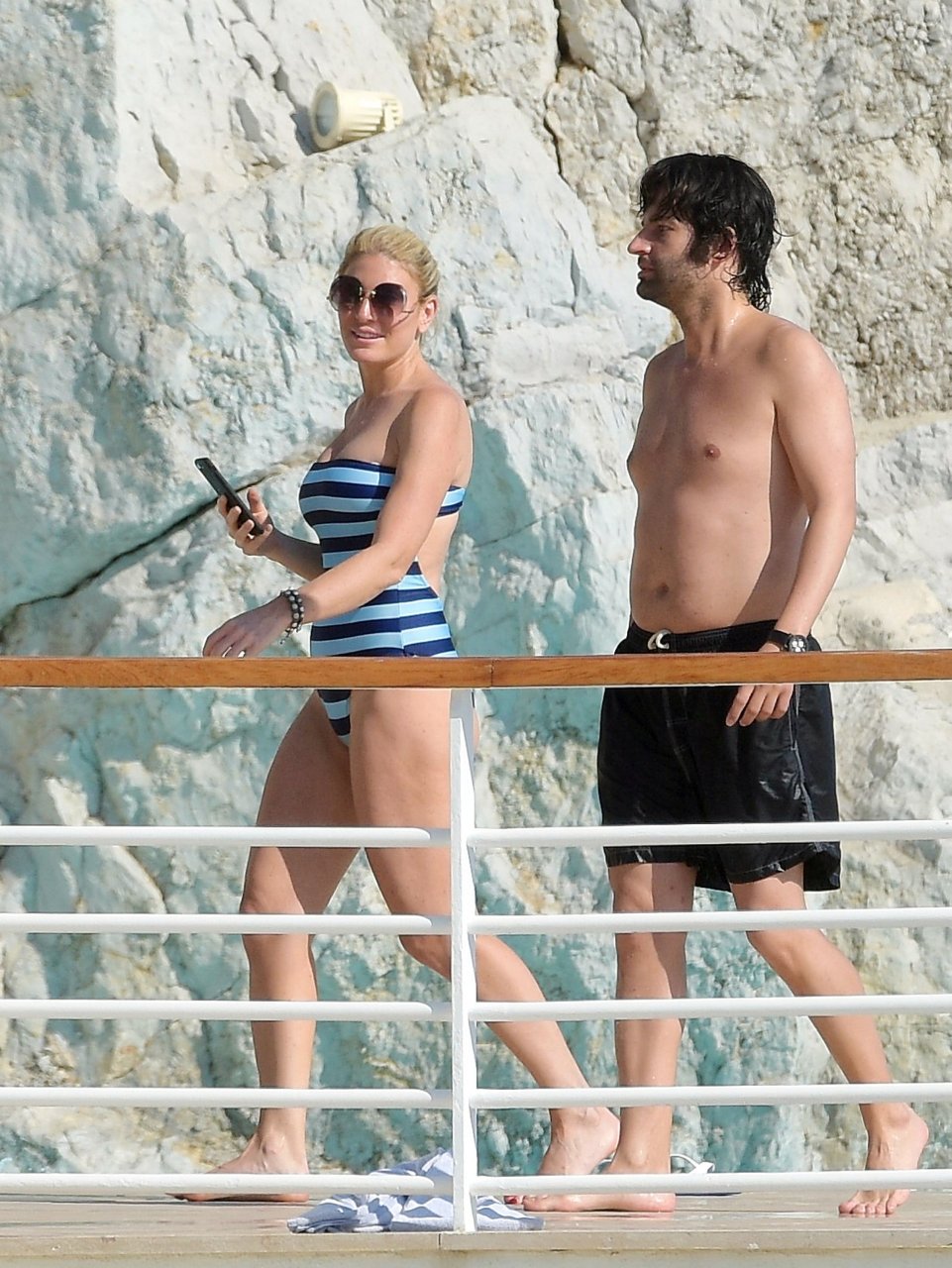 Hofit Golan exibe seus atributos muito generosos em maiô listrado decotado enquanto aproveitava umas férias de luxo no Hotel Eden Roc em Antibes. 21/07/2018.