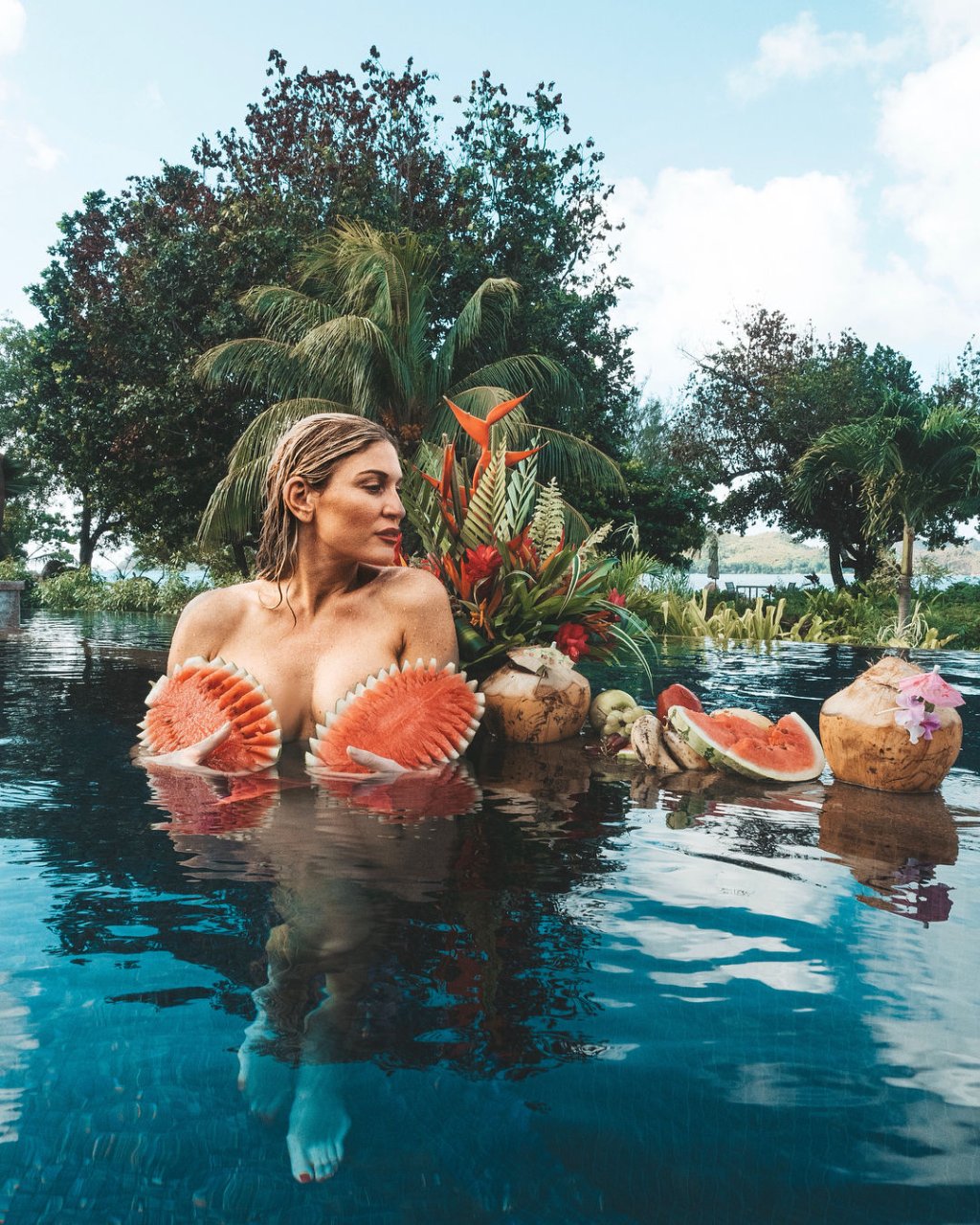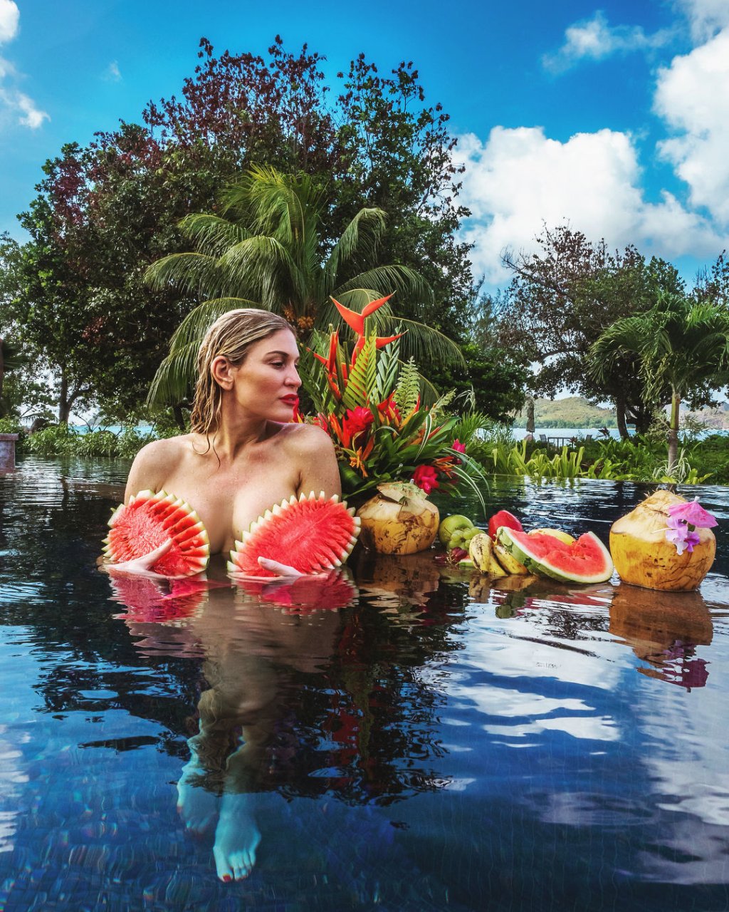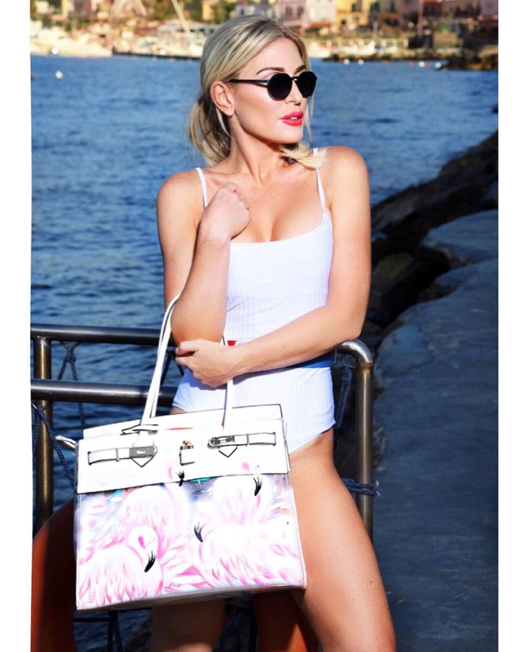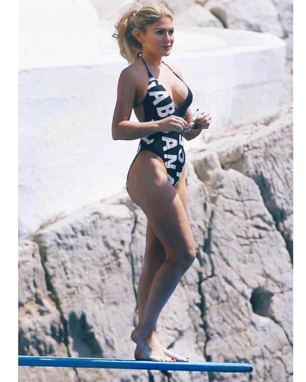 Hofit Golan exibe seus atributos muito generosos em maiô listrado decotado enquanto aproveitava umas férias de luxo no Hotel Eden Roc em Antibes. 21/07/2018.
