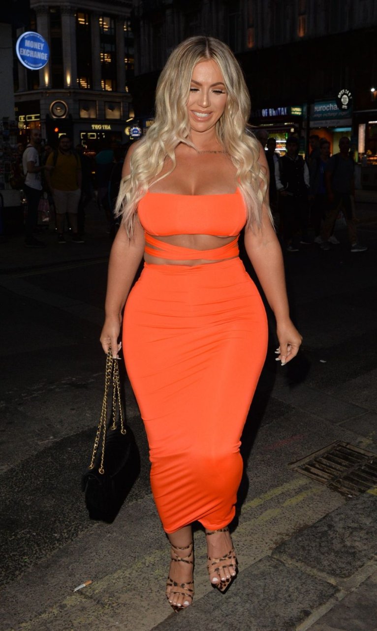 Holly Hagan exibe suas curvas em laranja neon ao sair da boate Opium em Londres após comemorar o encerramento do Celebs Go Dating, 08/07/2019.