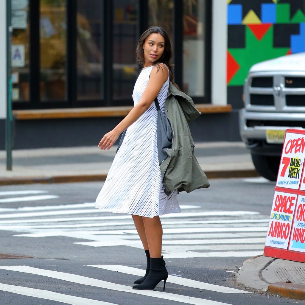 A atriz etíope-americana Ilfenesh Hadera gira sem sutiã em um vestido branco para uma sessão de fotos em SoHo, na cidade de Nova York, 01/05/2021.